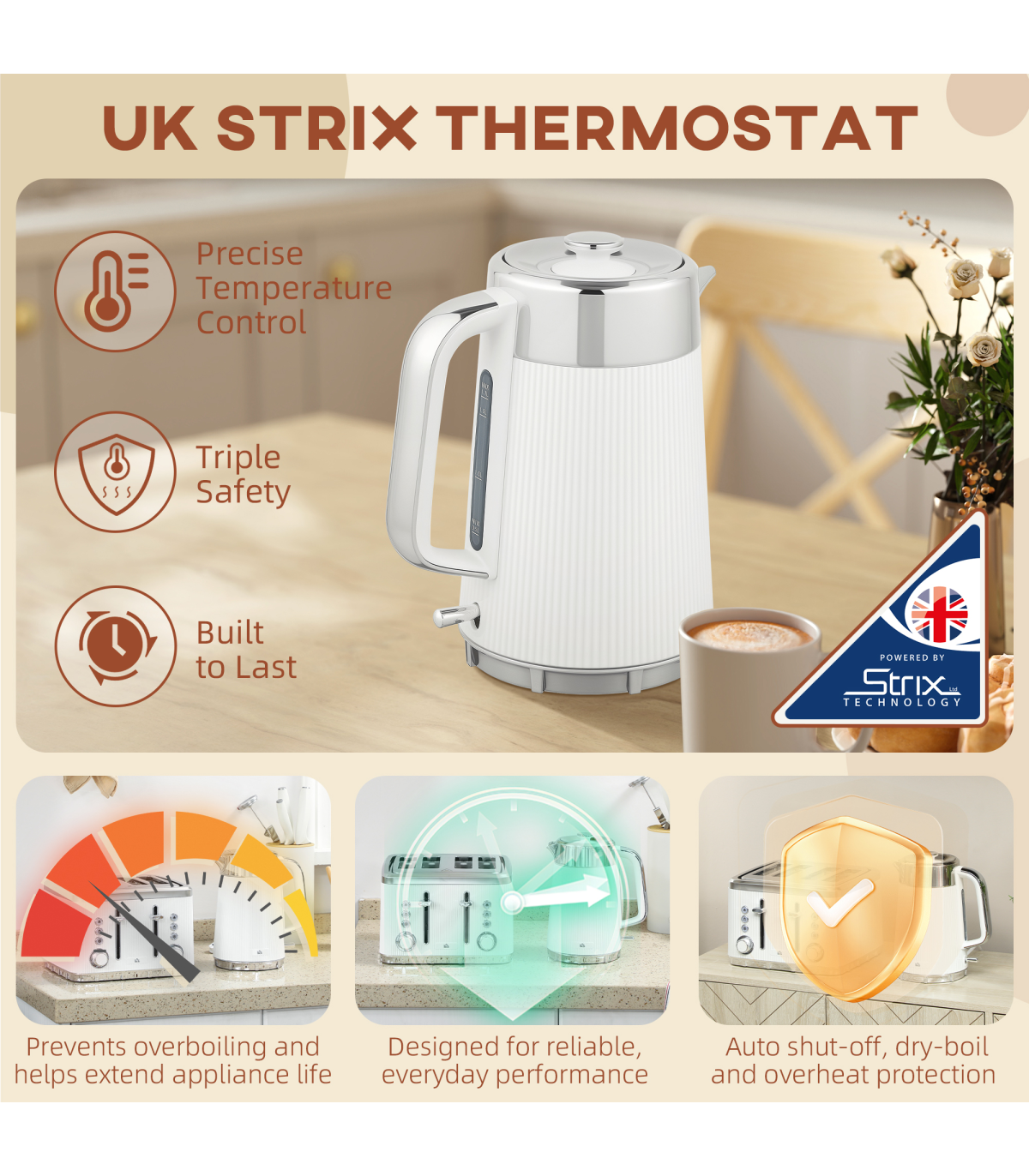 - Kettle with UK Strix thermostat for precise temp control and safety, meanwhile, a cool-touch lower body for safety