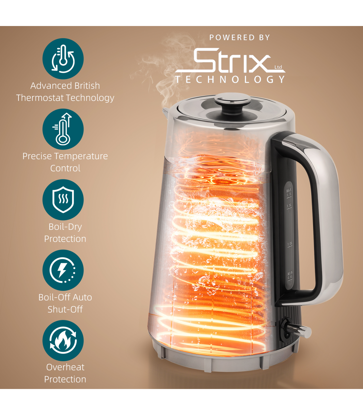 - Kettle with UK Strix thermostat for precise temp control and safety, meanwhile, a cool-touch lower body for safety