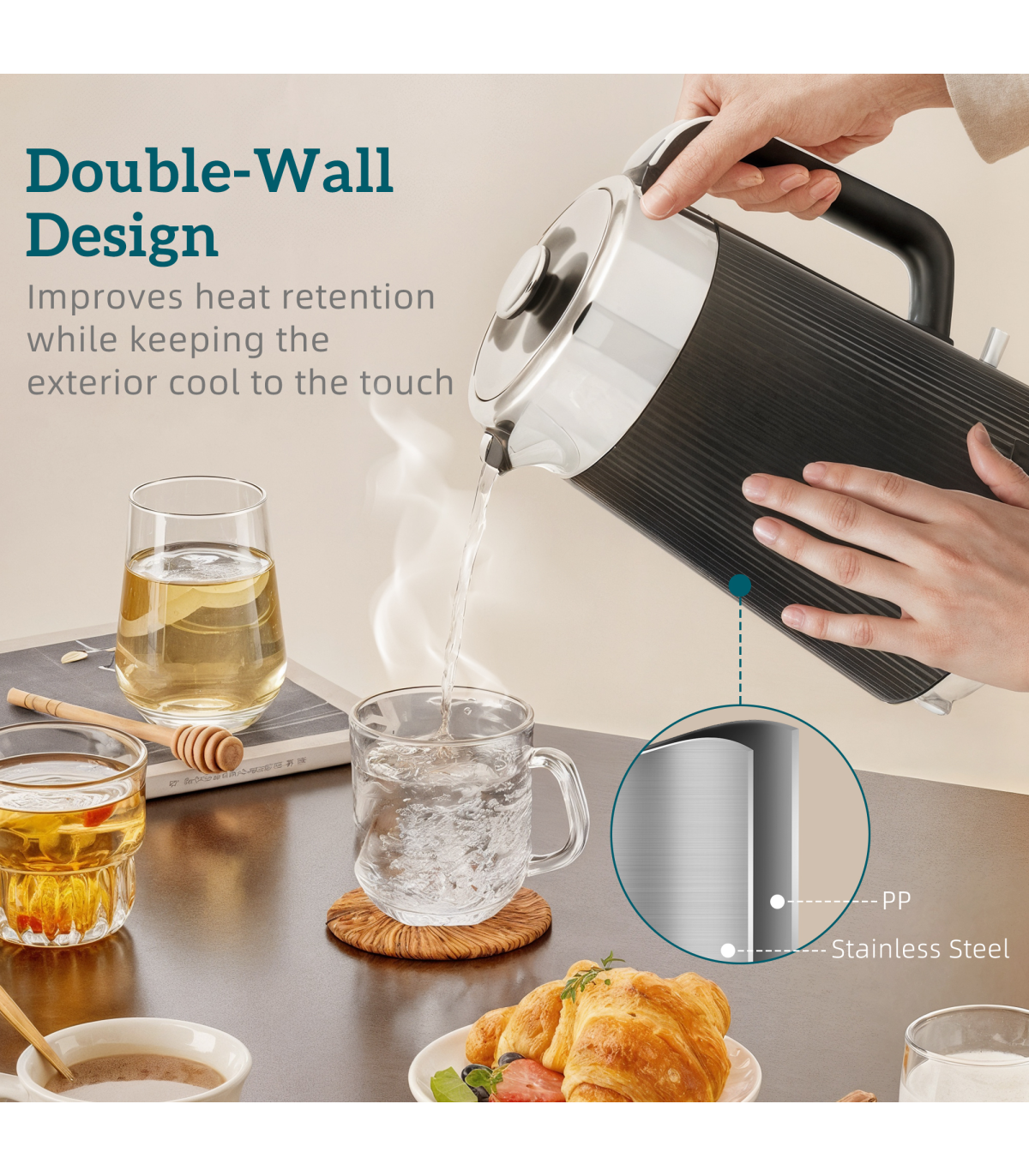 - User-friendly details: 360° kettle base with cord storage, visible water volume and anti-slip bottom
