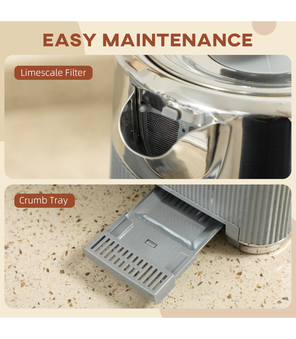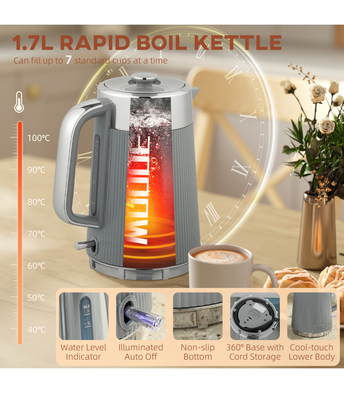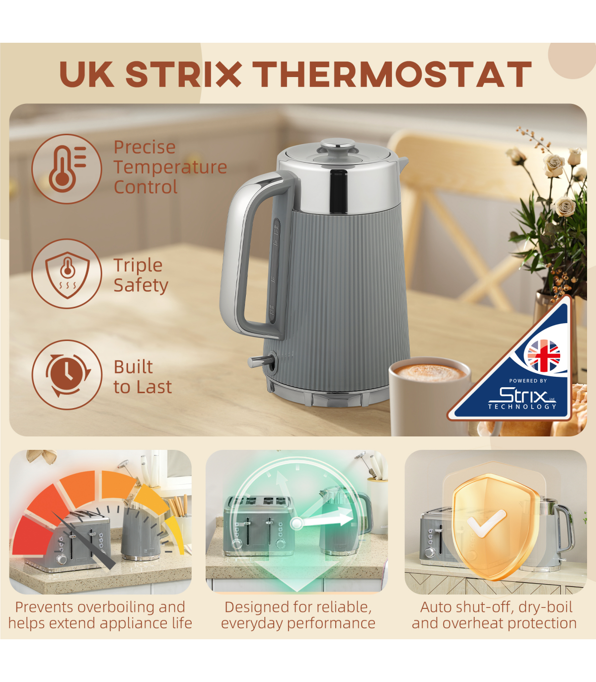 - Kettle with UK Strix thermostat for precise temp control and safety, meanwhile, a cool-touch lower body for safety