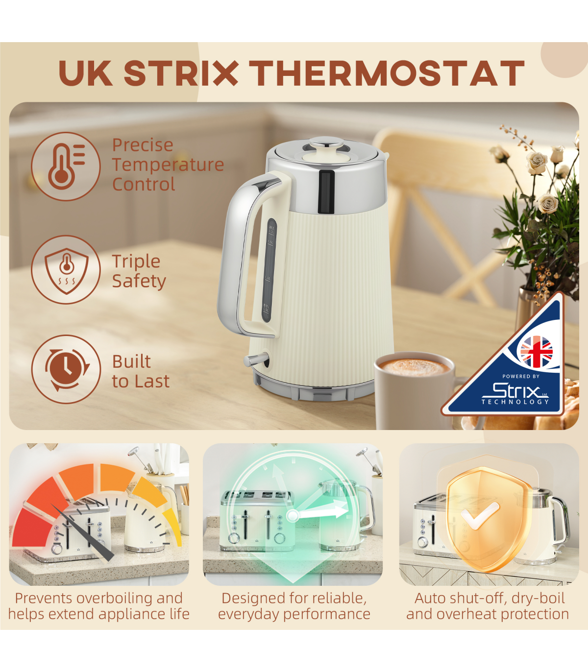 - Kettle with UK Strix thermostat for precise temp control and safety, meanwhile, a cool-touch lower body for safety