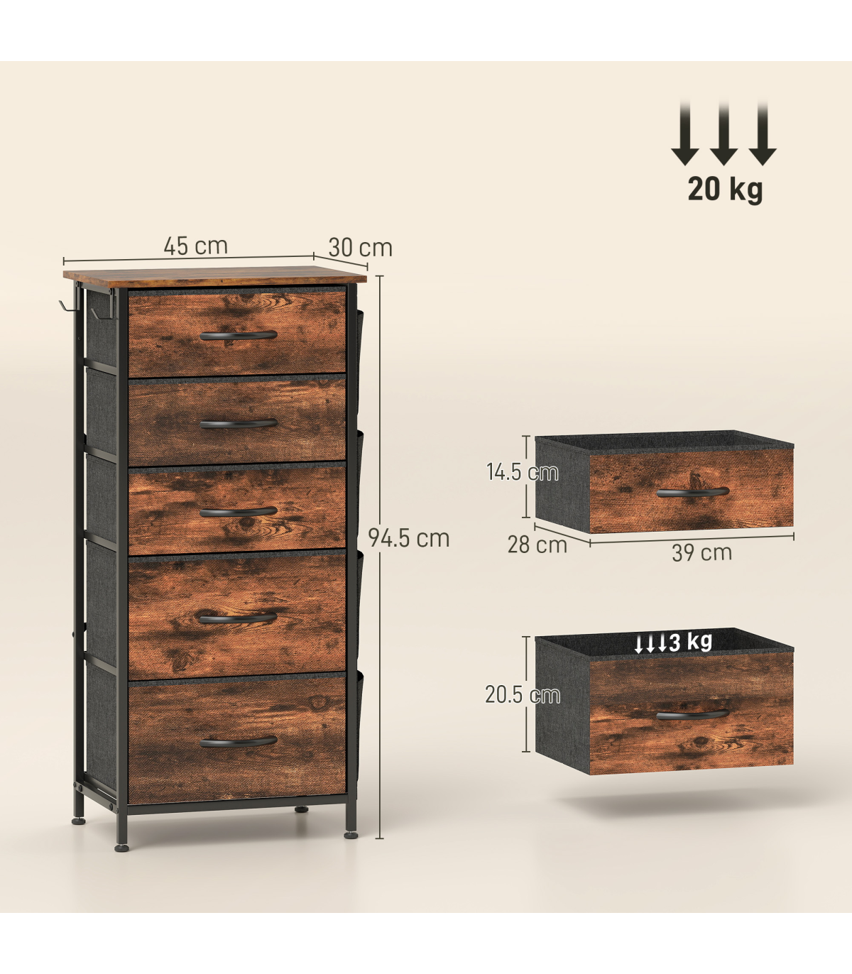 - Maximum Load: 10 kg (Top), 3 kg (Each Drawer), 20 kg (Total)