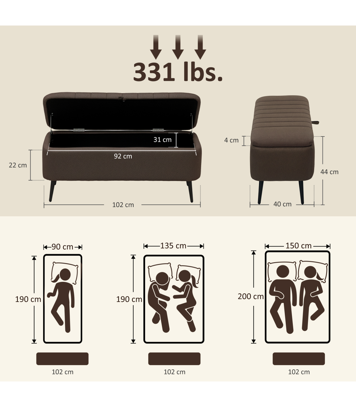 - Hidden Storage Size: 92W x 31D x 22H cm