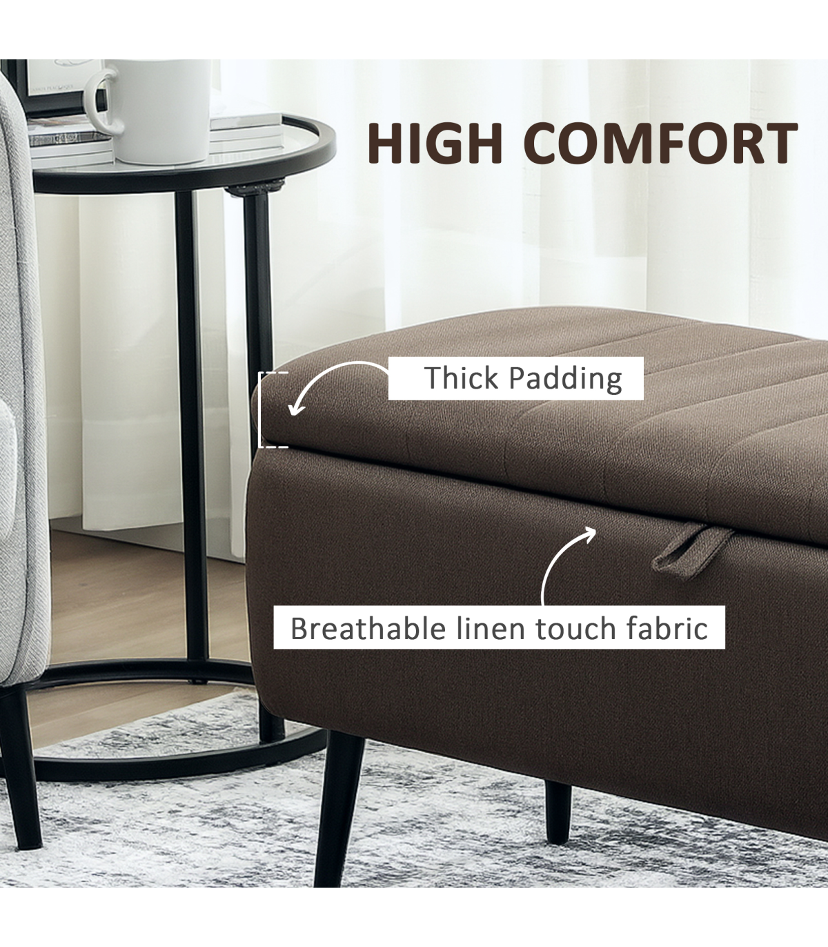 - Padded seat lid to sit comfortably. Smooth linen upholstery feels great on the skin