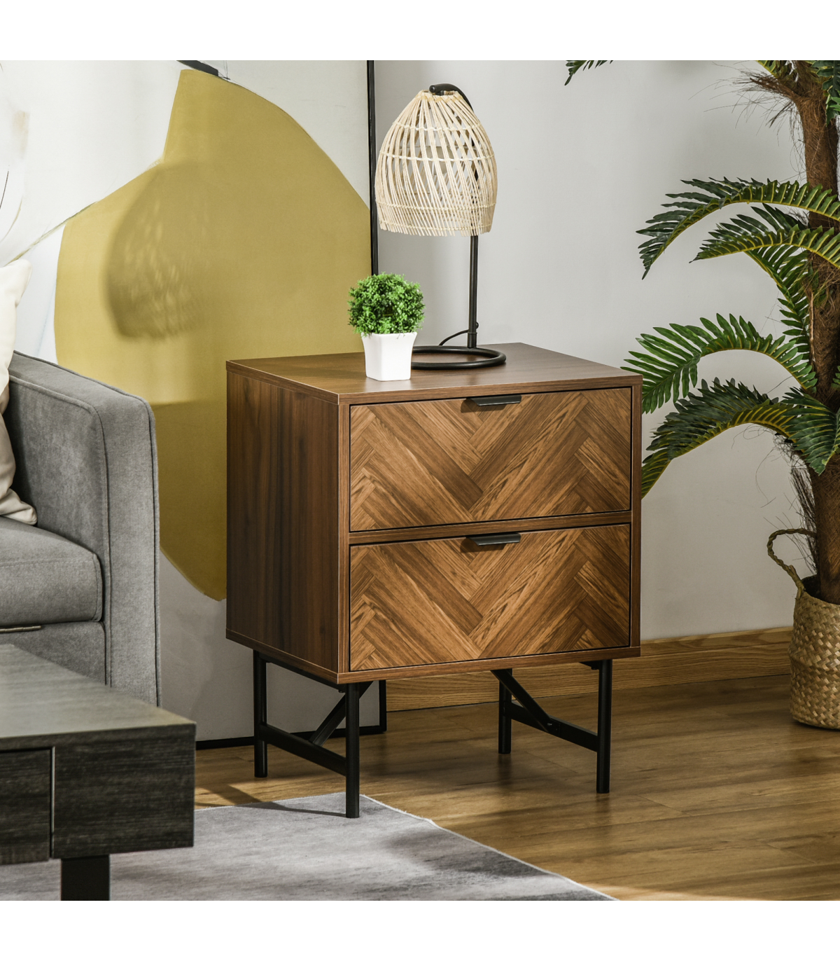 - Herringbone design in a brown wood-effect finish