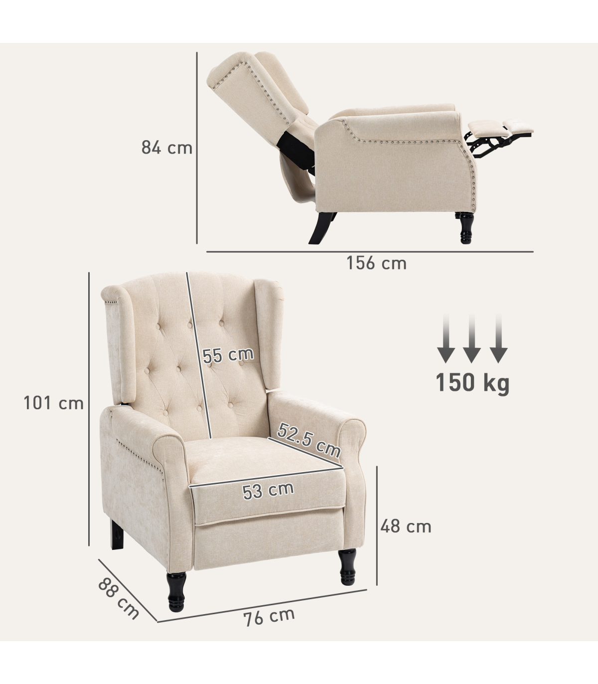 - Reclining Dimension: 76W x 156D x 84Hcm