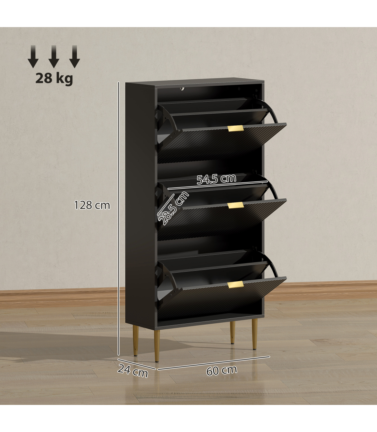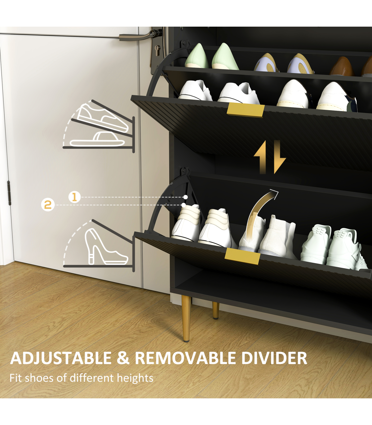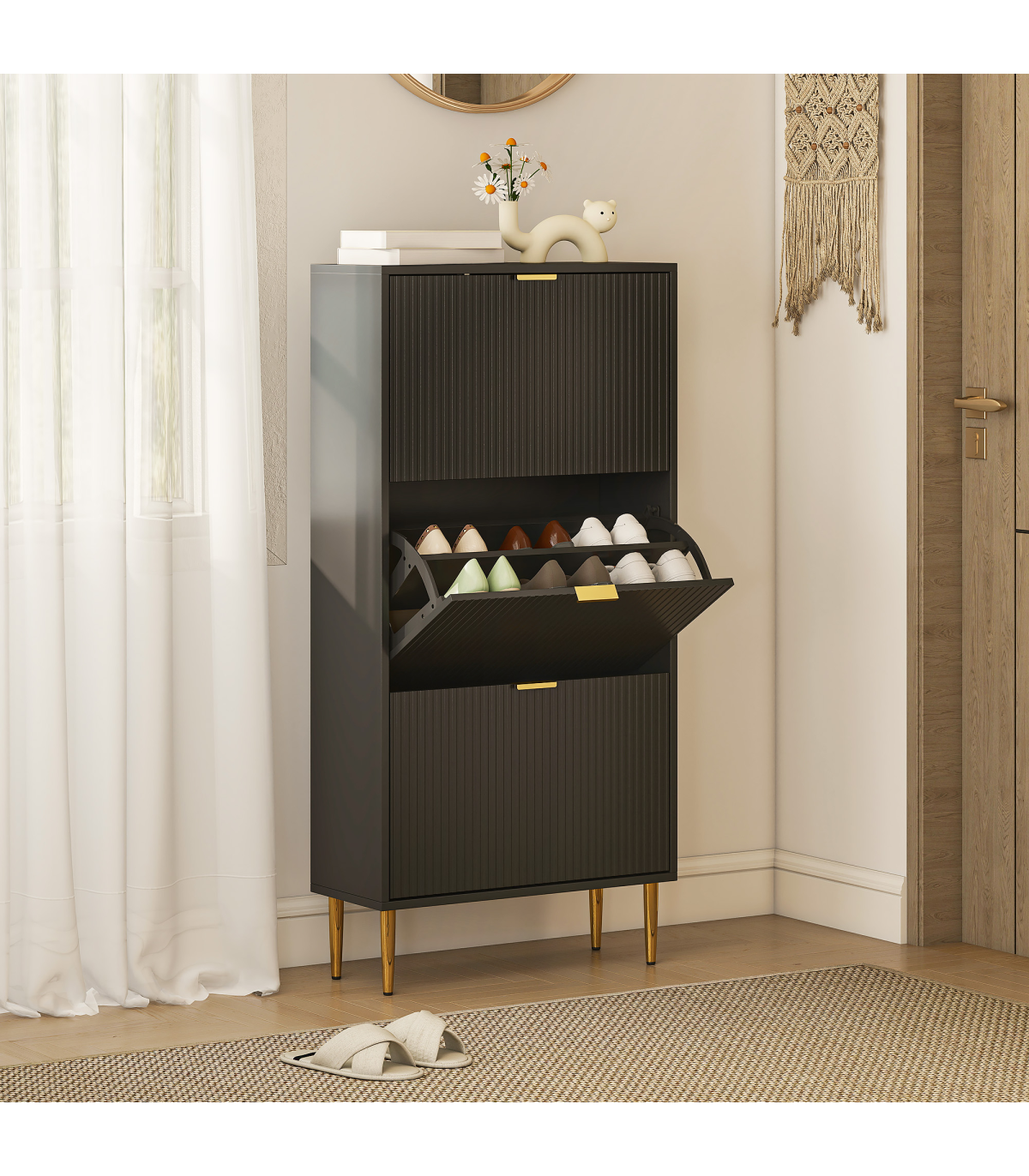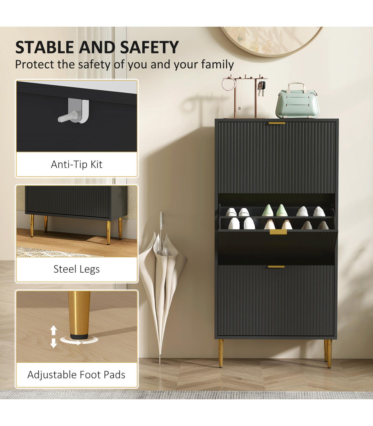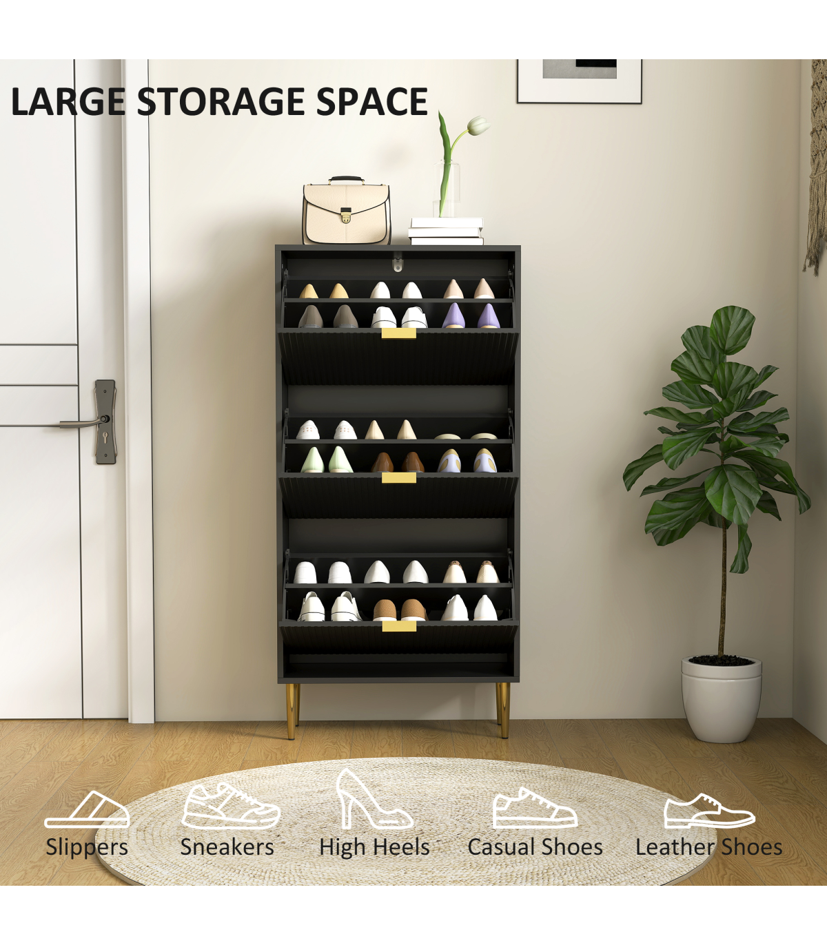 - Three flip drawers can store up to 18 pairs of shoes