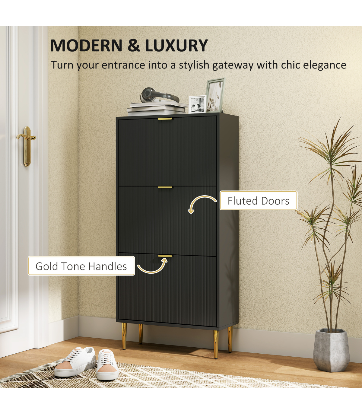- Unique fluted panel doors and gold tone handles add modern luxury style