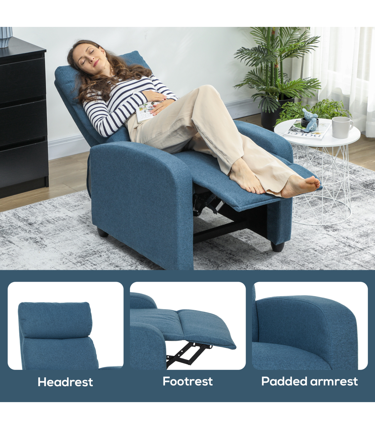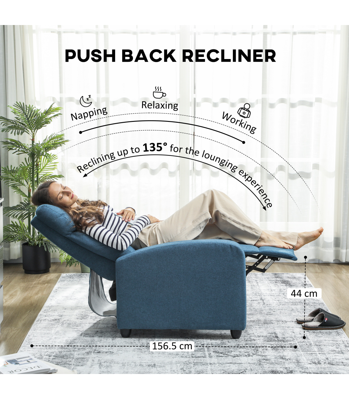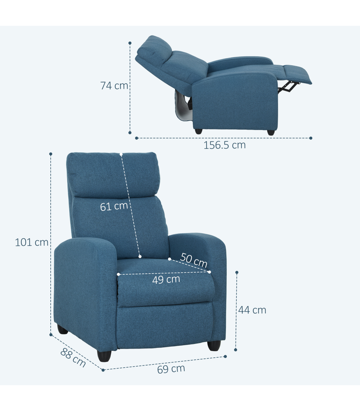 - Reclining Dimension: 69W x 156.5D x 74H cm