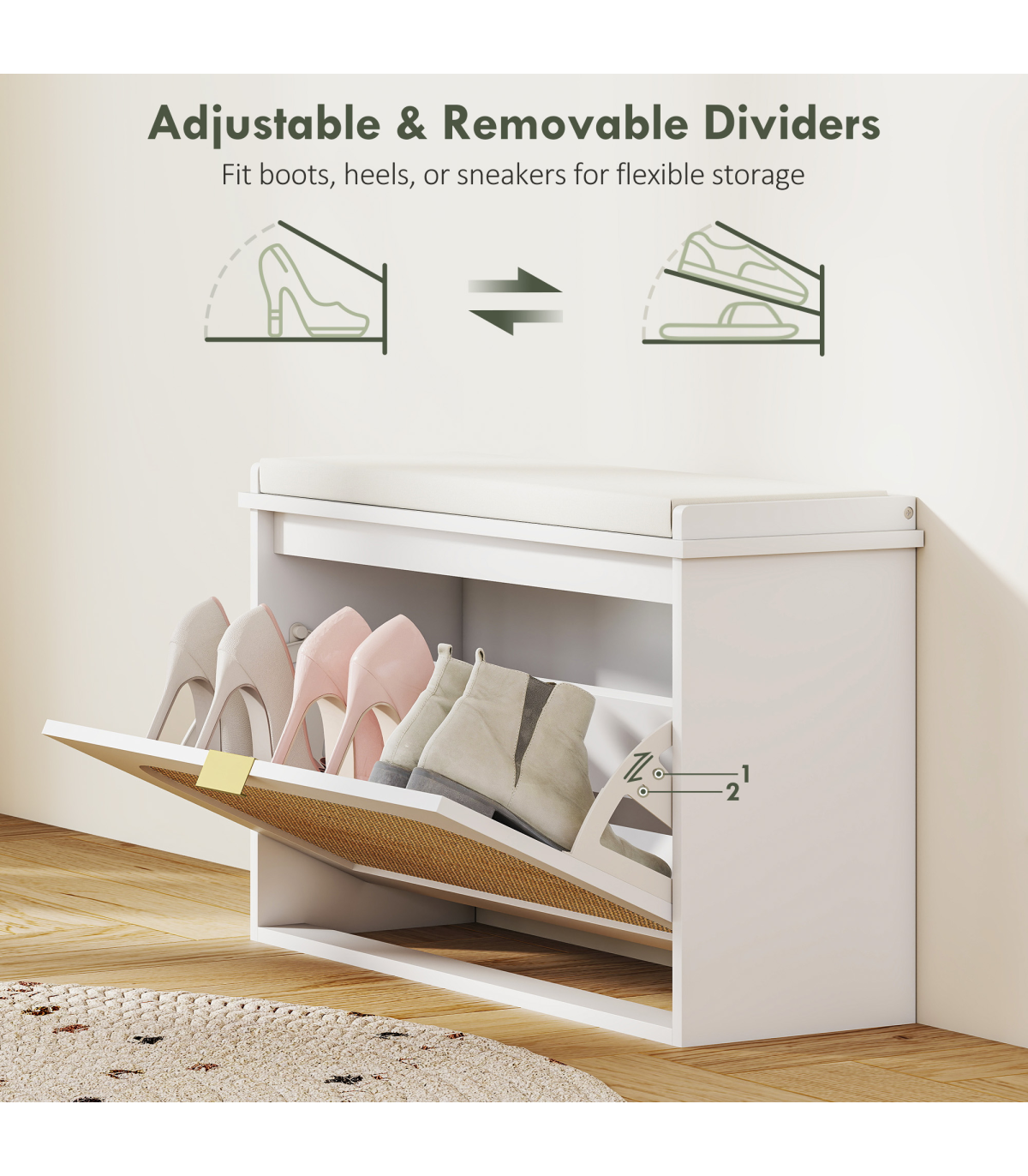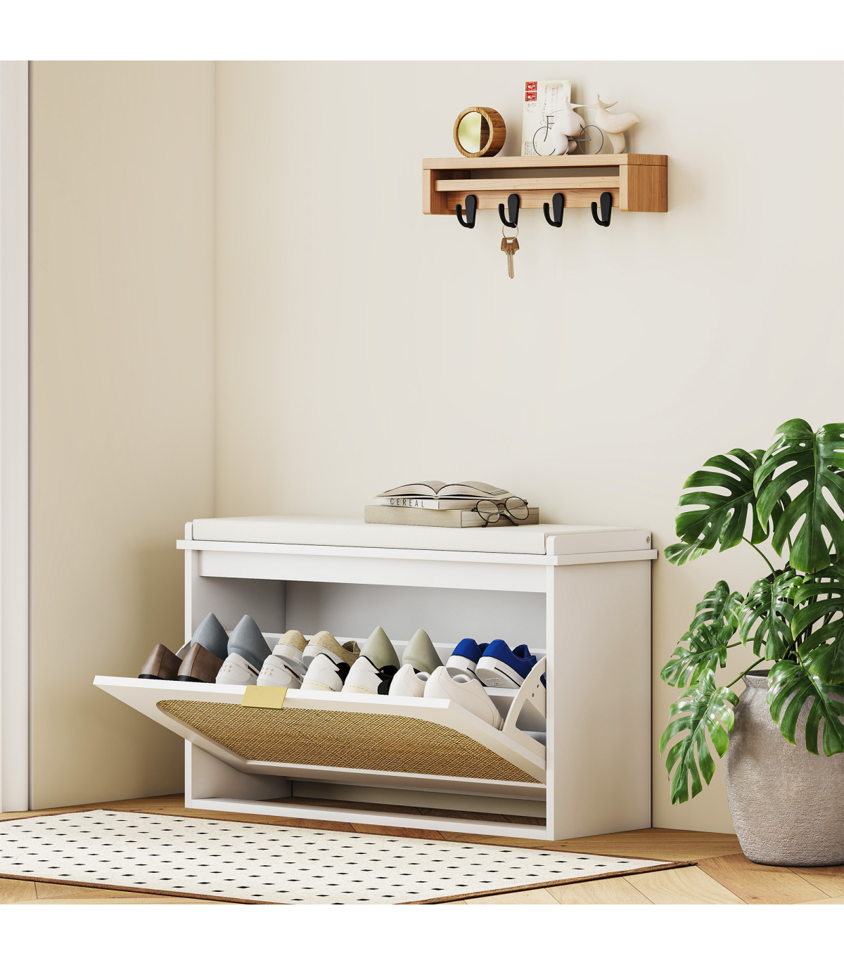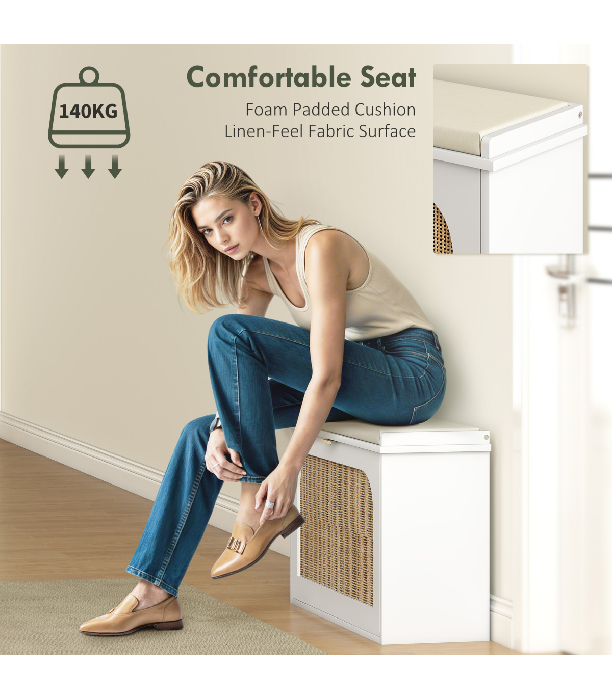 - Thick foam padded cushion wrapped in linen-feel fabric, offers comfortable seating for shoe changing