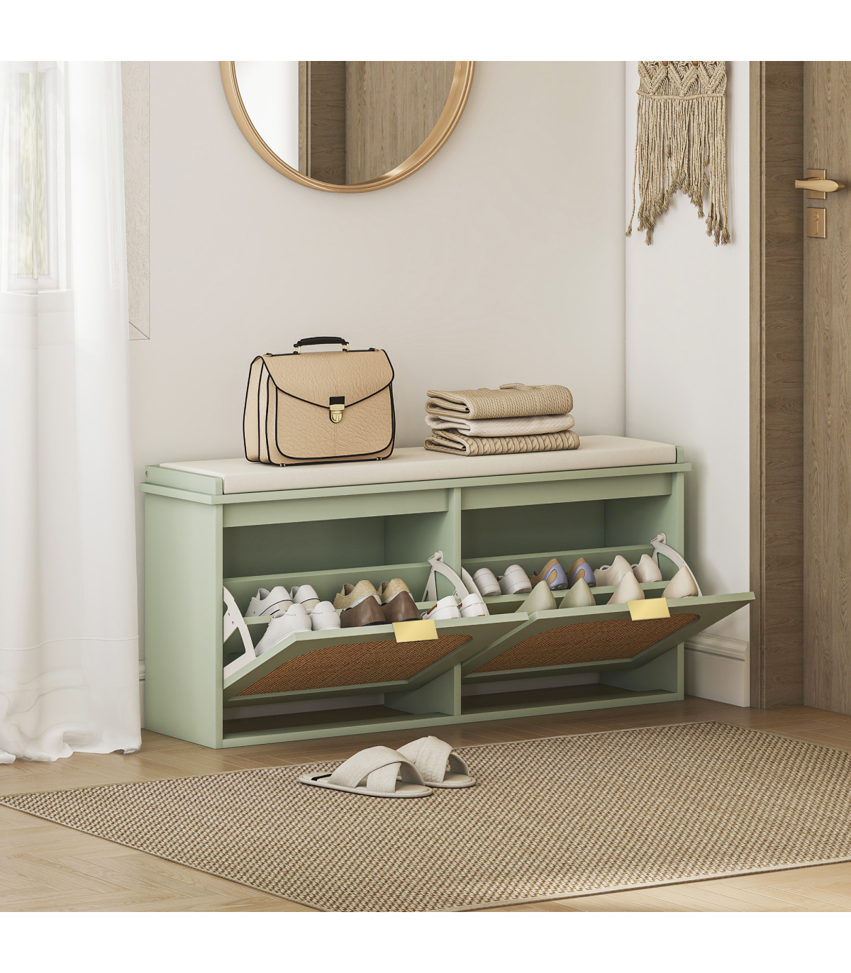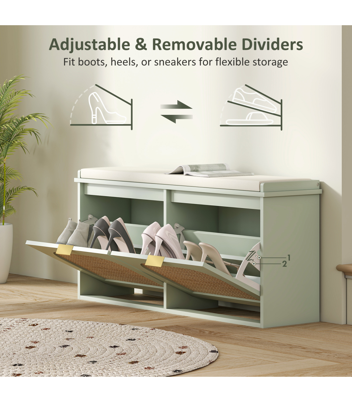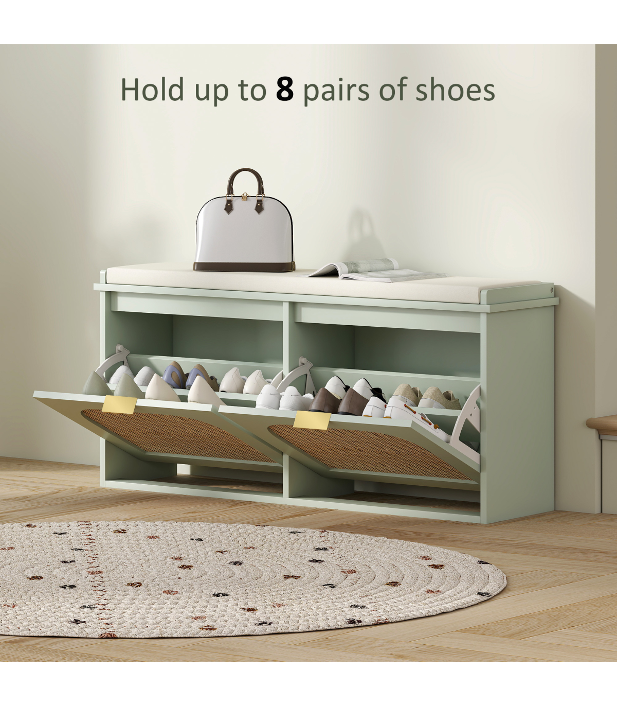 - Two flip drawers hold up to ten pairs of shoes neatly