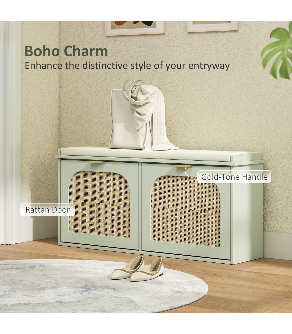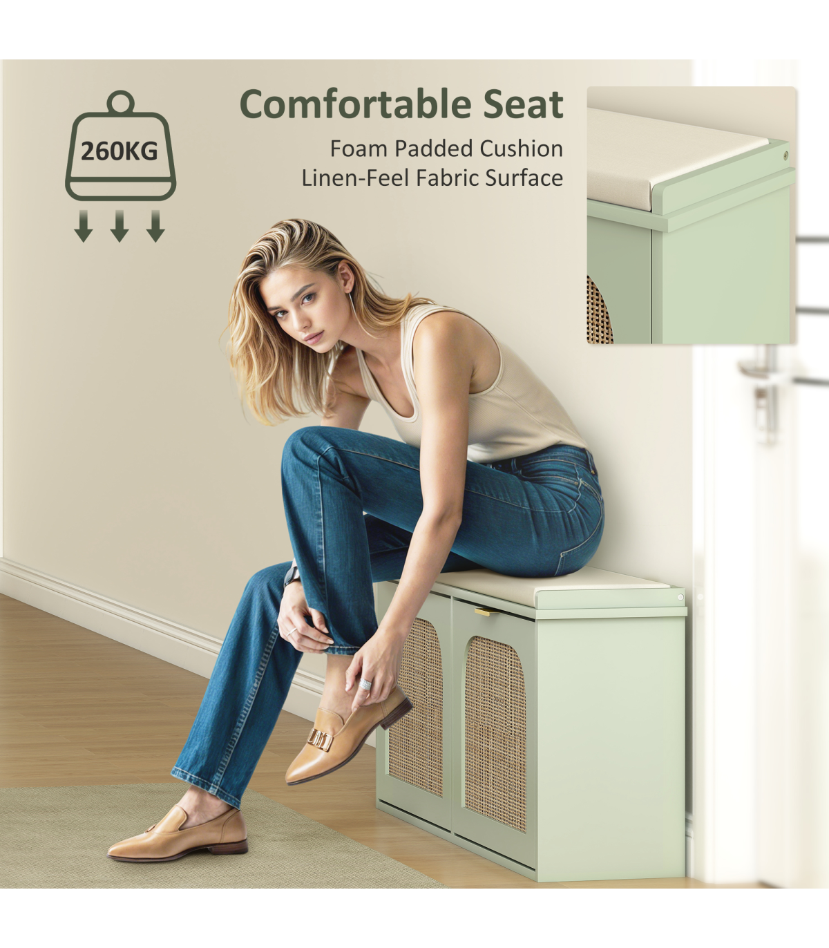 - Thick foam padded cushion wrapped in linen-feel fabric, offers comfortable seating for shoe changing