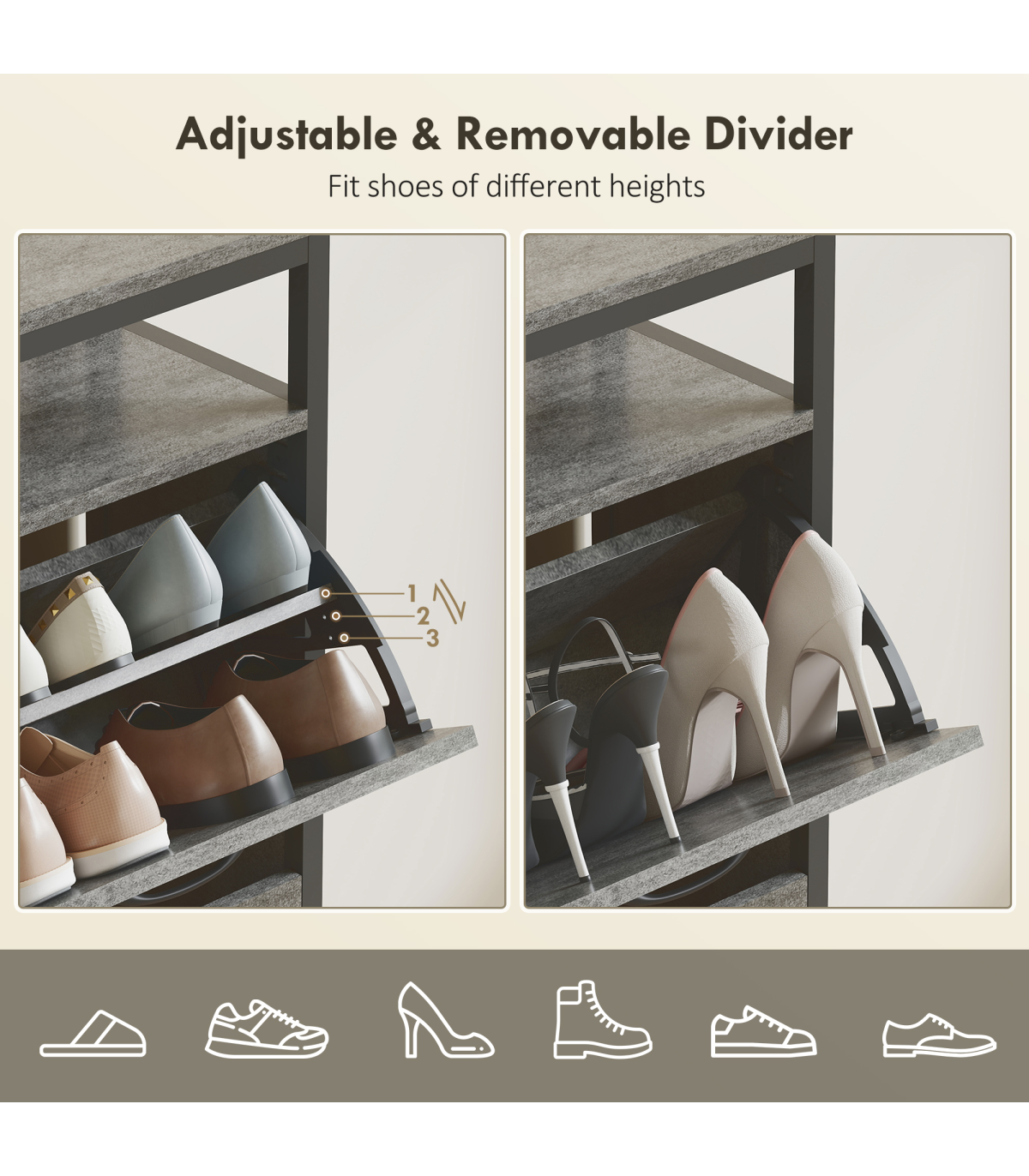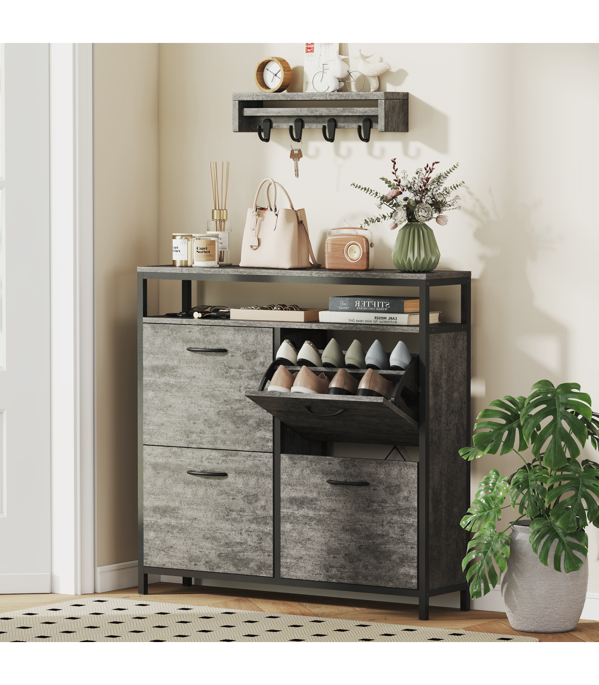 - Four flip drawers hold 12-20 pairs, great for family shoe storage needs