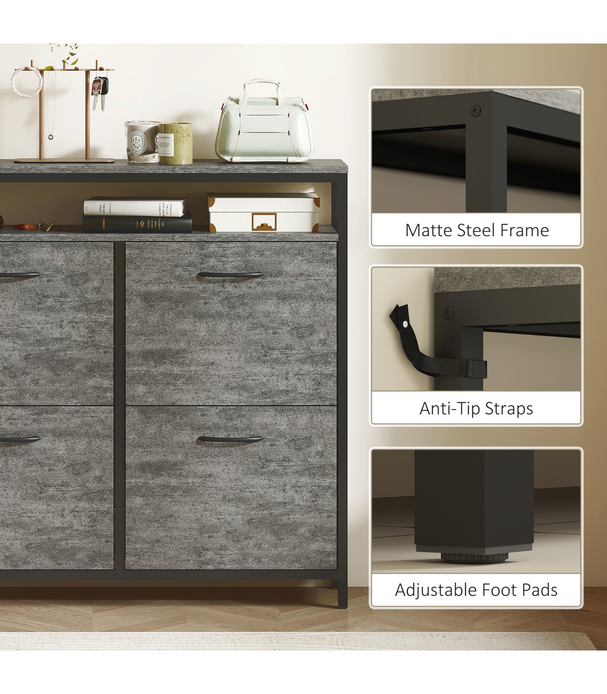 - Anti-tip straps and adjustable foot pads ensure stays safe and stable