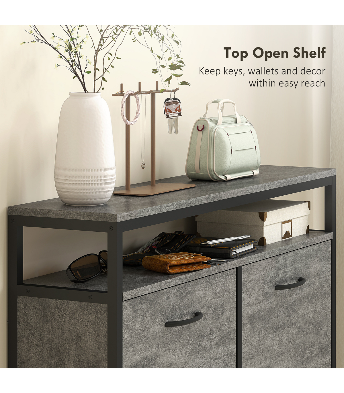 - Top open shelf keeps keys, wallets and decor within easy reach