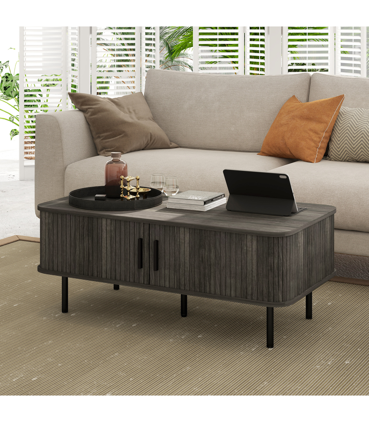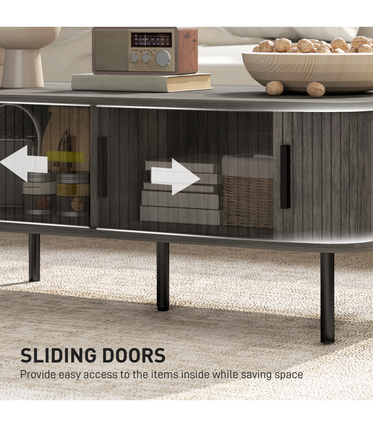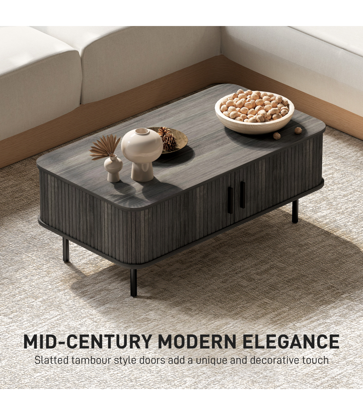 - Mid-Century modern style with slatted tambour doors adds a unique, decorative touch
