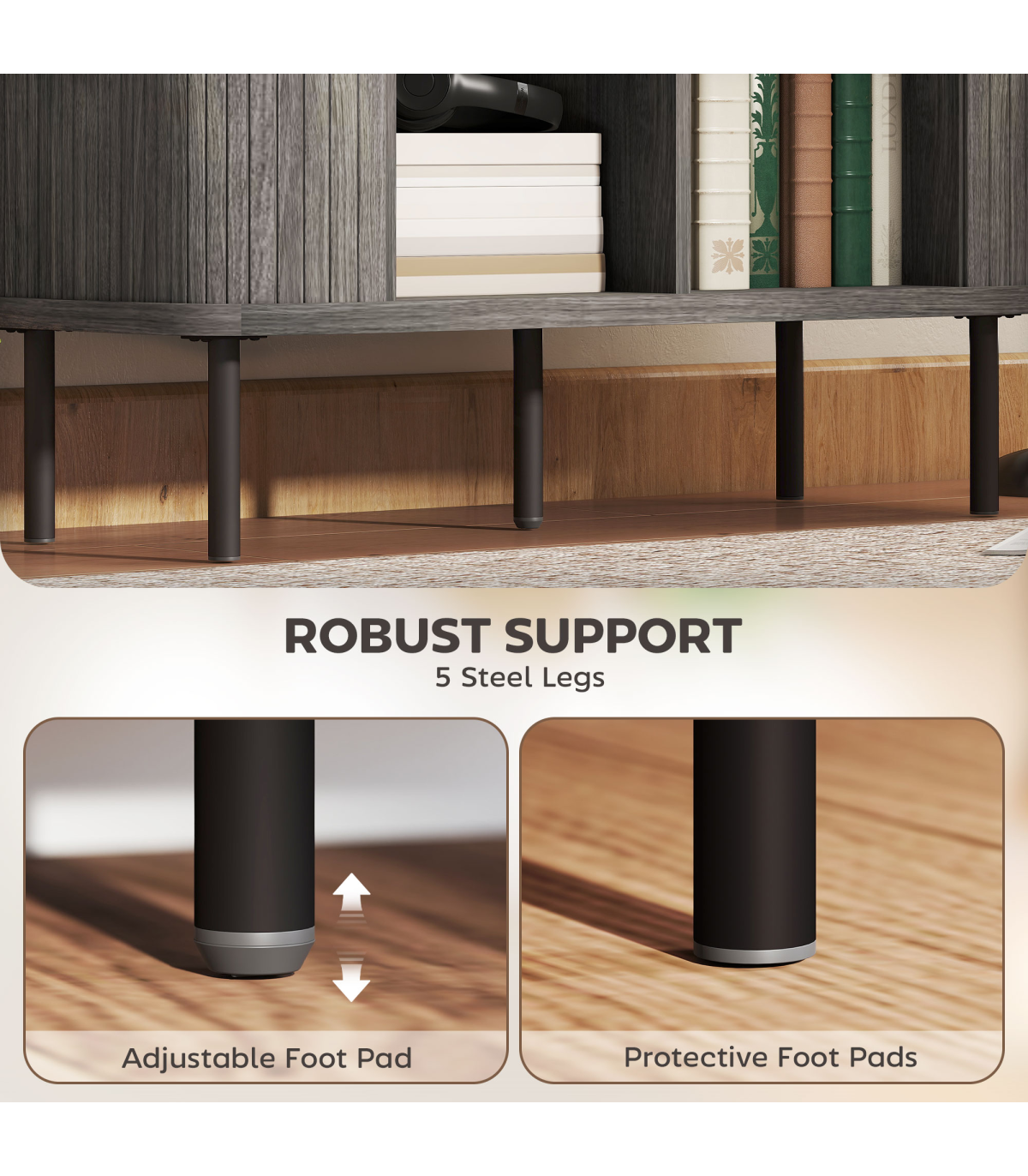 - Four legs with protective foot pads and extra middle legs with adjustable foot pads