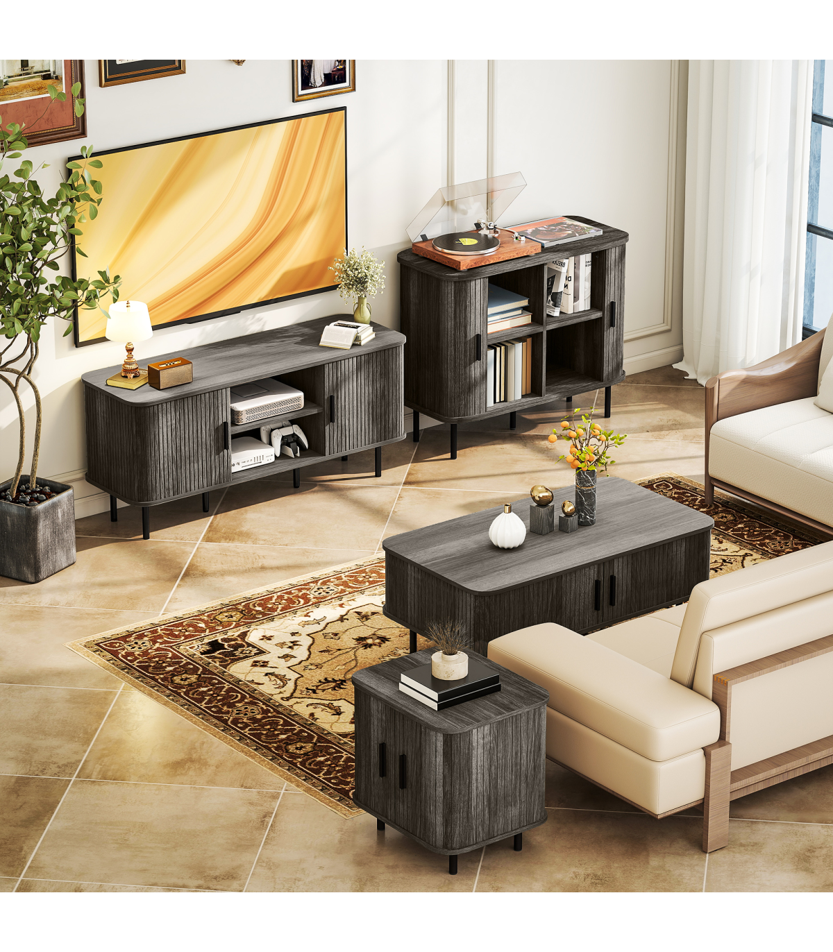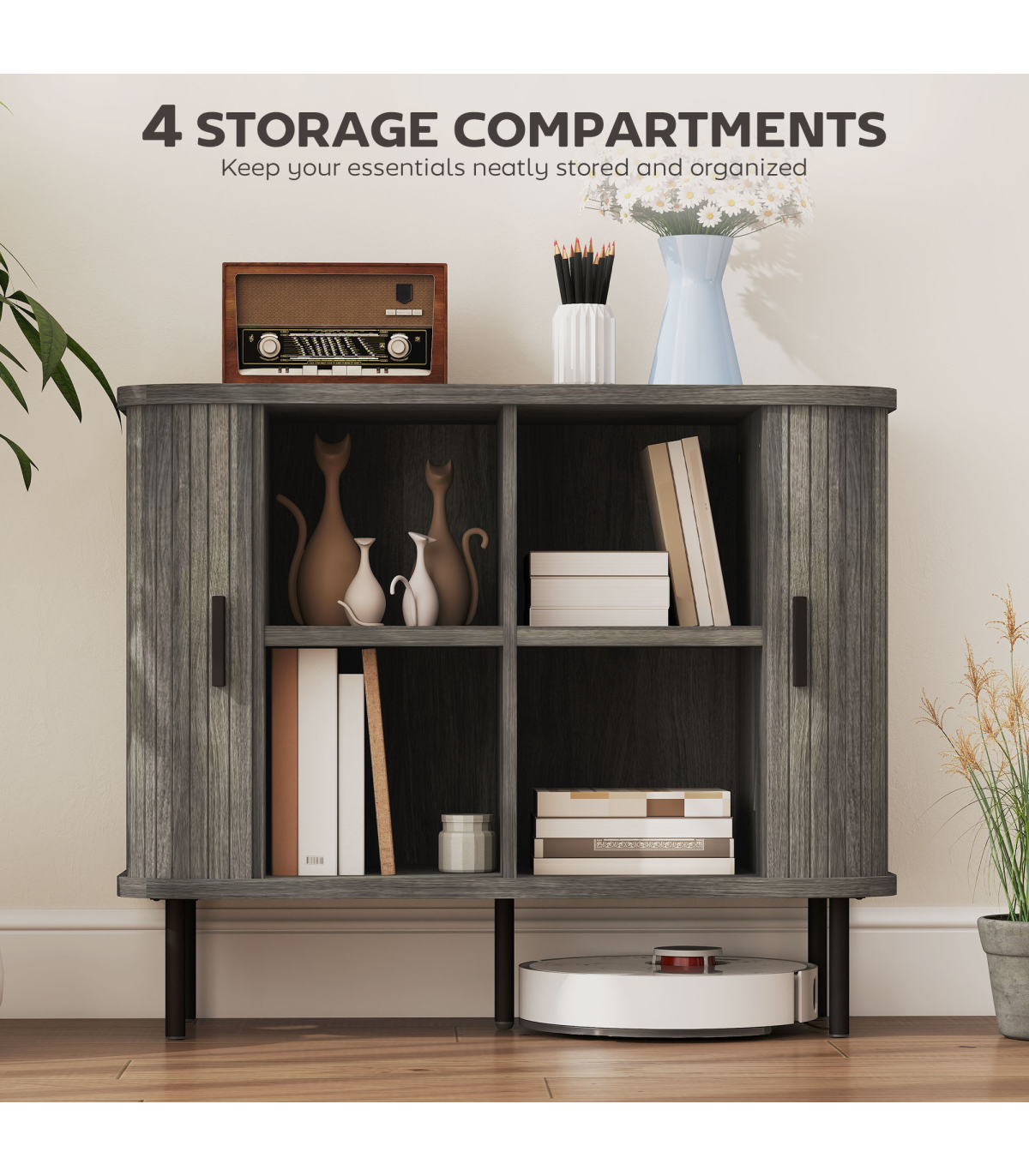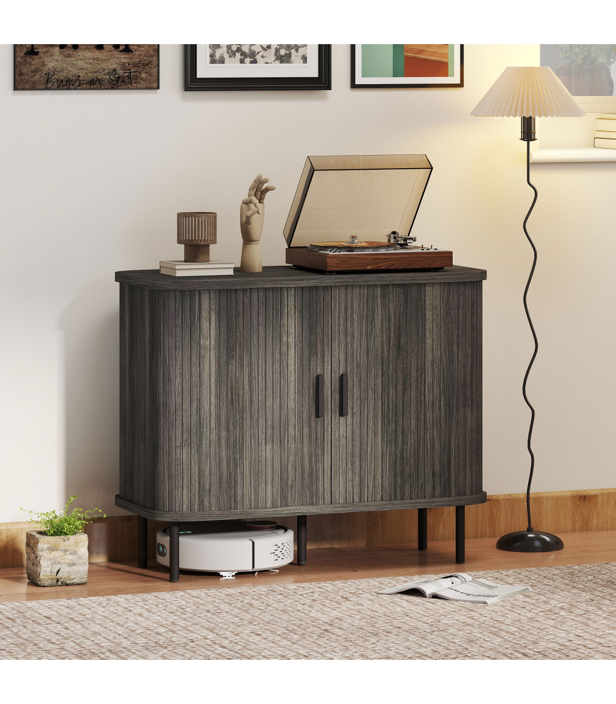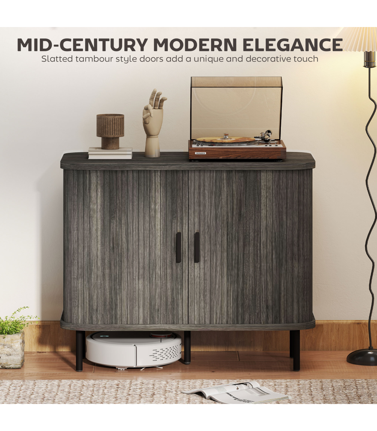 - Mid-Century modern style with slatted tambour doors adds a unique, decorative touch