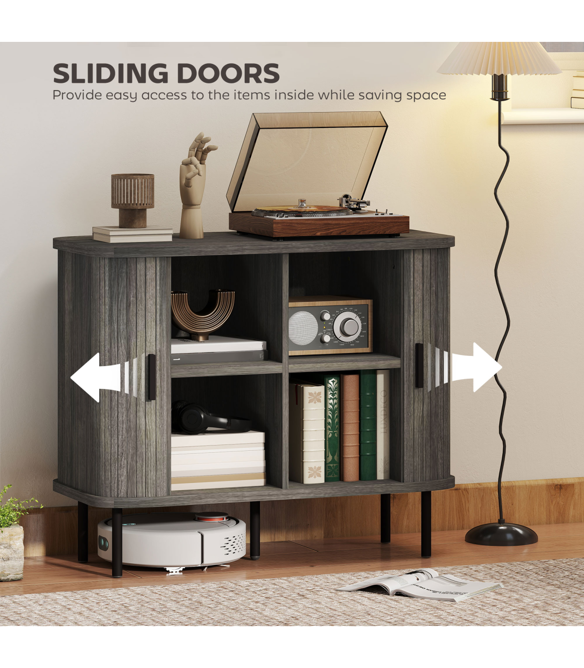 - Two compartments offer large storage behind the doors