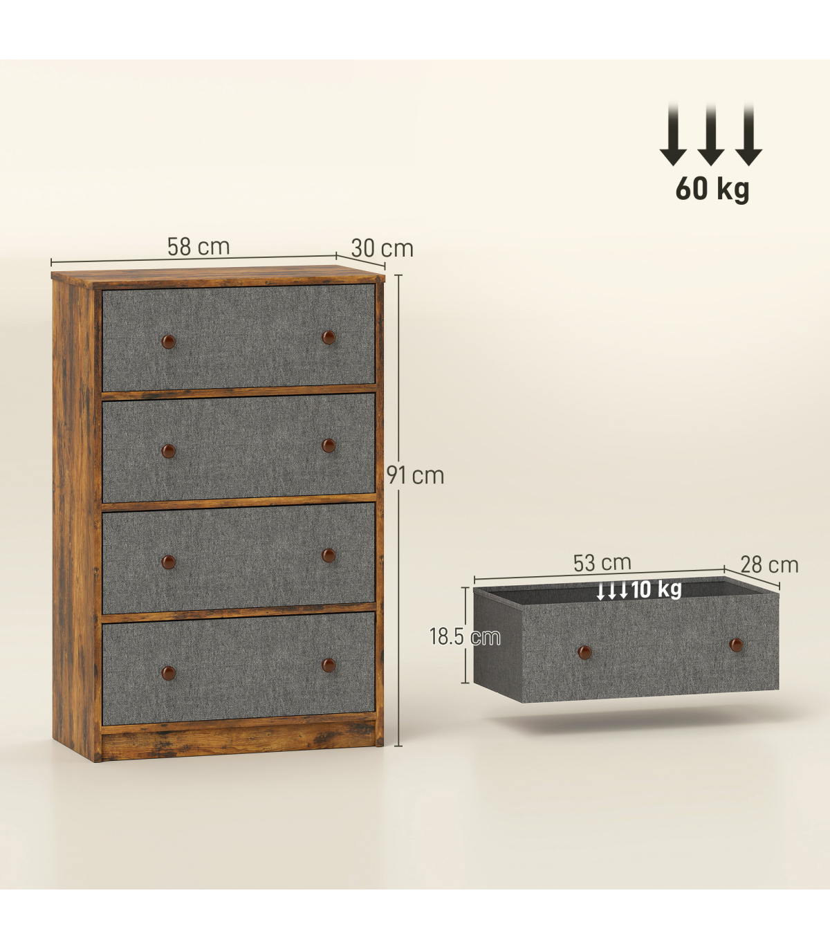 - Maximum Load: 20 kg (Top), 10 kg (Drawer), 60 kg (Overall)