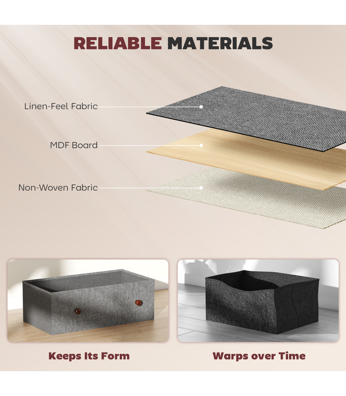 - Foldable storage drawers collapse flat when not in use