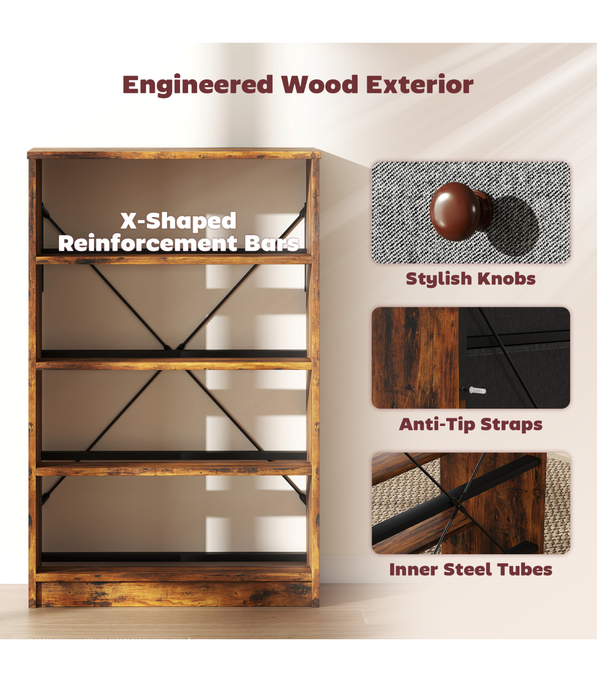 - Includes anti-tip straps for extra security