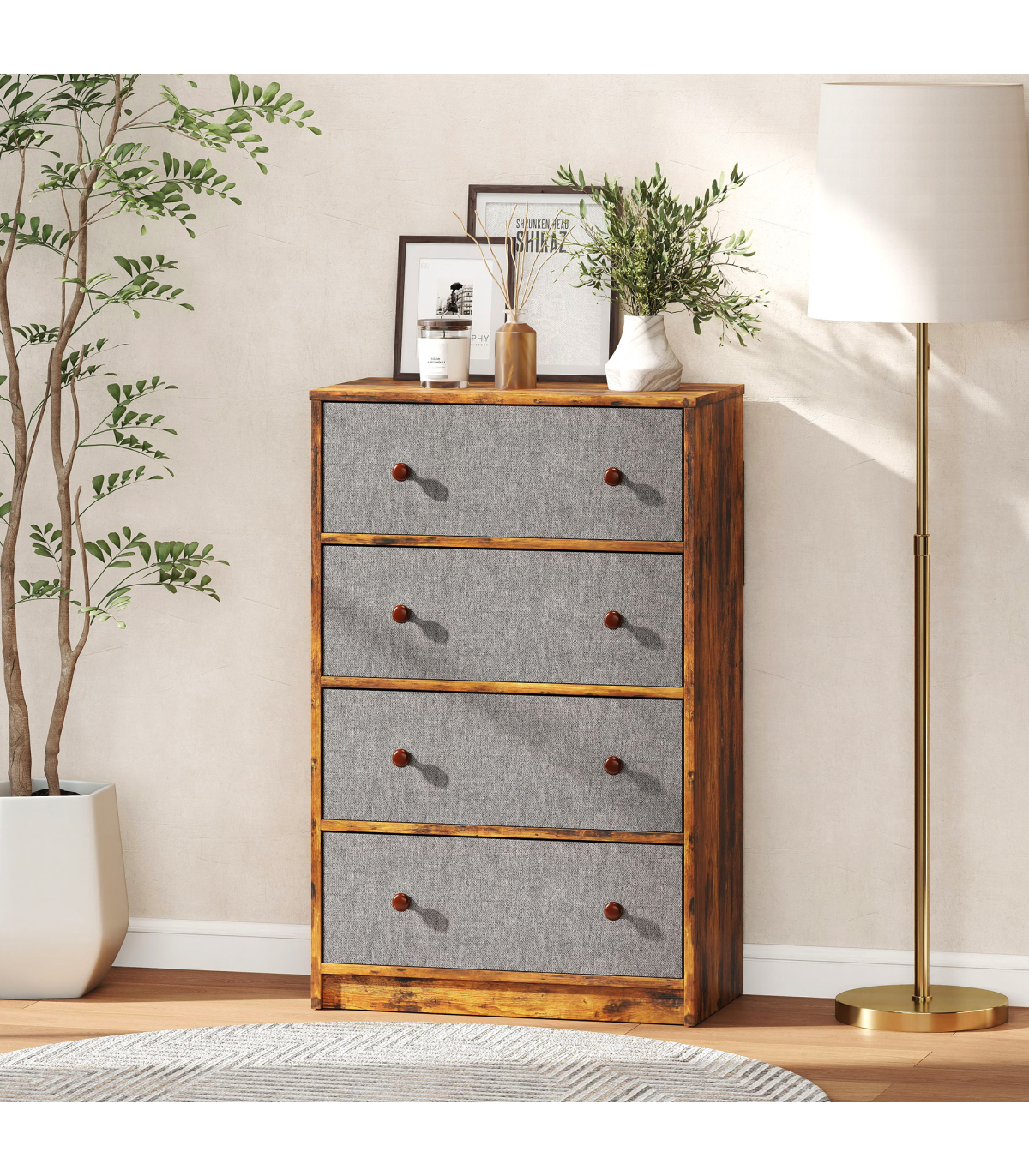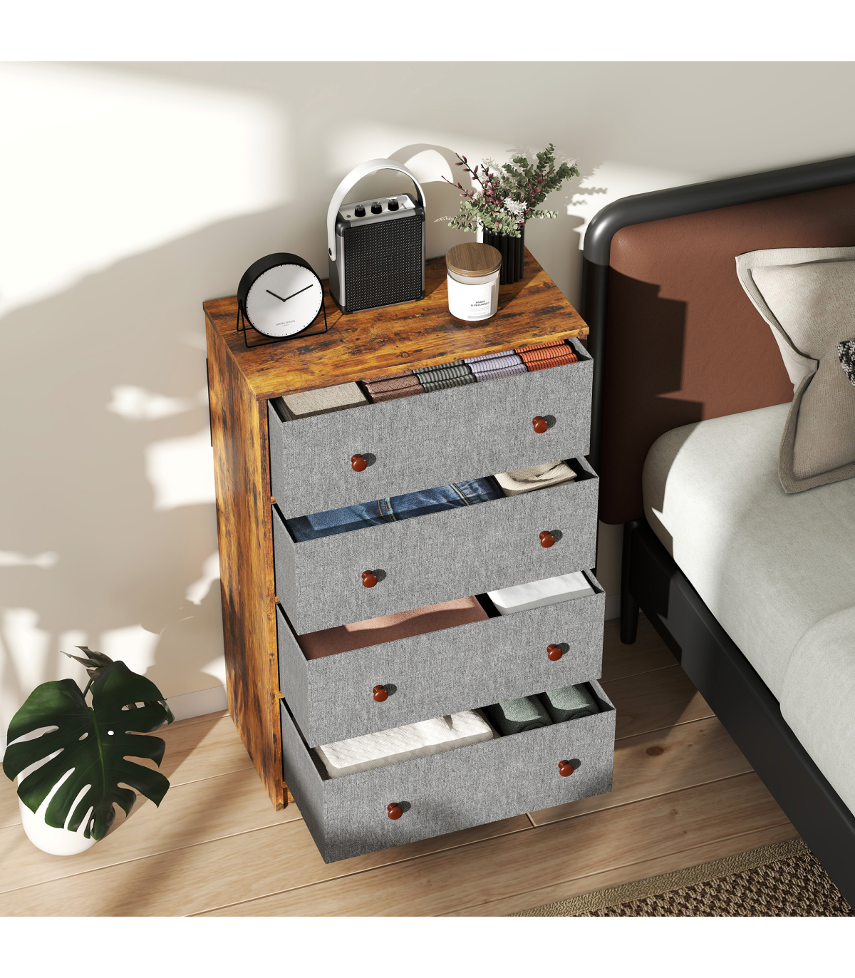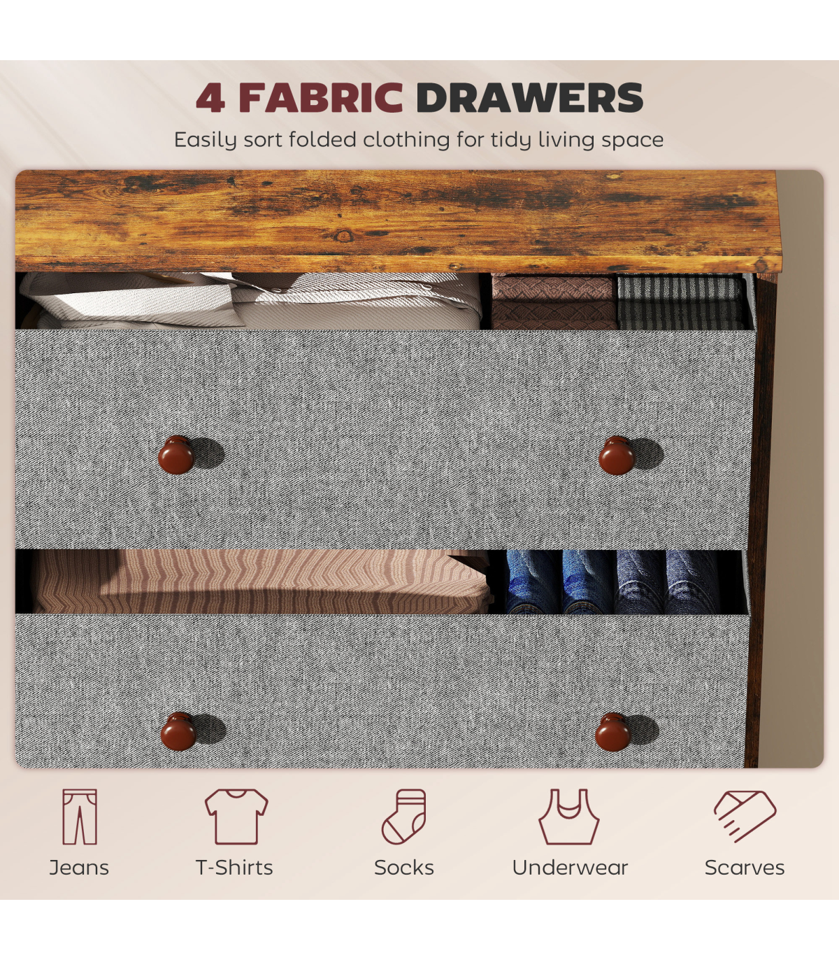 - Four fabric drawers neatly sort clothes, socks and accessories