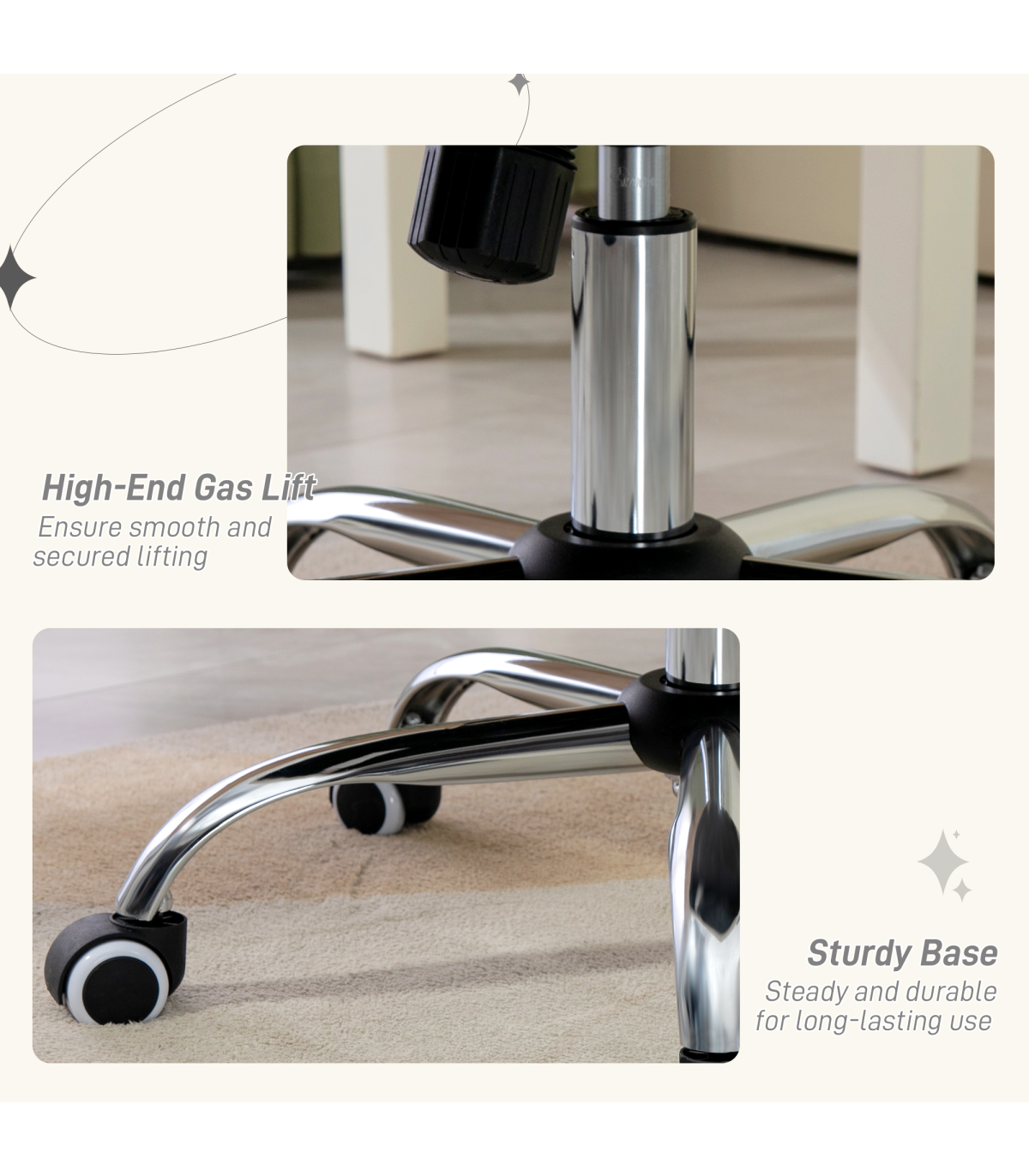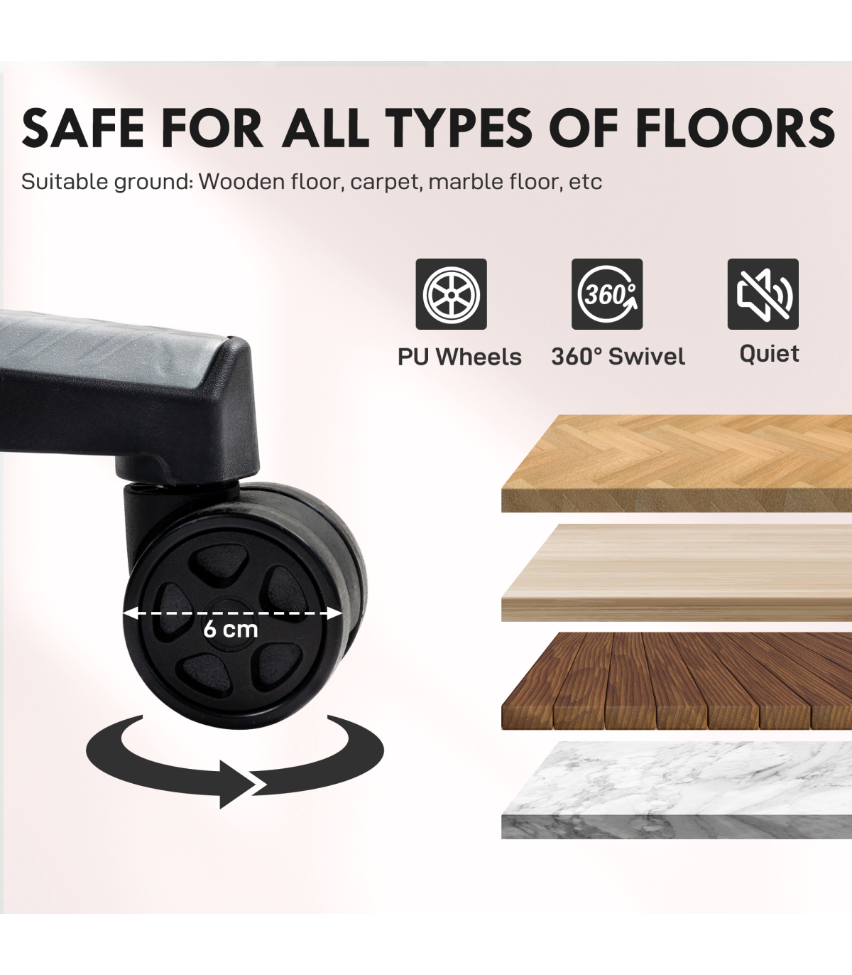 - Swivel seat and smooth, quiet casters ensure easy mobility