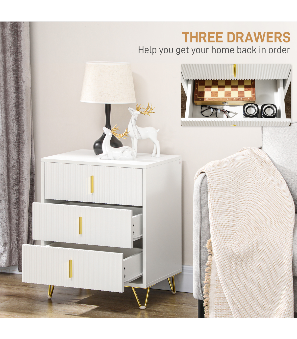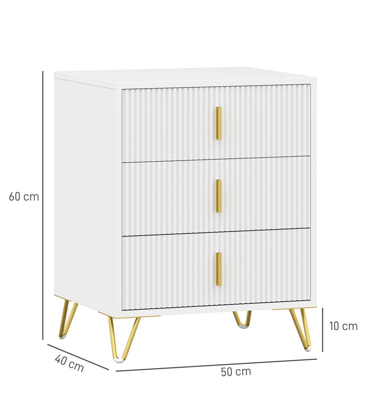 - Elegant drawer unit: white colour, with ridged front for texture and gold coloured accents