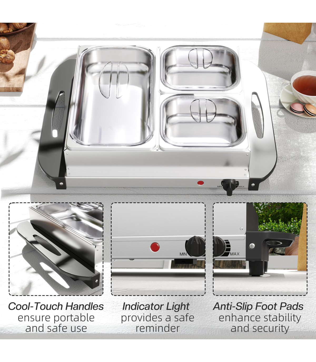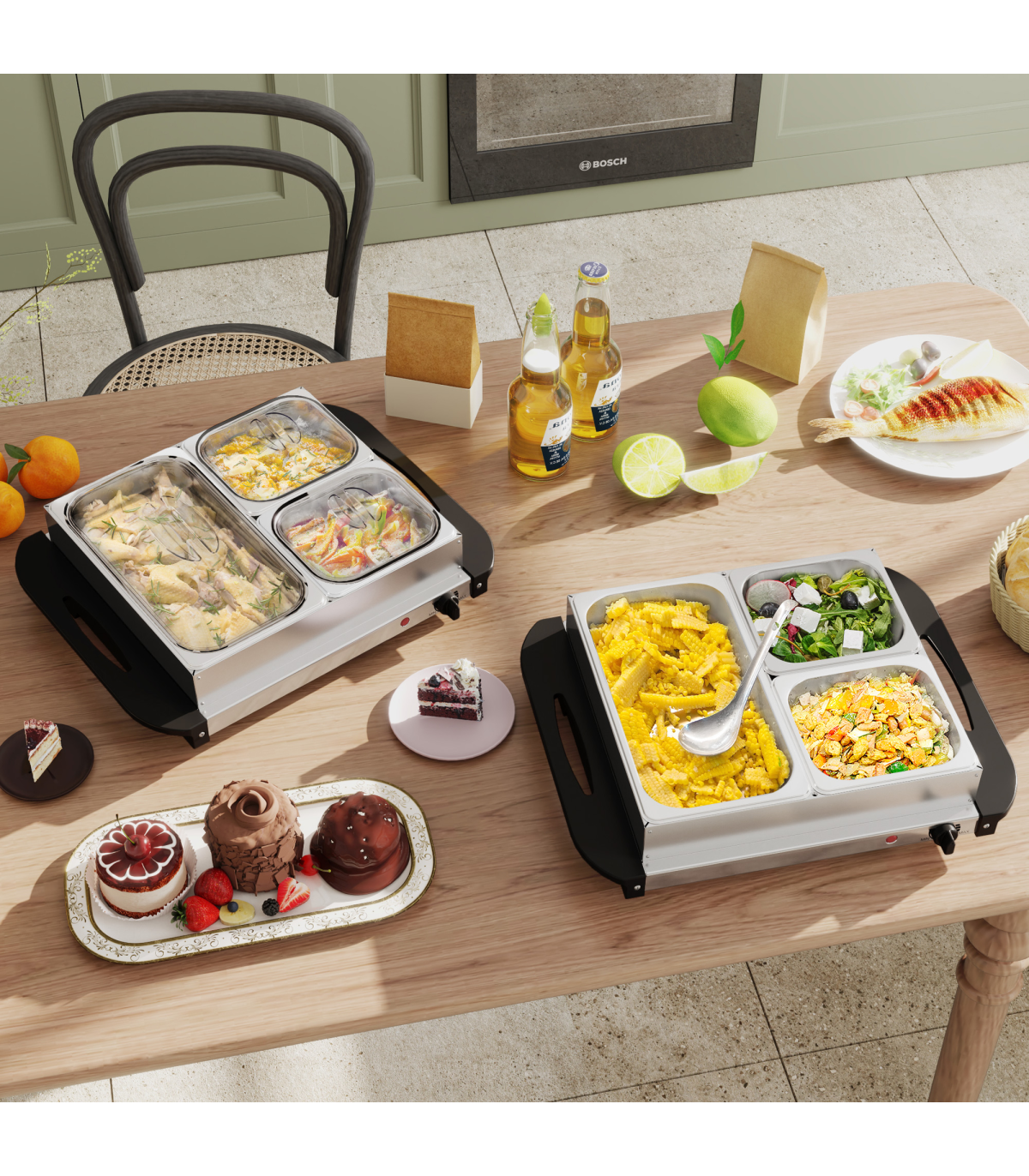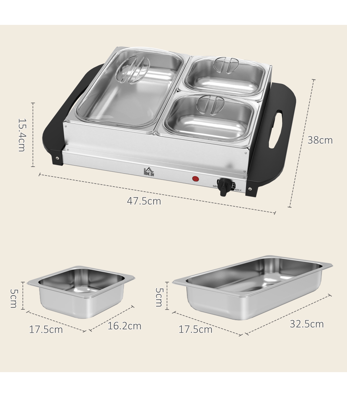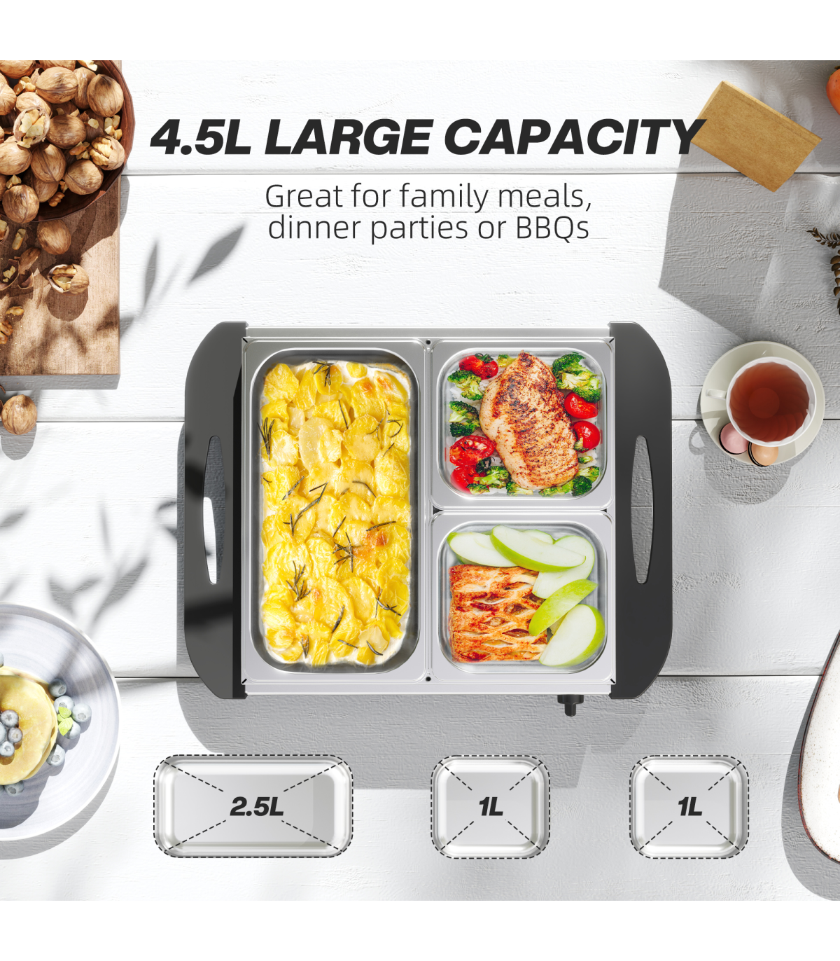 - 4.5L capacity: each food warmer buffet server comes with a 2.5L large tray and two 1L smaller trays. Lids included