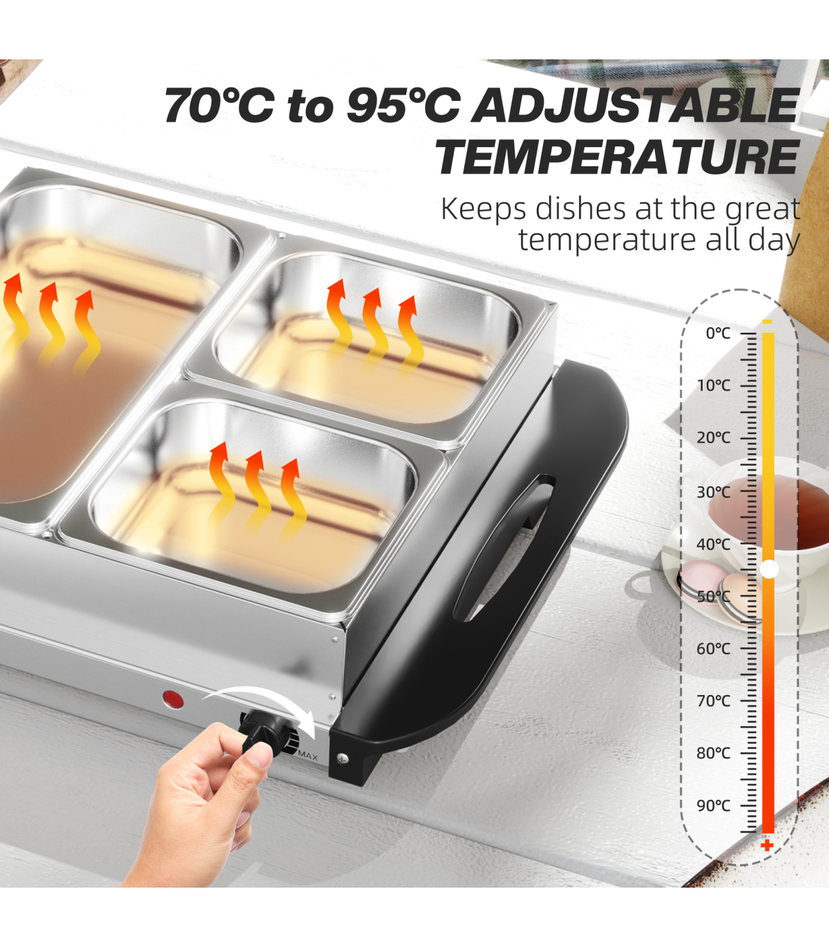 - 70°C-95°C temperature range, controlled by knob