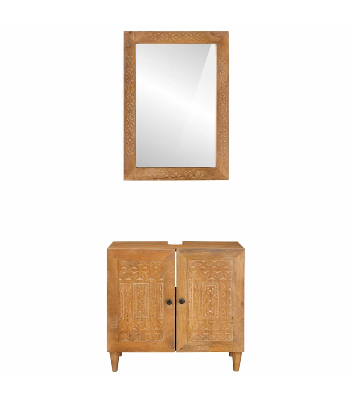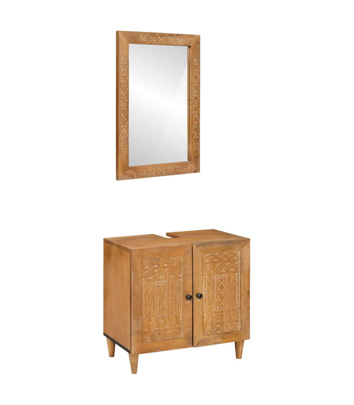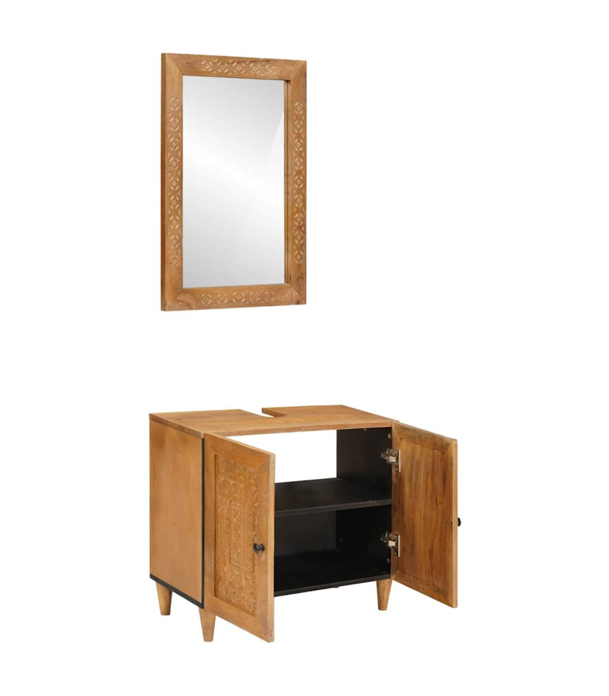 This Wooden Bathroom Furniture Set brings rustic charm to your space, focusing on natural, rugged beauty. It’s perfect for creating a warm and welcoming vibe in your bathroom, while its simple rectangular shape adds a touch of elegance without overwhelming things. Ideal for homeowners who love minimalism, the lovely wood grain adds great texture, making it a brilliant addition to any home. Solid Materials: Made from solid mango wood, this furniture set is all about strength and authenticity. The wood’s rich texture beams natural warmth, giving you a unique style that never goes out of fashion. Plus, mango wood is super strong, so it’ll last ages even in steamy bathrooms. Complete Package: This set includes a stylish sink cabinet and a sleek mirror. Together, they combine practicality and good looks in one package. The cabinet’s flush door and square legs offer loads of storage to keep your stuff organized, and the mirror helps with grooming while making the room feel bigger. Functional Storage: Built for clever space use, this set makes the most of your bathroom storage without hogging too much floor space. The flush doors open to a compartment for toiletries and cleaning products, keeping everything tidy and serene. The easy-to-use knobs make daily tasks a breeze. Stylish Design: With its rustic look, this set's brown tones and metal fixtures add texture and contrast. Its wall-mounted design saves floor space, creating a clean, open feel. The square metal legs add a modern twist while keeping things steady and sturdy. Easy Maintenance: Made for convenience, this furniture needs minimal care. Just give it a wipe with a dry cloth to keep it shining and steer clear of harsh chemicals to keep it looking fab for years. Assembly is a cinch with two people and a screwdriver for speed.
