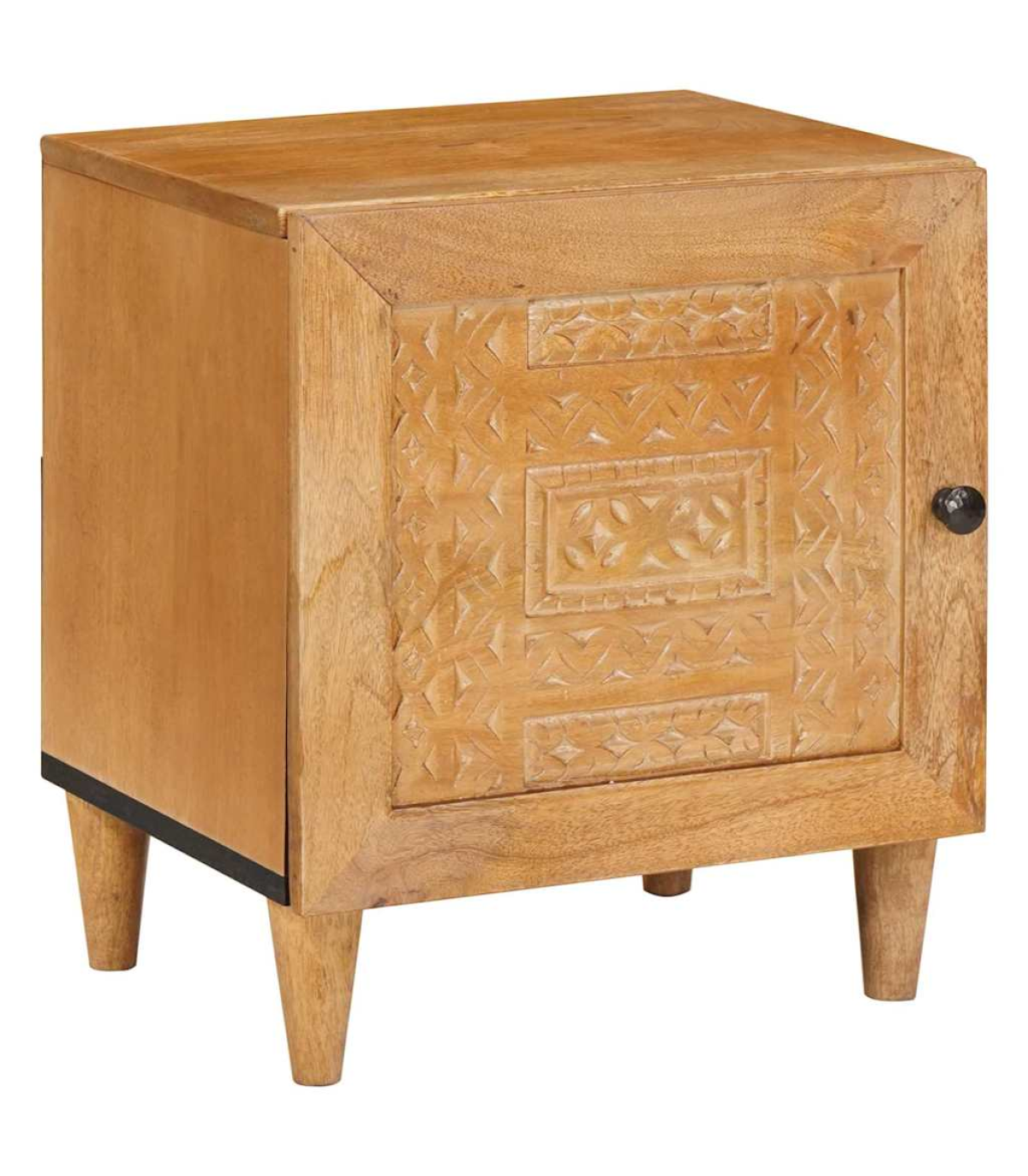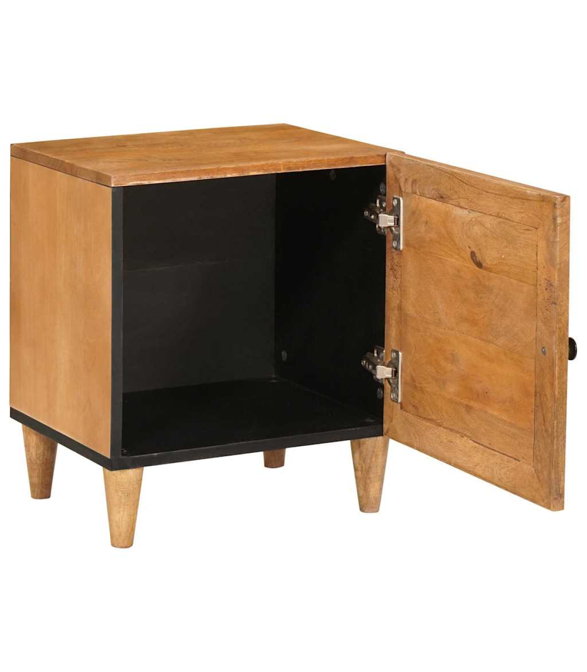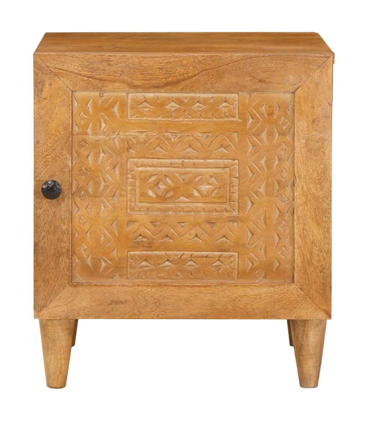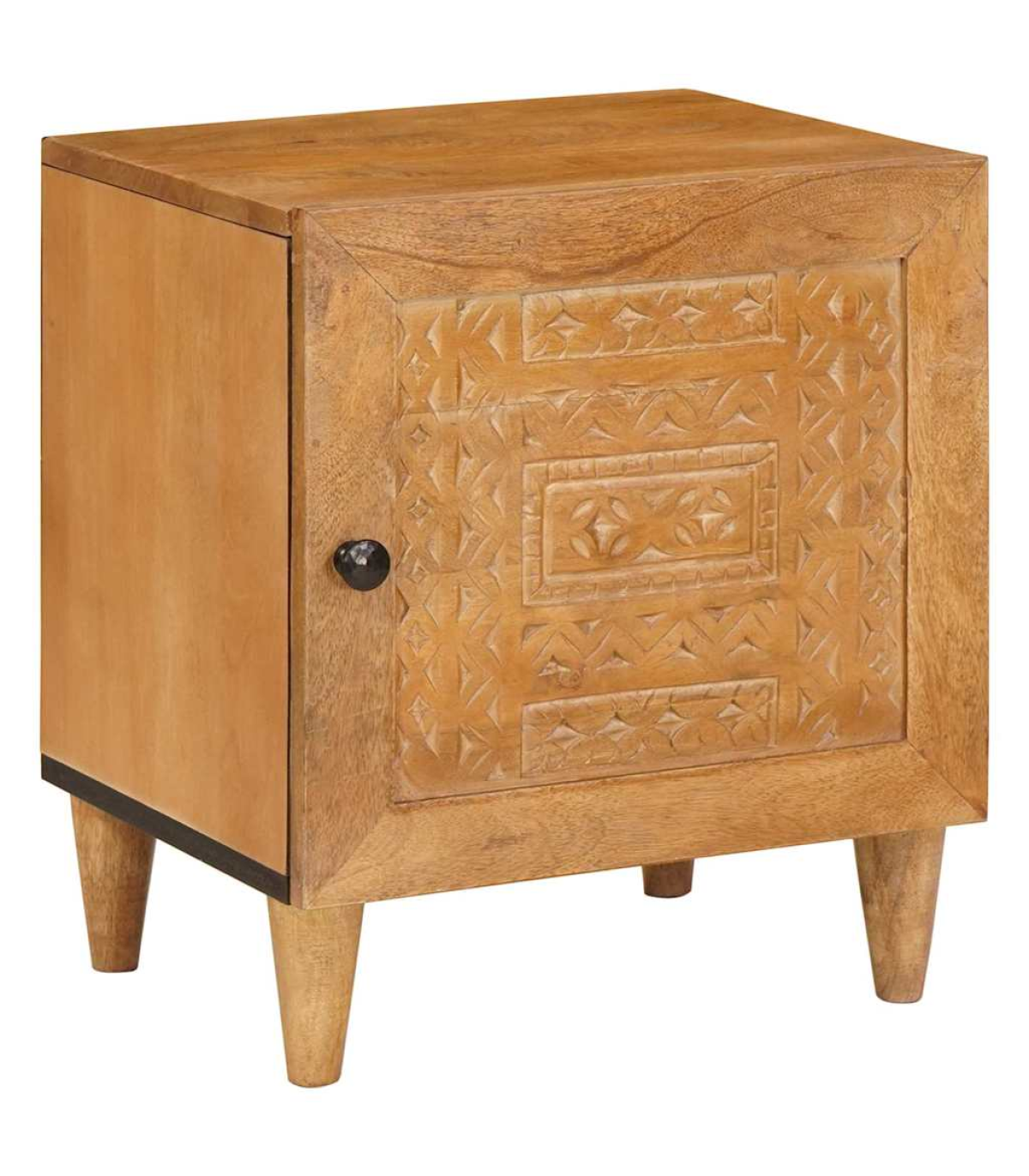 This rustic bedside table is a fab mix of practicality and style, perfect for your living room or bedroom. Made from solid mango wood, it has a warm, textured finish that adds loads of character to your space. Its compact rectangular shape fits snugly next to your bed, making it a handy spot for your lamp, alarm clock, or personal bits and bobs. The matte finished frame adds an elegant touch, and its simple style complements all sorts of interior decor. Materials: The table is made from durable solid mango wood, featuring a textured surface that showcases the natural grain and rich tones. Its rugged beauty fits right in with the rustic vibe, making it a strong and stylish piece for any room. Included Components: There’s a single storage compartment covered by a hinged door with a matte finish knob, offering practical space to stash your stuff. The back is unfinished for wall placement, ensuring strength and stability. The tapered legs add a nice silhouette while providing solid support. Features / Function / Design: With its rustic style, this table isn’t just a storage solution; it brings a cozy, natural vibe to your room. Its sturdy frame, hinge door, and practical size make it perfect for storing your night-time essentials in small spaces. Recommended Uses: Great for bedrooms or living rooms, this compact table can easily serve as a nightstand or a side table next to sofas and armchairs, blending functionality with style. Its versatility suits different room decors, adding charm wherever it sits. Care & Maintenance: To keep the table's rustic charm, just wipe it down with a dry cloth to dust it off. Avoid harsh cleaners or abrasives that could damage the surface, ensuring it stays beautiful for the long haul.