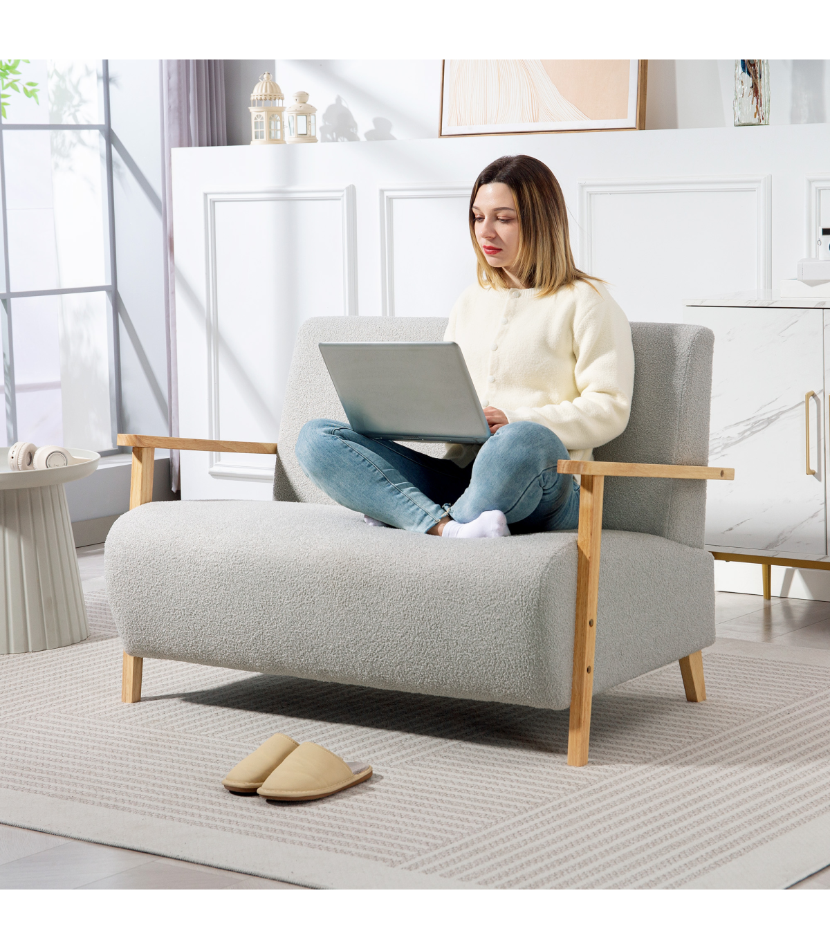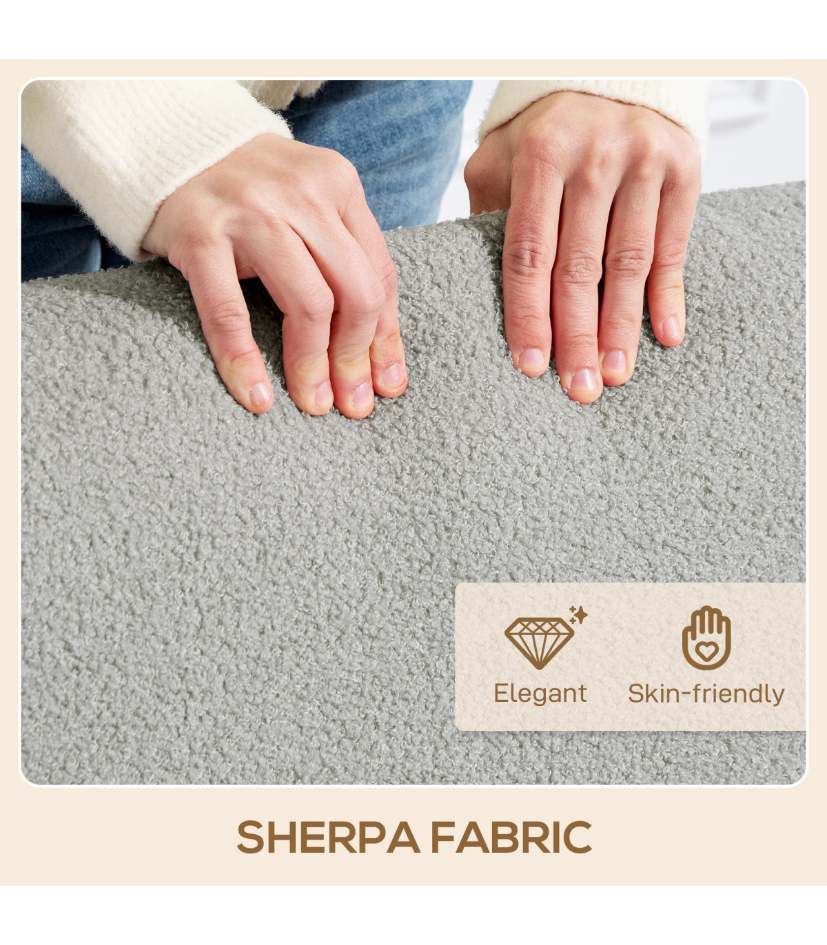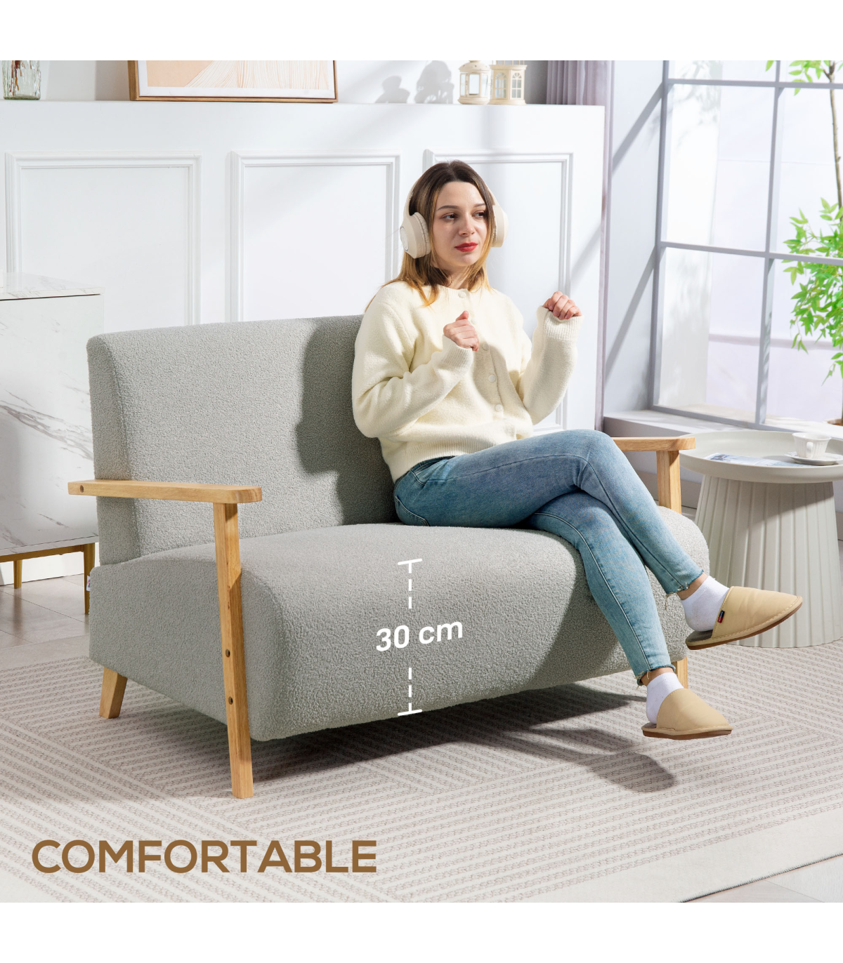 - Sherpa fabric cover offers a plush, cosy feel. Rubber wood armrests and legs add a touch of elegance