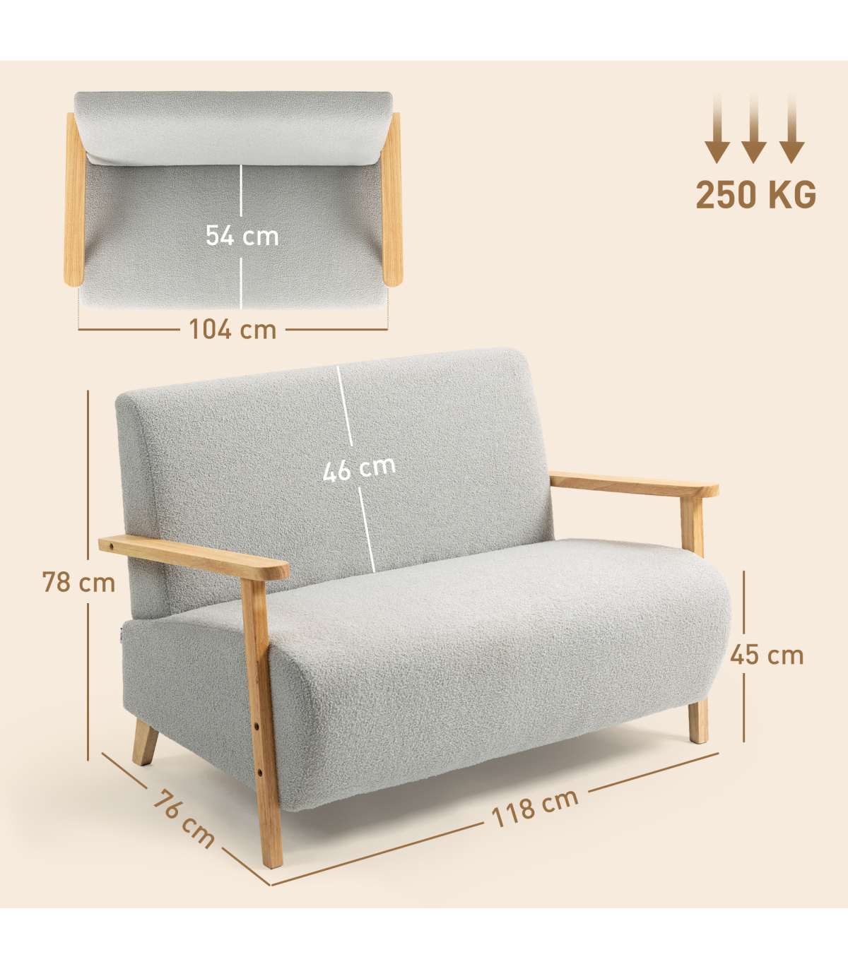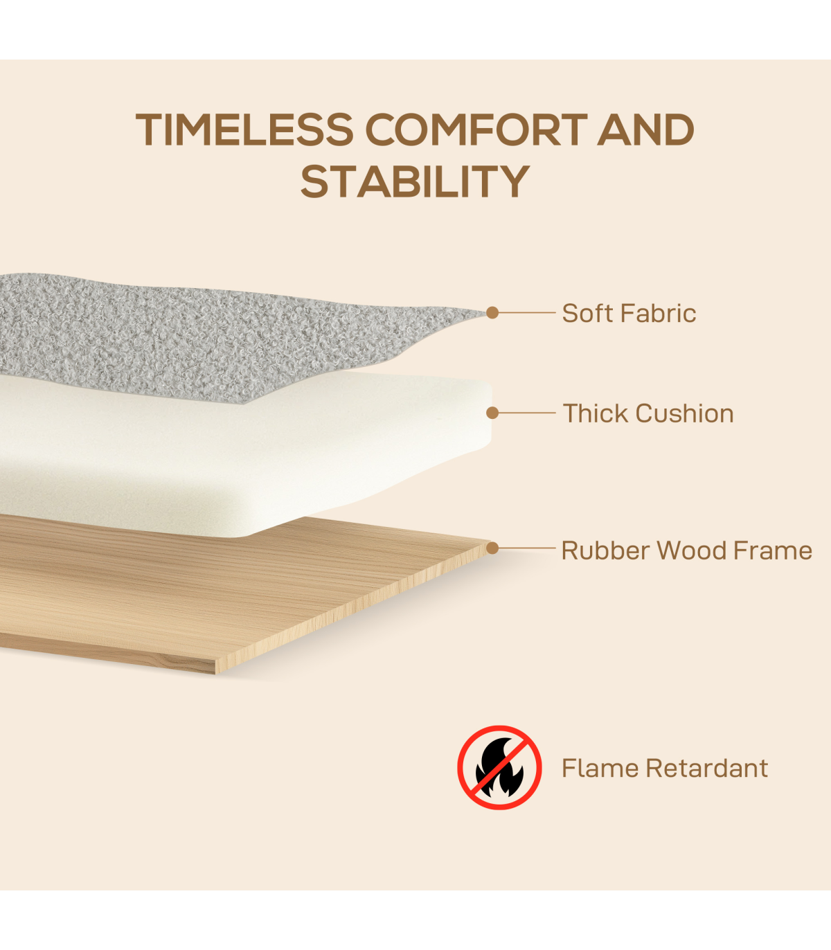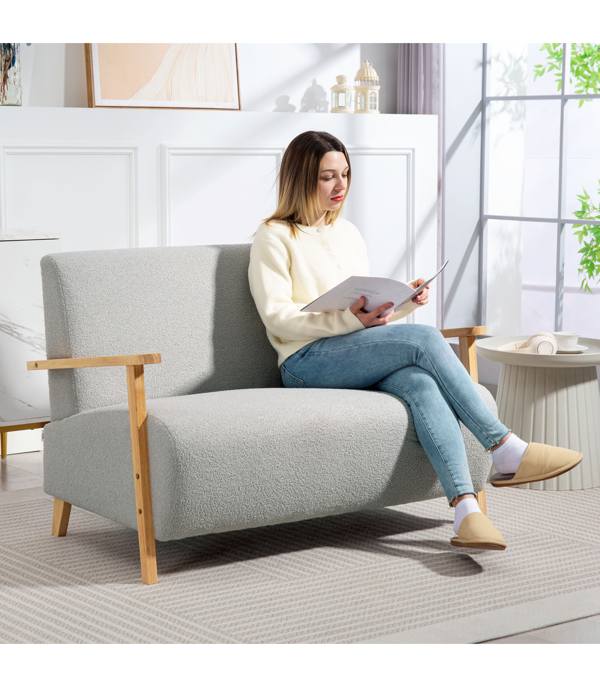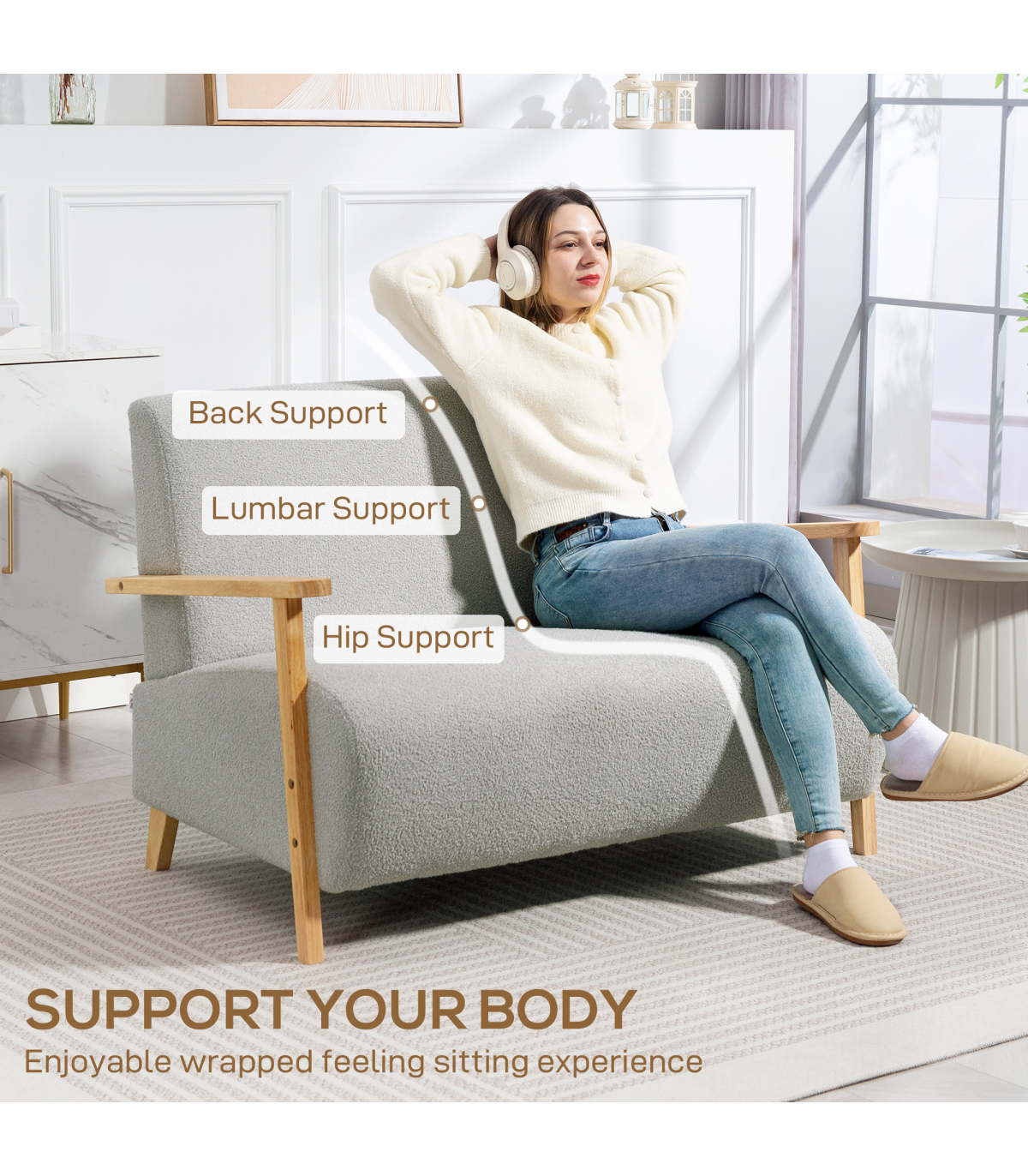 - Sherpa fabric cover offers a plush, cosy feel. Rubber wood armrests and legs add a touch of elegance