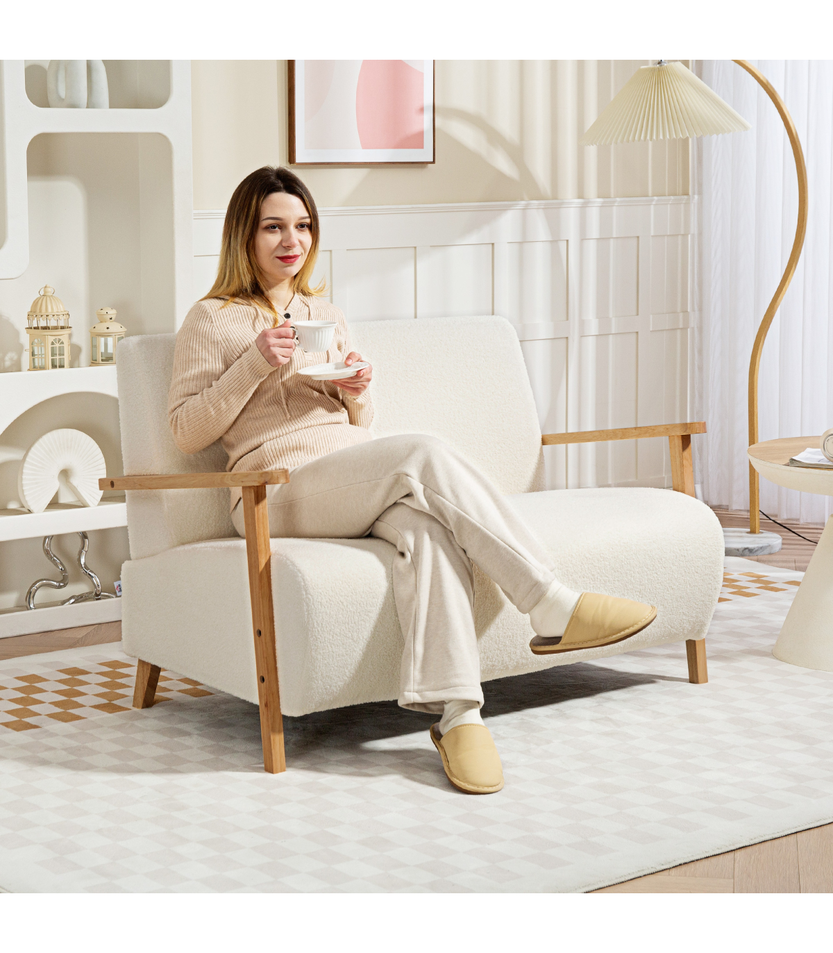 - Sherpa fabric cover offers a plush, cosy feel. Rubber wood armrests and legs add a touch of elegance