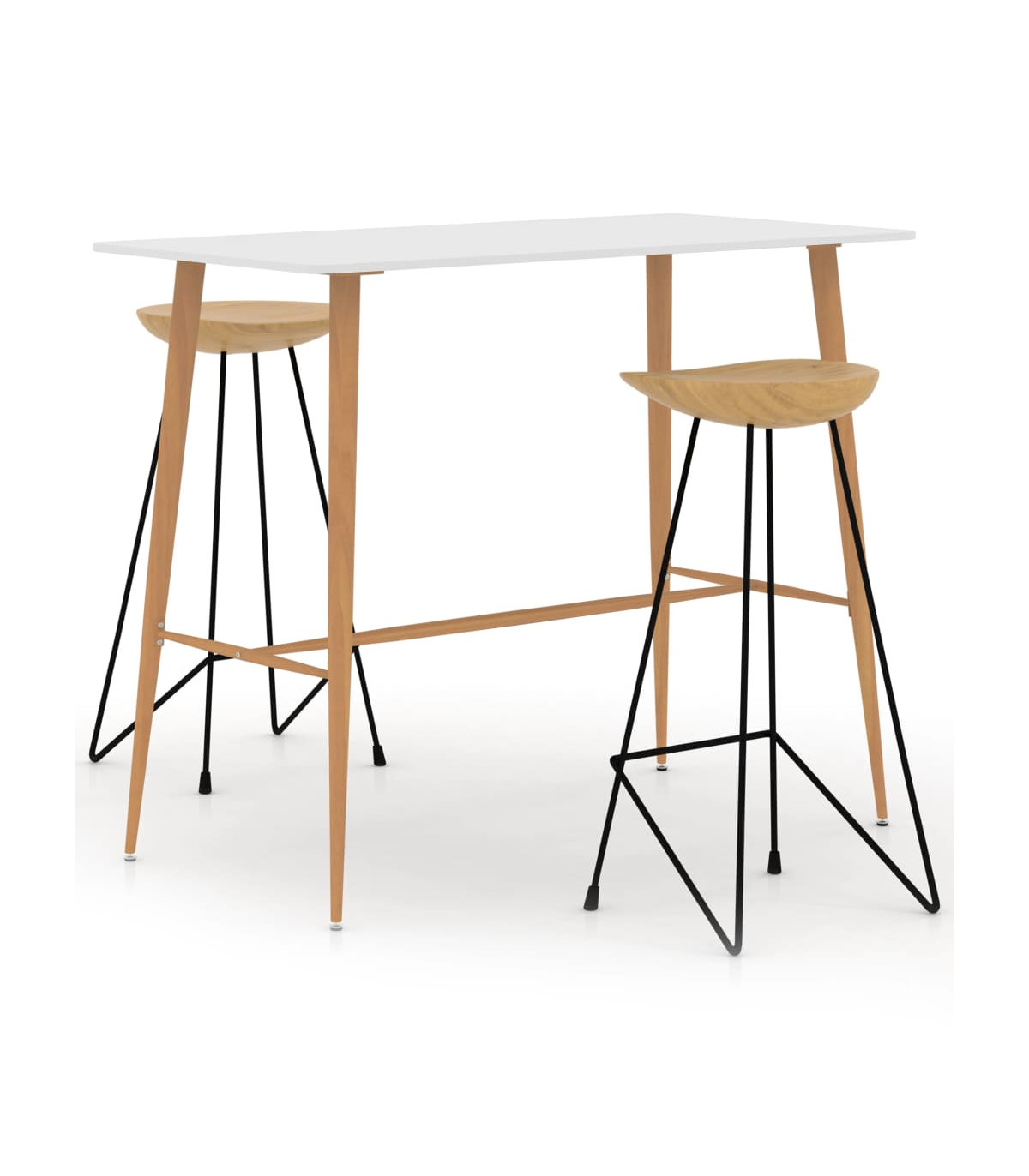 Chat with your friends or have a drink while relaxing on this bar set! This bar table features an MDF tabletop and strong metal legs with a wooden look, making it easy to clean. These bar stools, constructed from solid teak wood, have been seasoned, kiln-dried and fine sanded to give a smooth appearance. Teak wood is known for its exceptional strength, making it the perfect choice for you to have a long-lasting piece of furniture. Additionally, the legs are made of durable iron, which ensures their sturdiness.