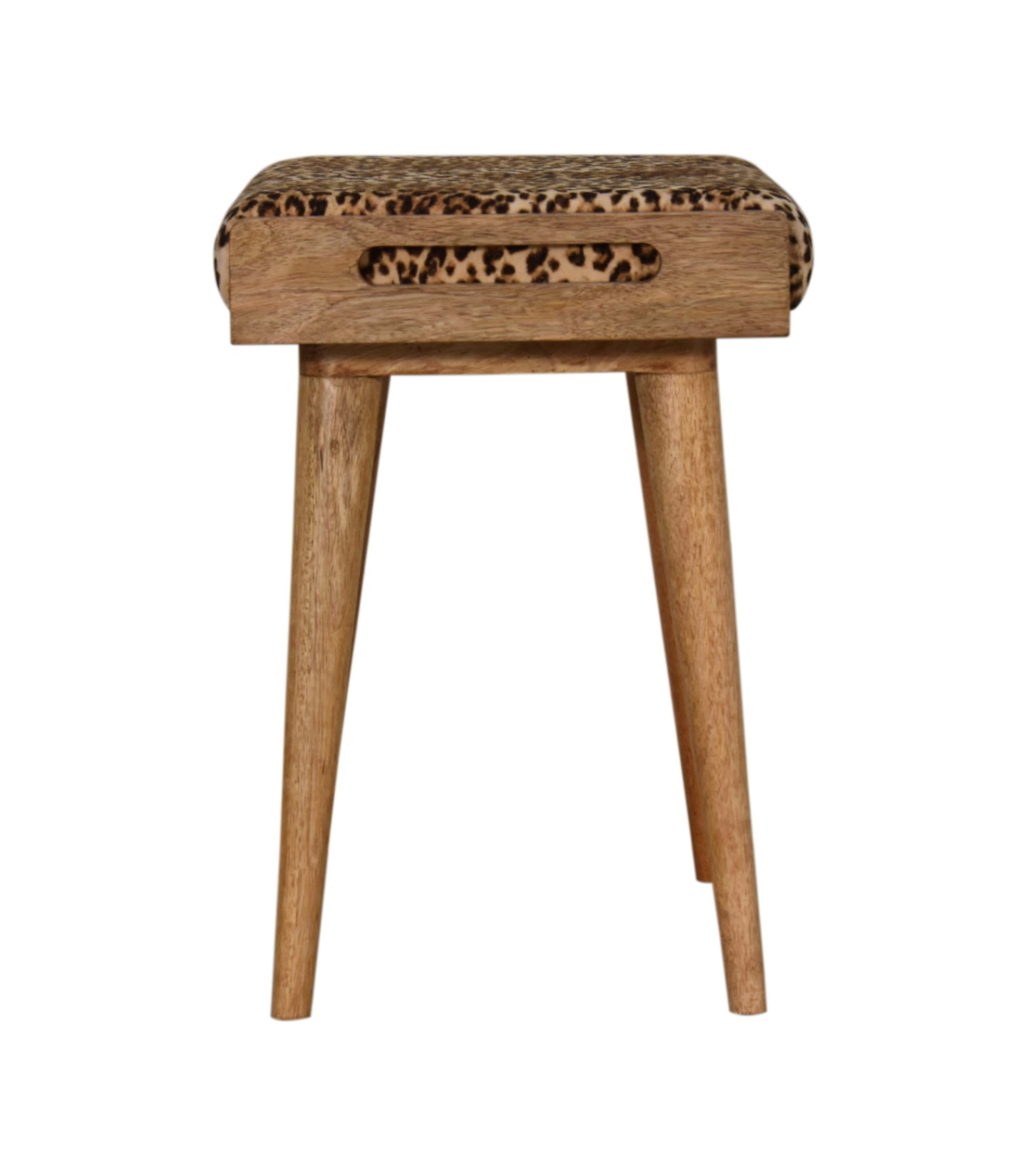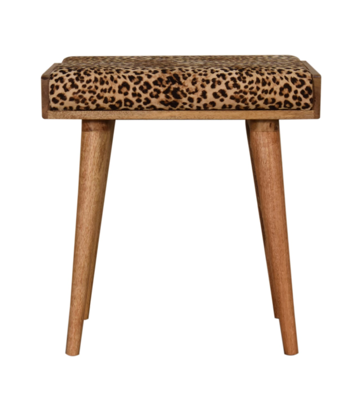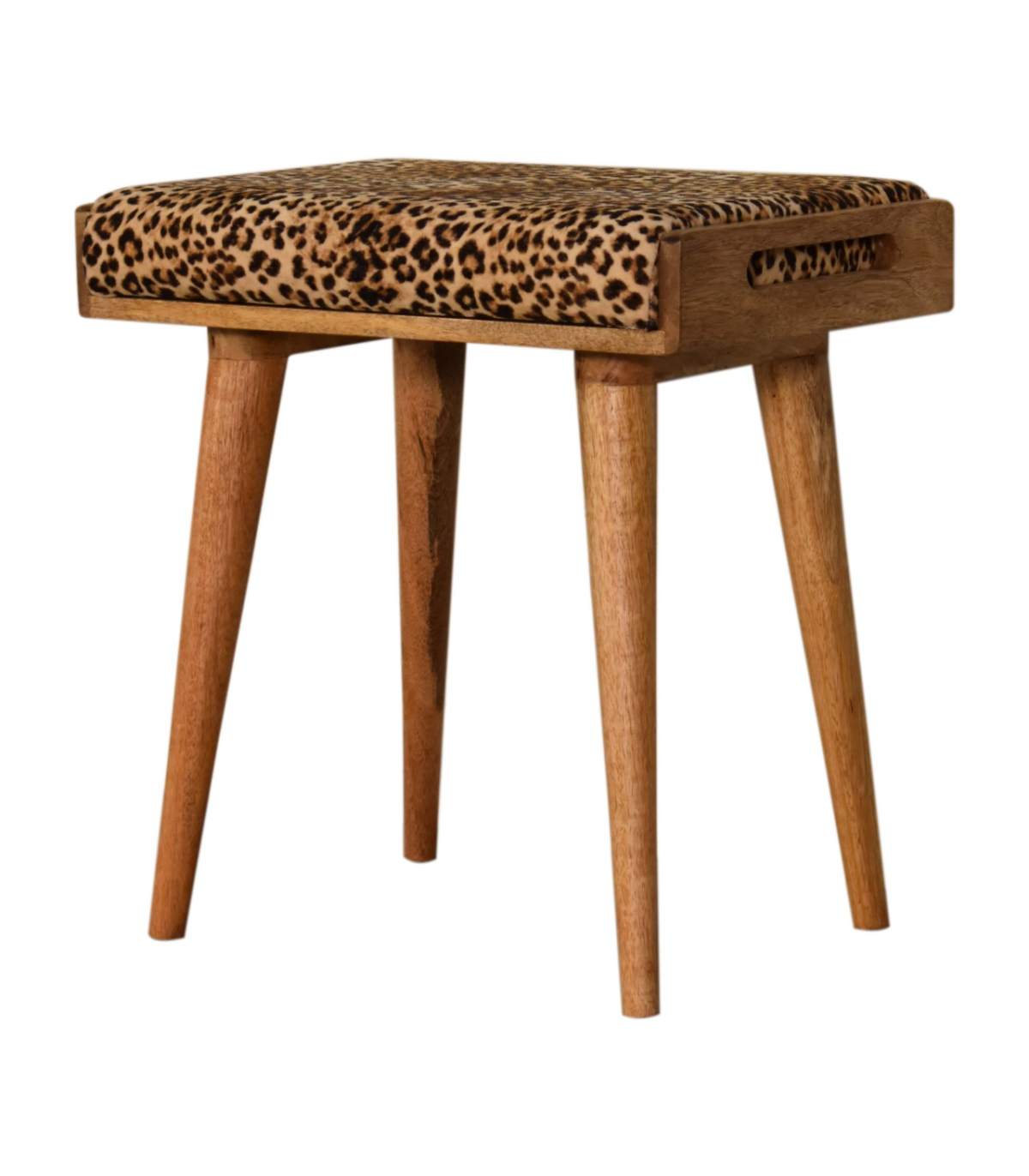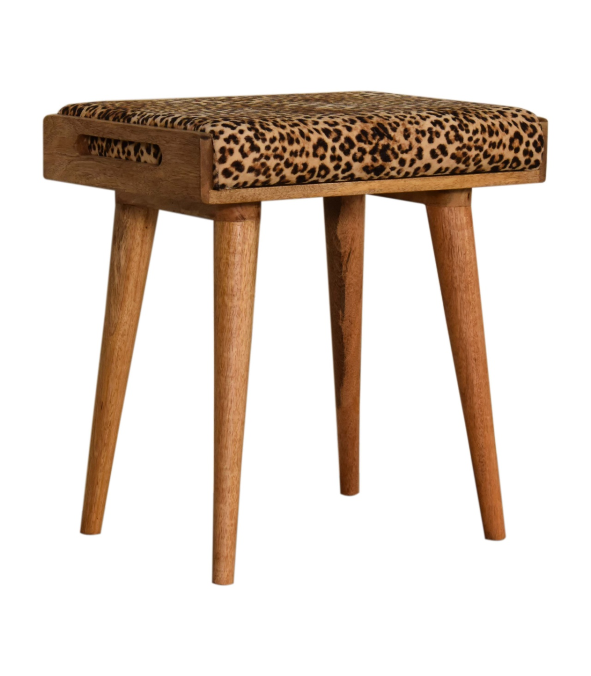This footstool features a tray-style design and 4 Nordic-style legs constructed from 100% solid mango wood. It has an upholstered animal print leopard top that works as a comfortable seat and can be incorporated into many different interior styles as it offers a very clean and modern design, along with providing a nice contrast between the material and wood.