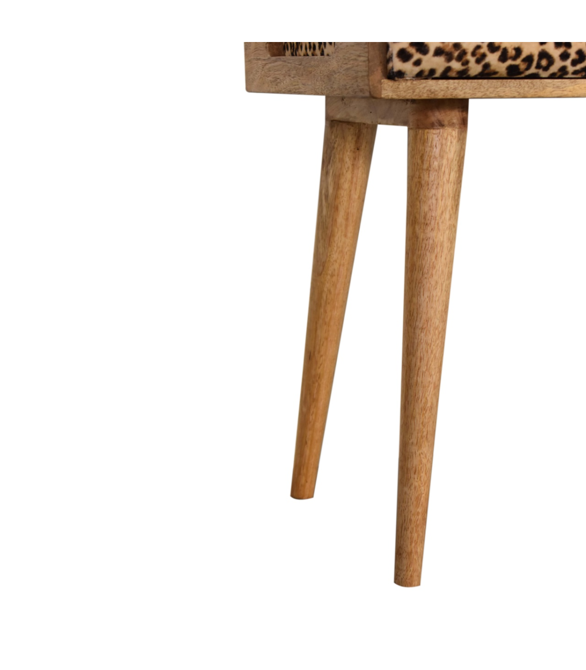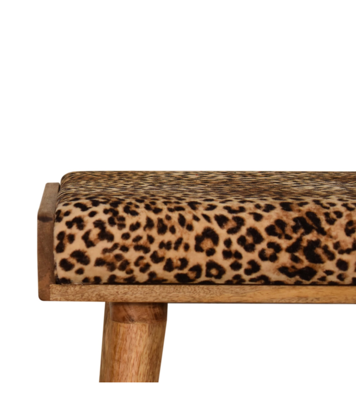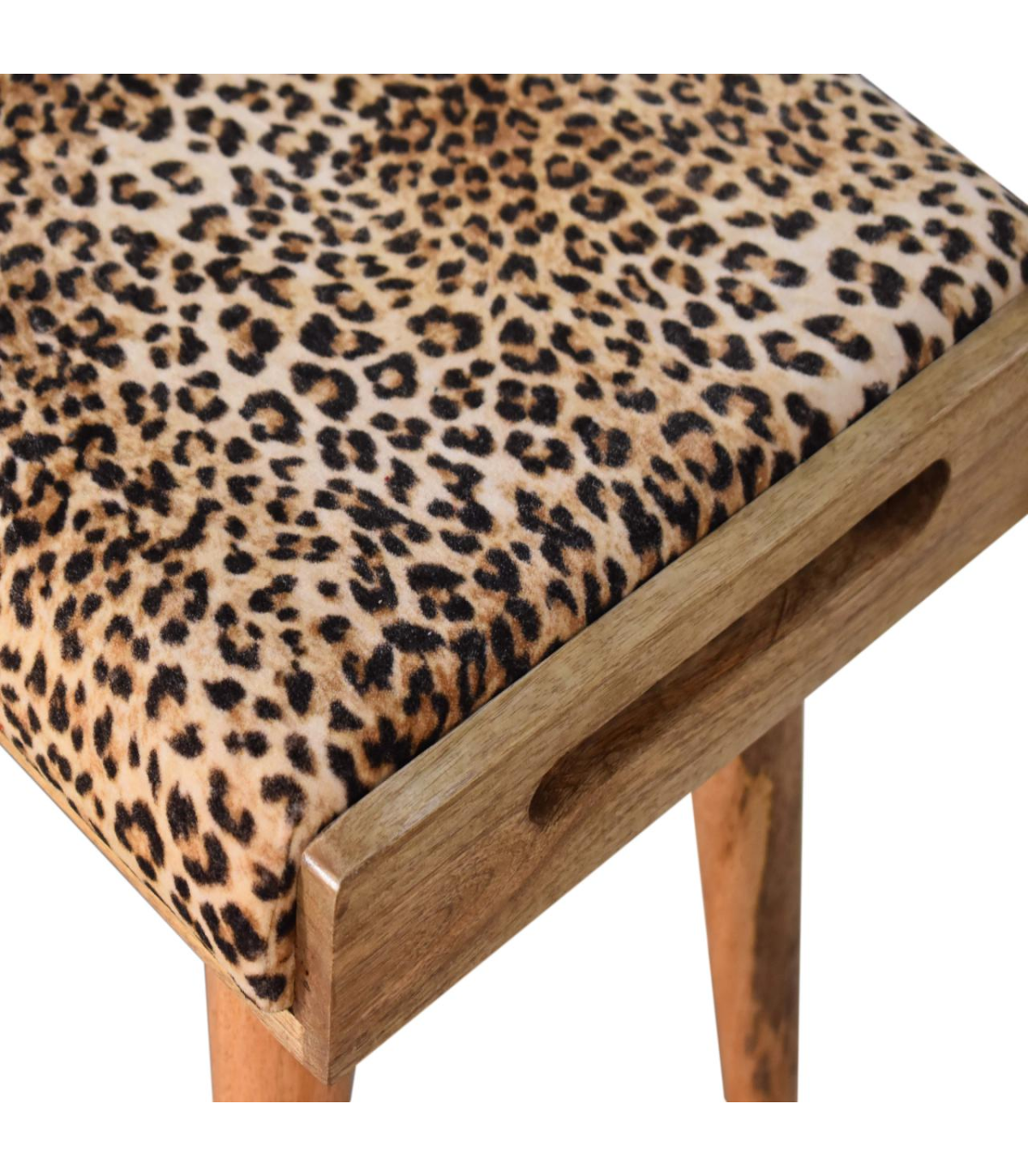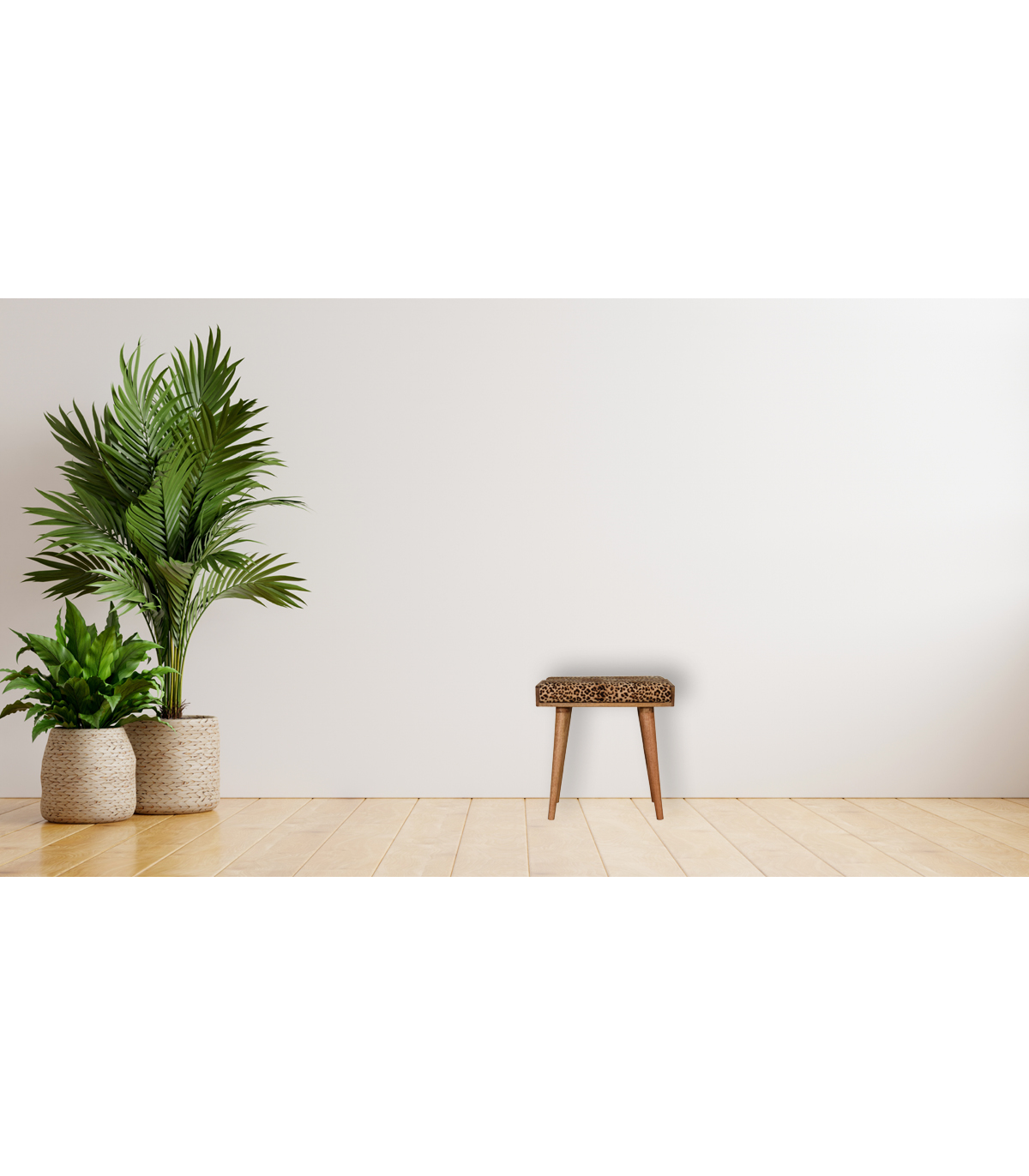 This footstool features a tray-style design and 4 Nordic-style legs constructed from 100% solid mango wood. It has an upholstered animal print leopard top that works as a comfortable seat and can be incorporated into many different interior styles as it offers a very clean and modern design, along with providing a nice contrast between the material and wood.
