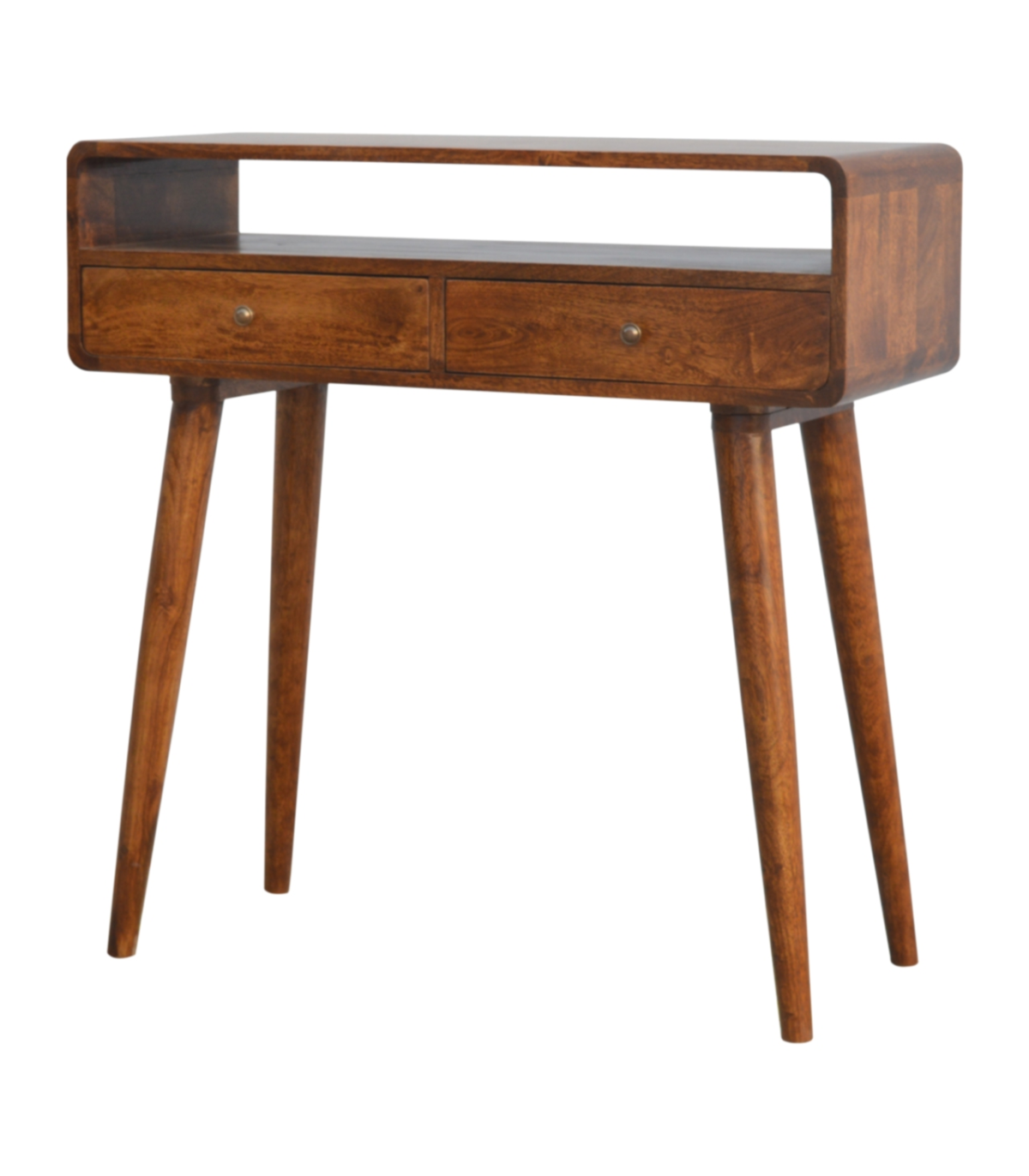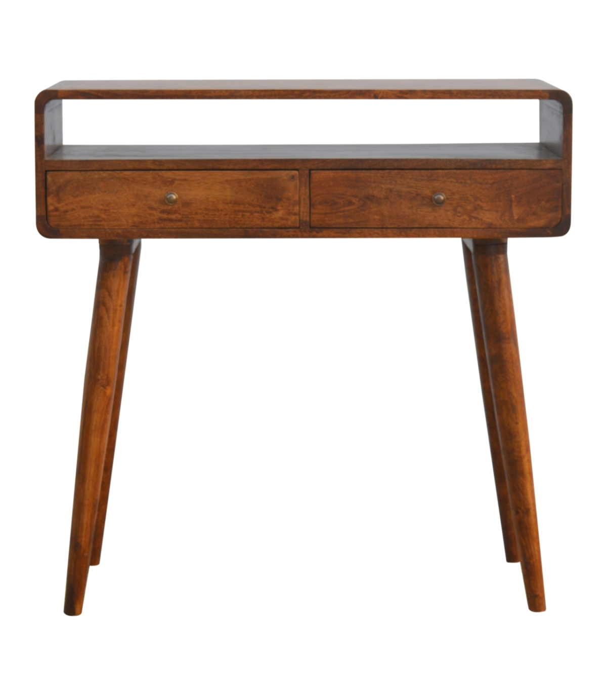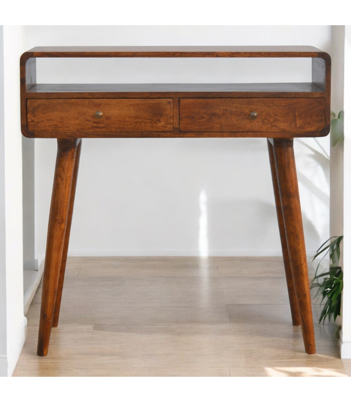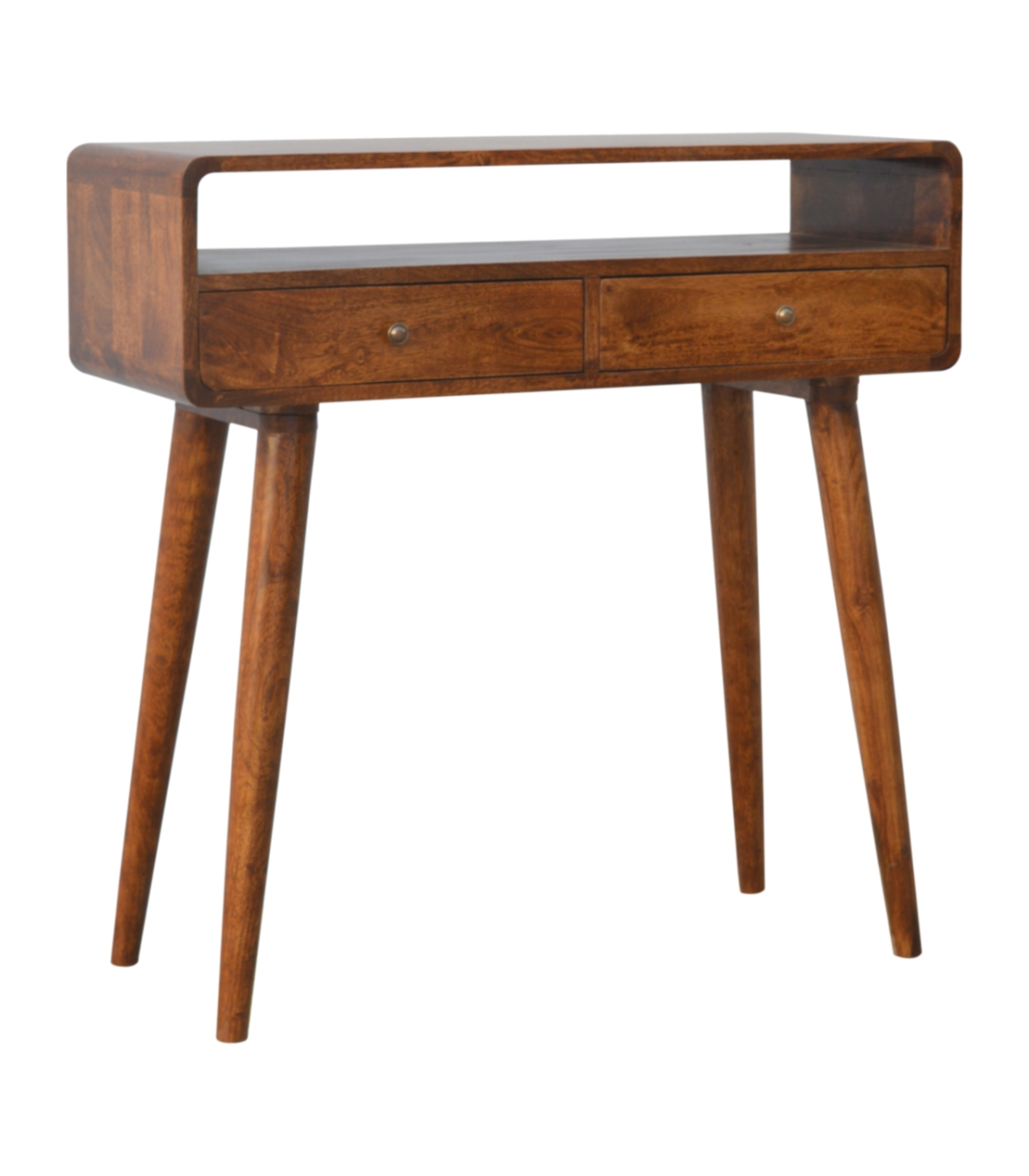 This simple, elegant console table has beautifully curved edges to fit perfectly in any living space, this 100% solid mango wood unit has been built with sustainably sourced timbers and has two drawers and 1 open slot to help you keep your home organized and storing any little household objects. It has shiny knobs and has a fine chestnut finish with 4 Nordic style legs.
