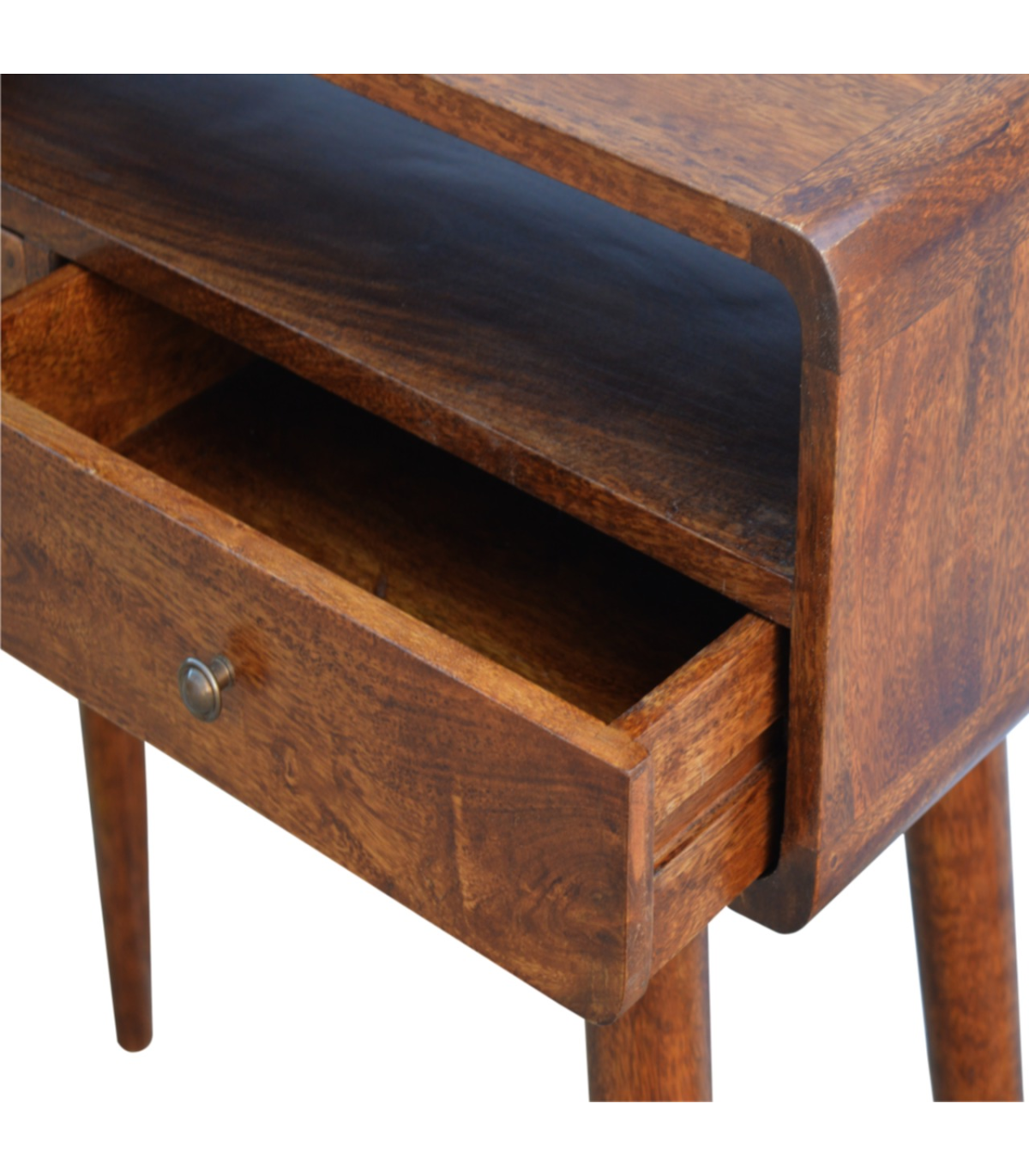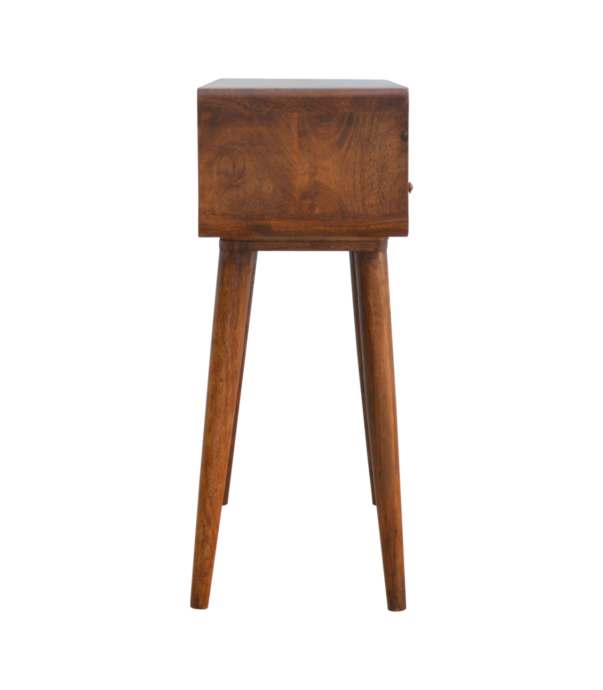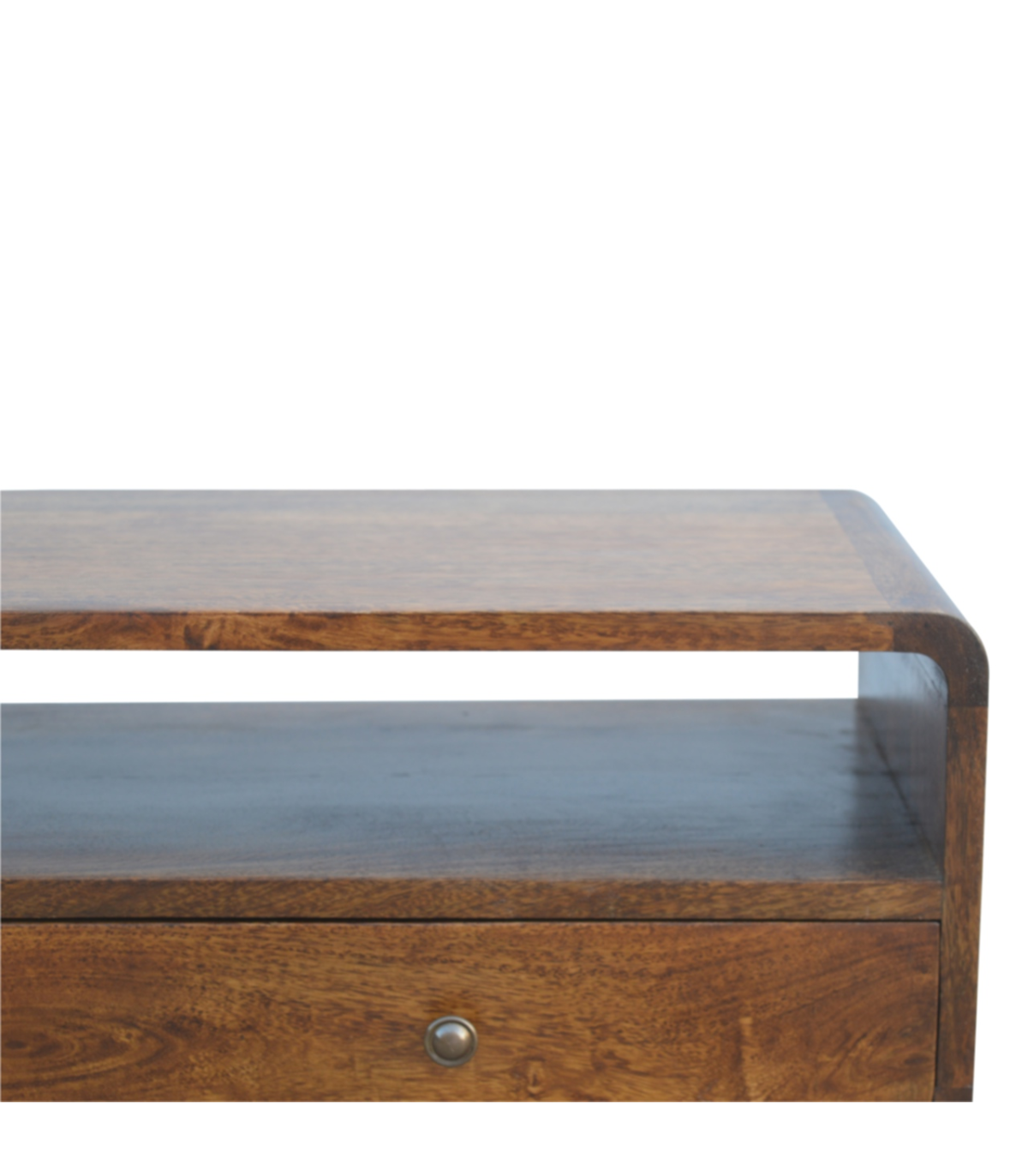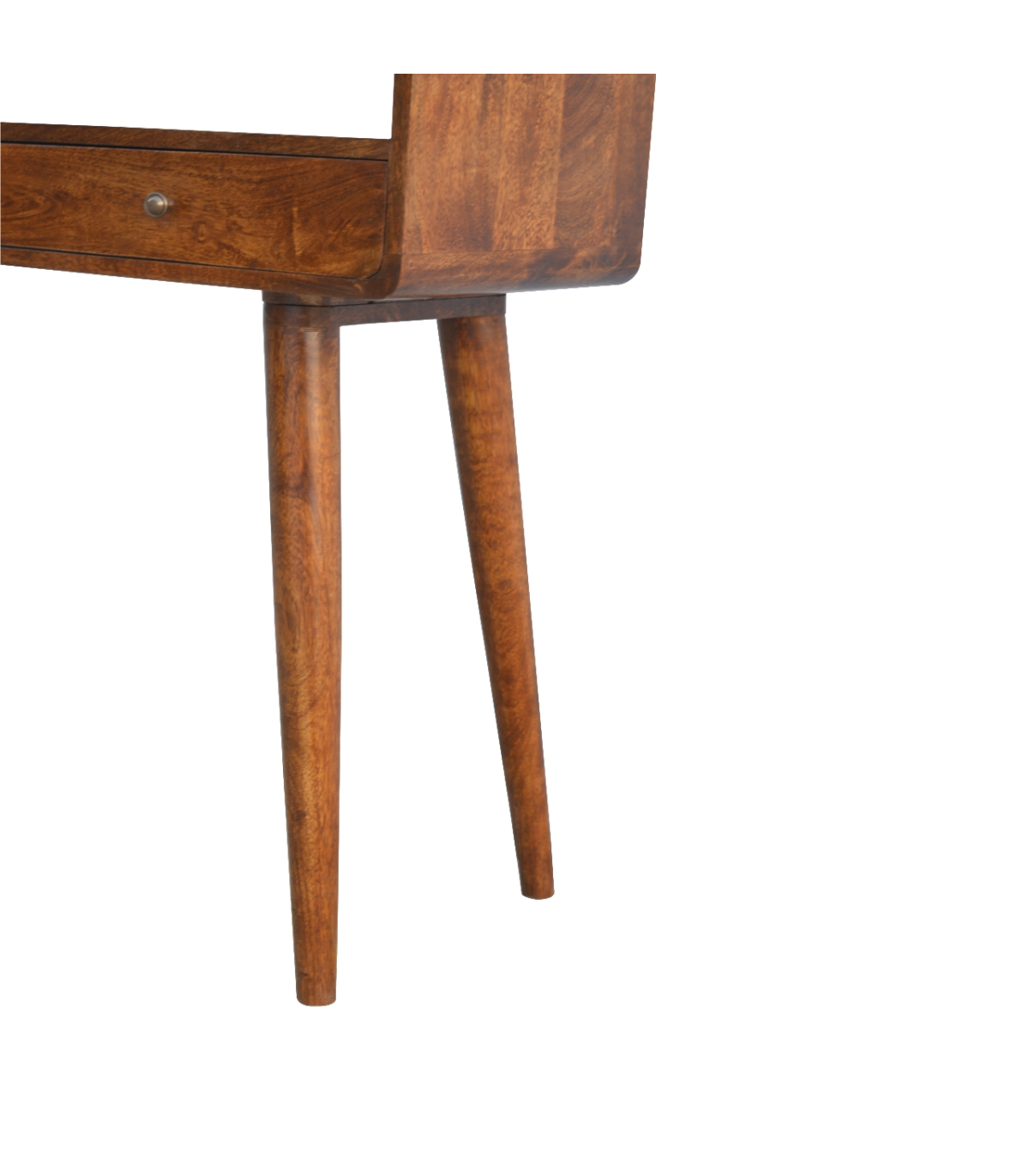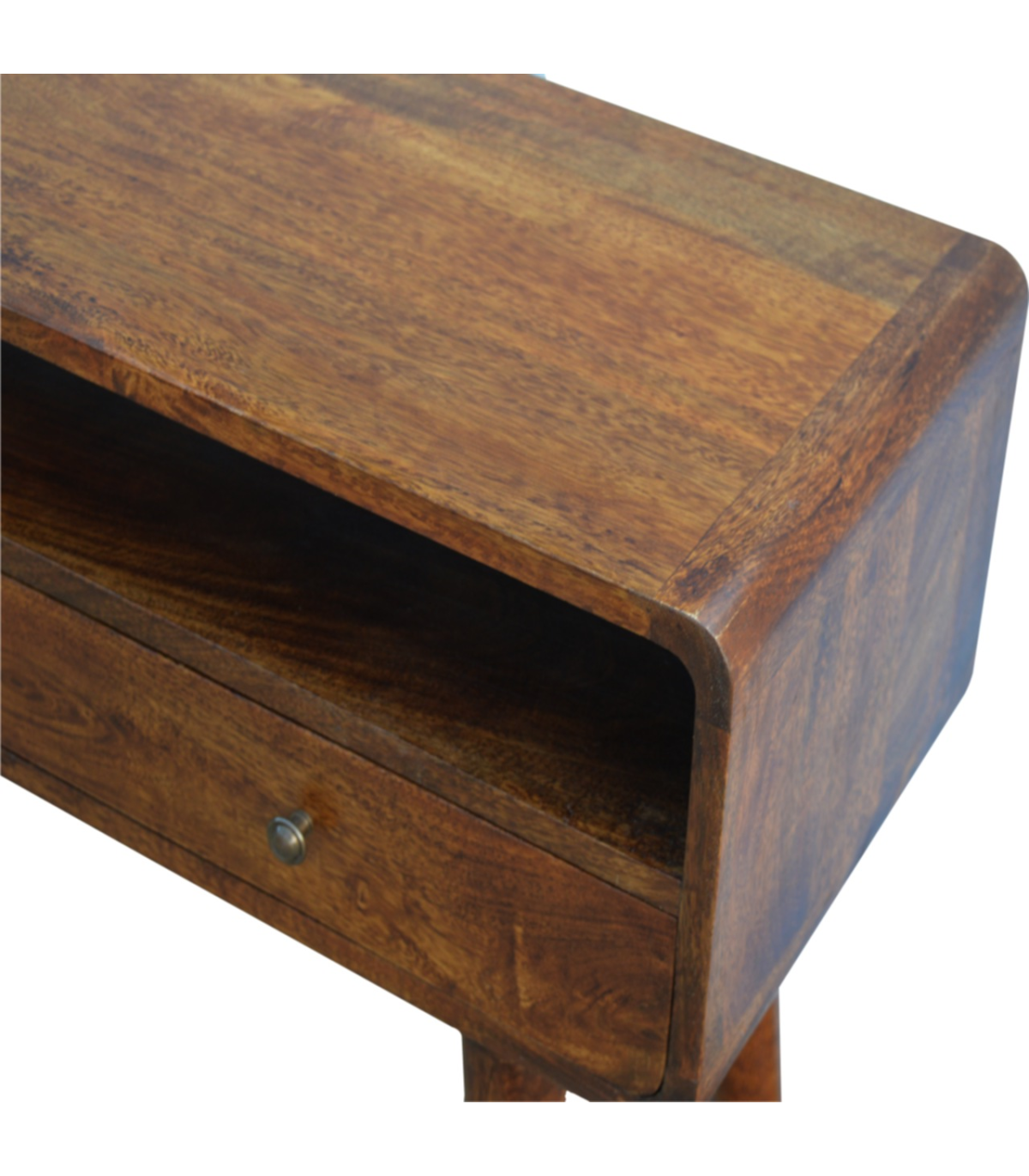 This simple, elegant console table has beautifully curved edges to fit perfectly in any living space, this 100% solid mango wood unit has been built with sustainably sourced timbers and has two drawers and 1 open slot to help you keep your home organized and storing any little household objects. It has shiny knobs and has a fine chestnut finish with 4 Nordic style legs.