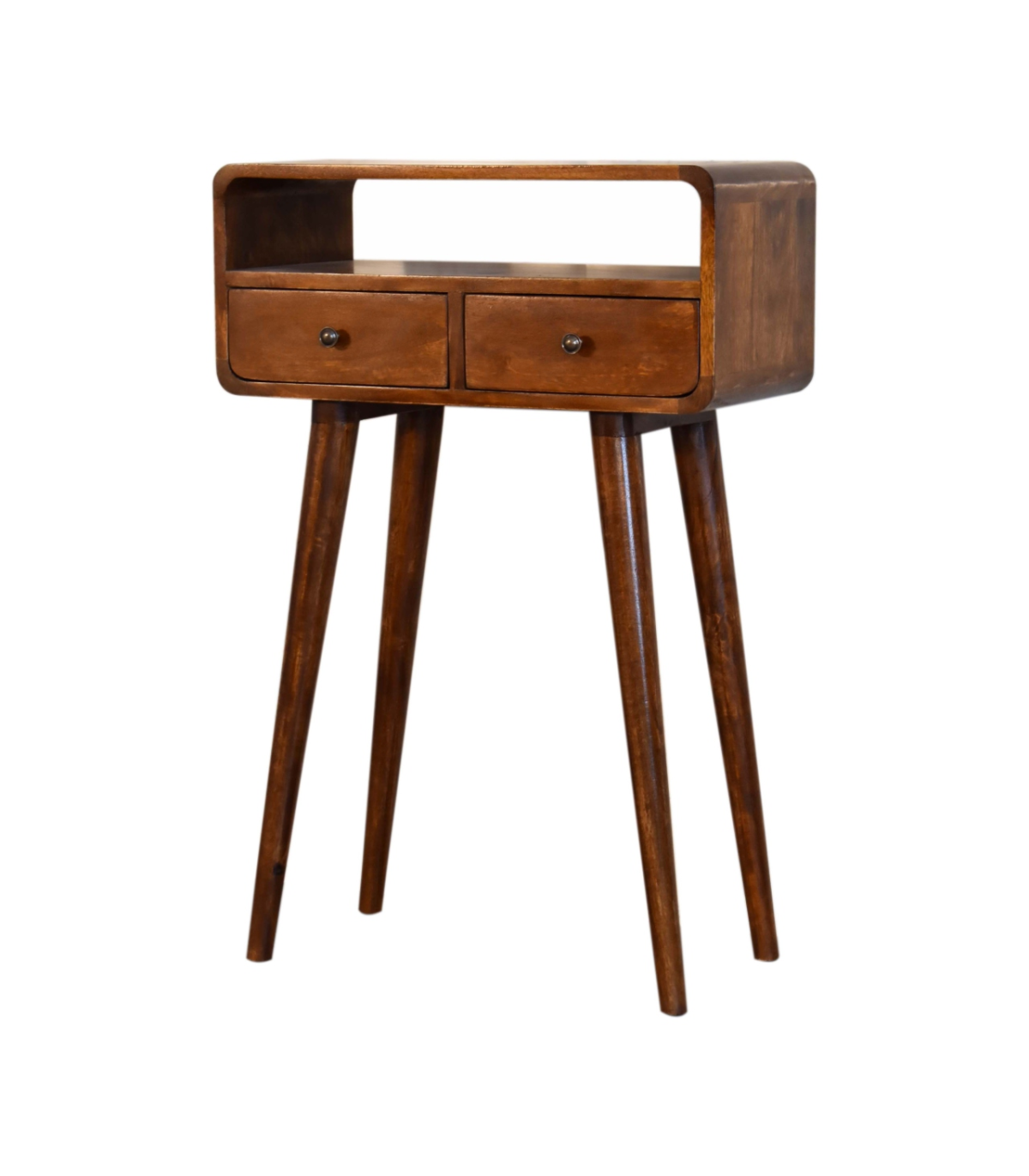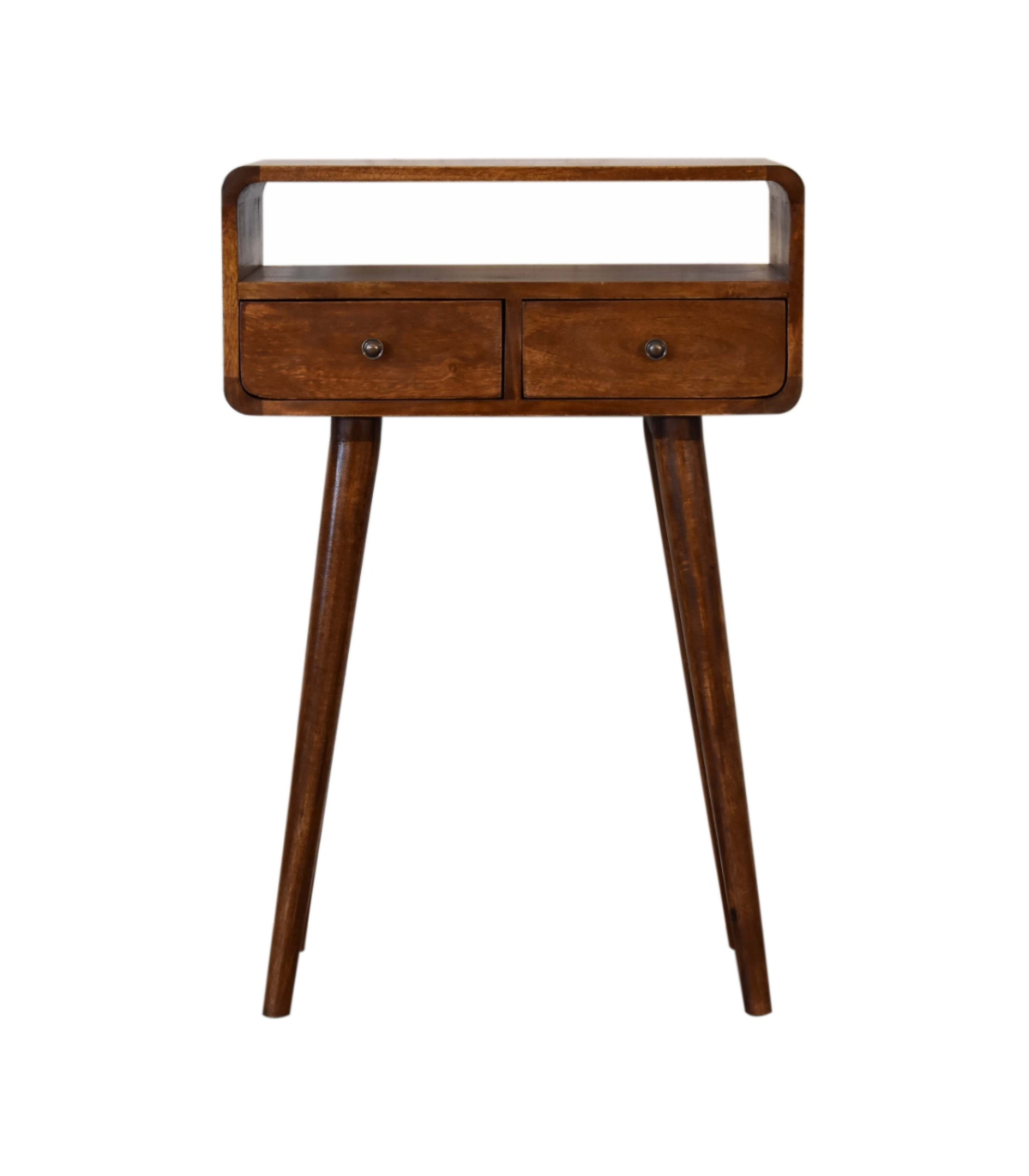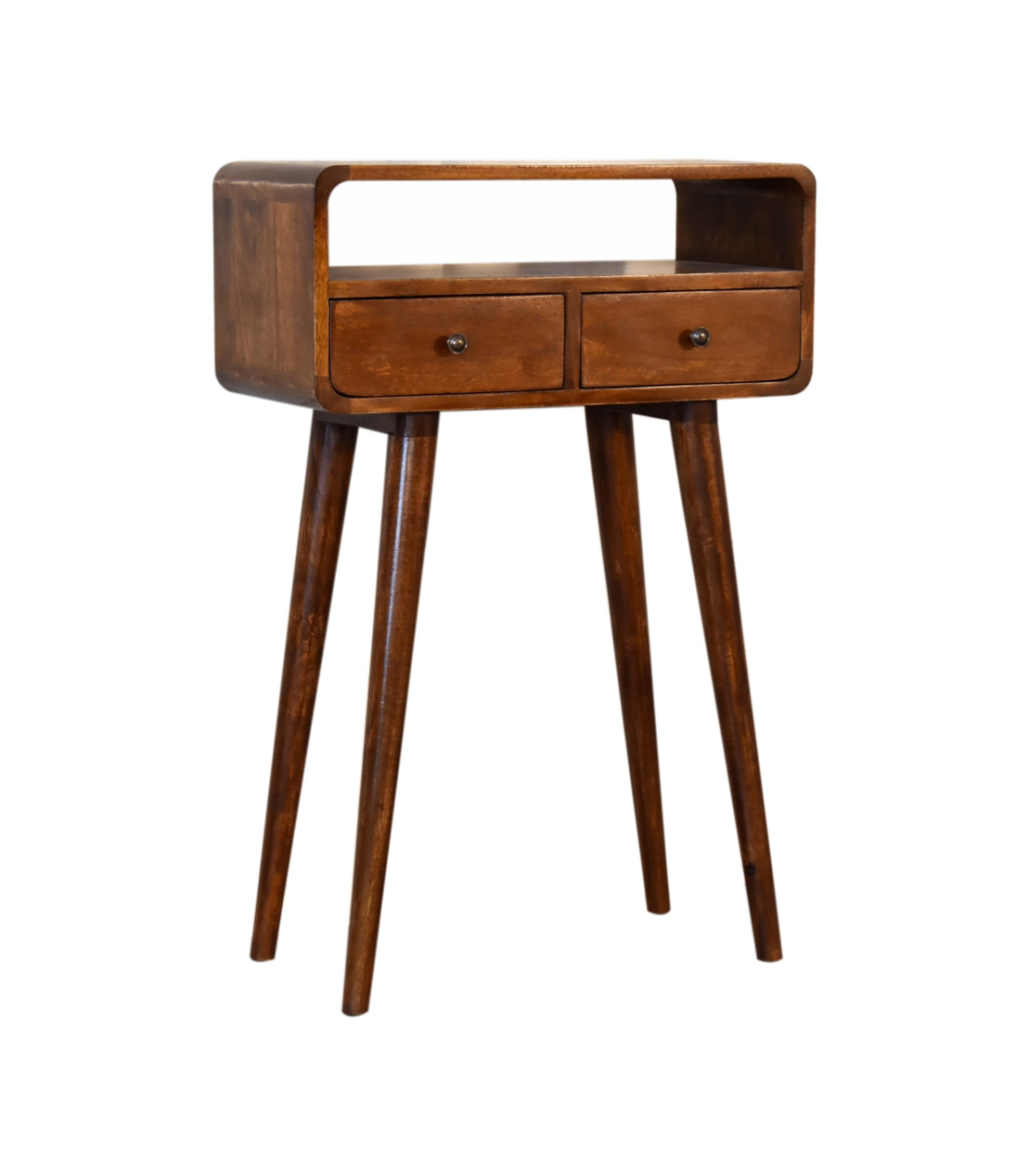 The mini version of our popular IN311, this simple, elegant console table has beautifully curved edges to fit perfectly in any living space, it features two drawers and 1 open slot to help you keep your home and has shiny knobs with a fine chestnut finish and 4 Nordic style legs. This petite product is a part of Recession Collection.