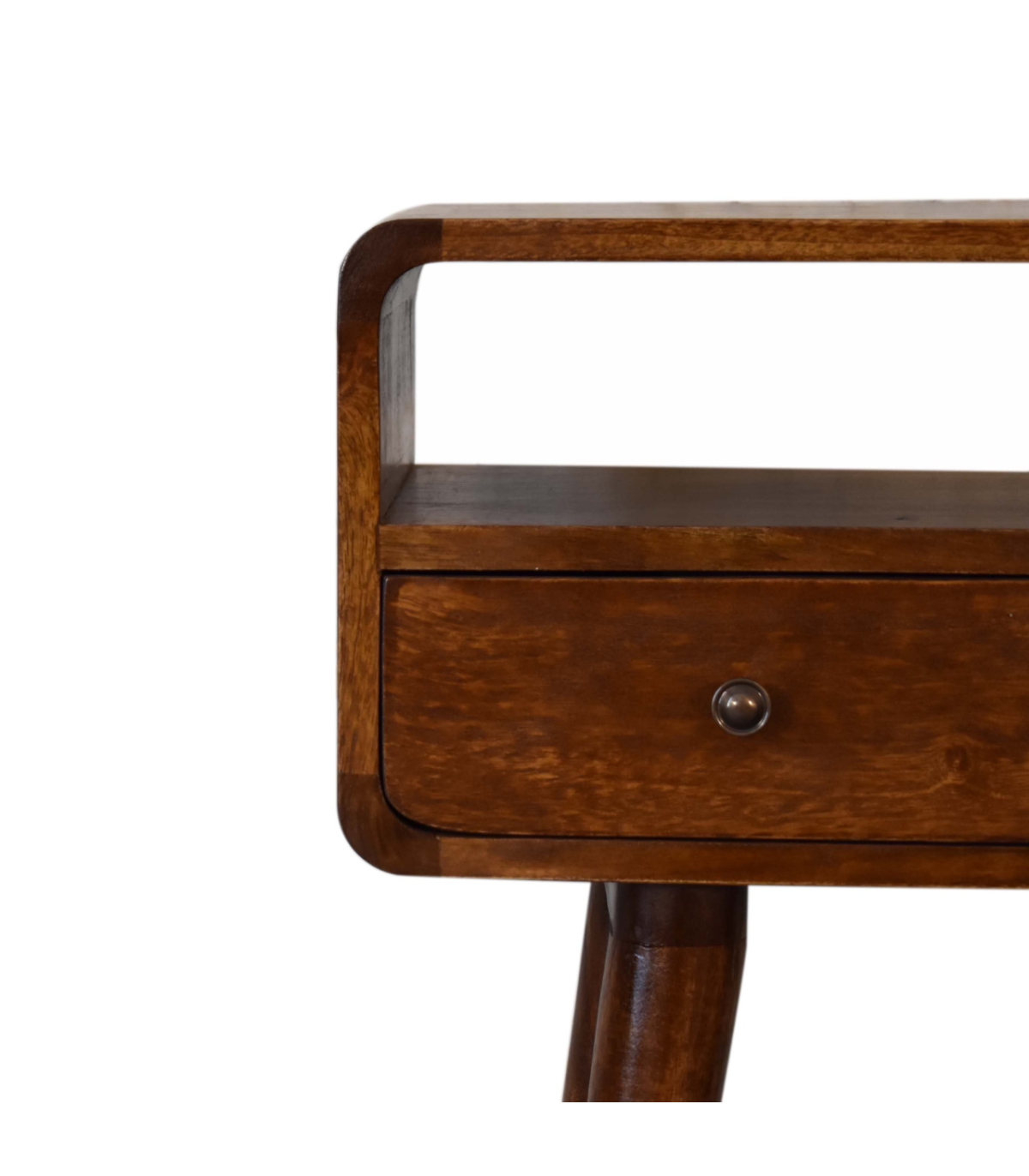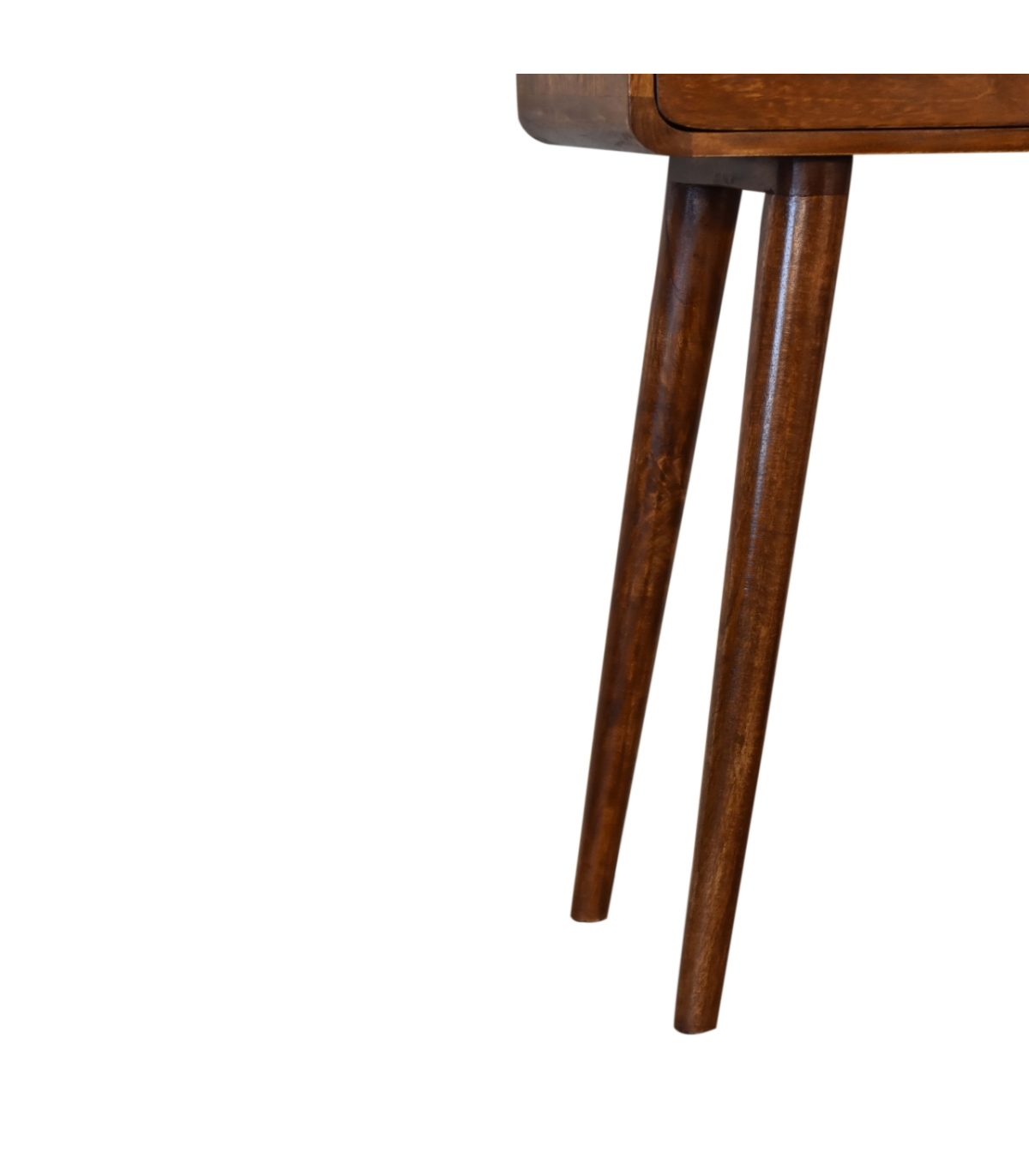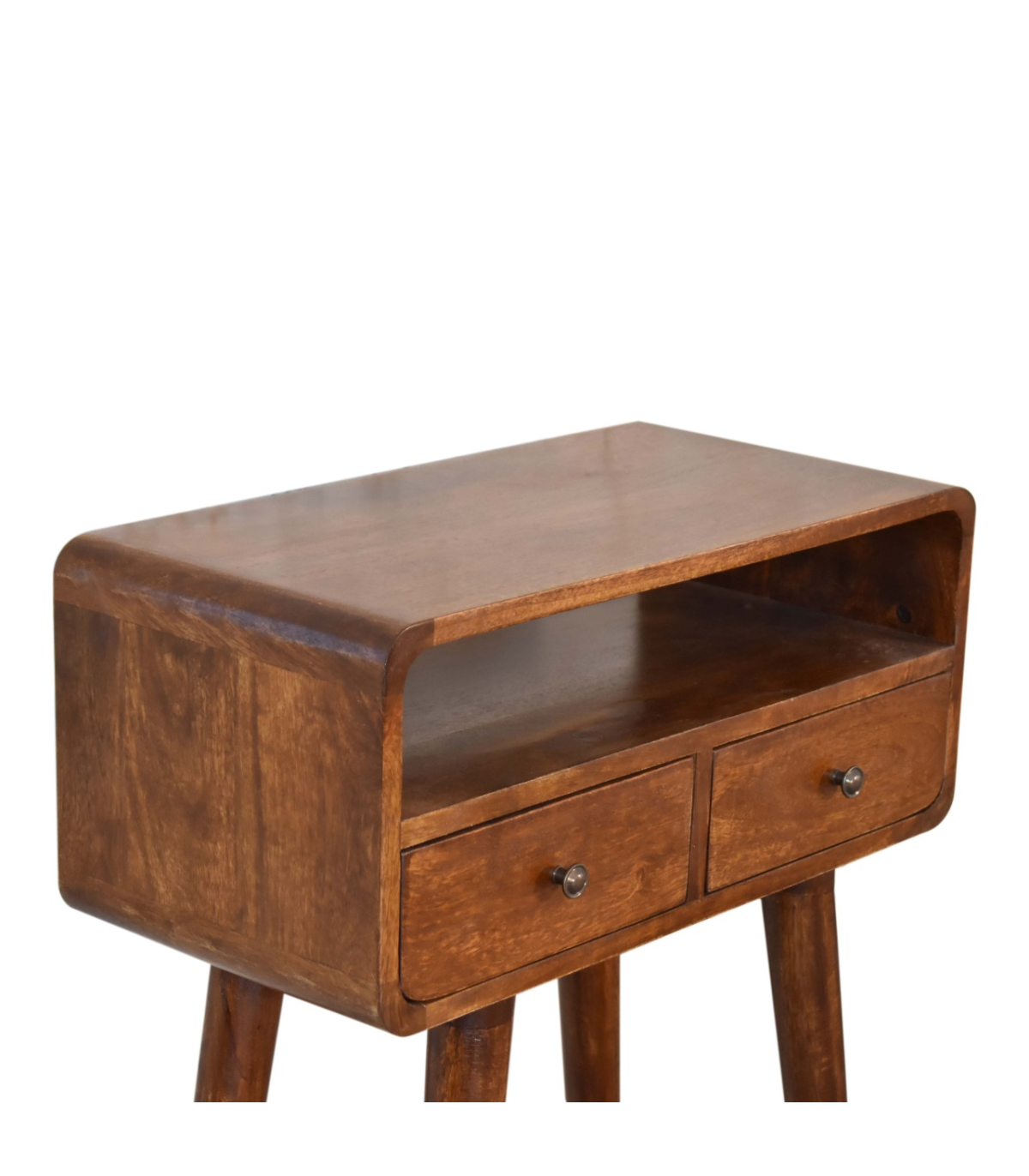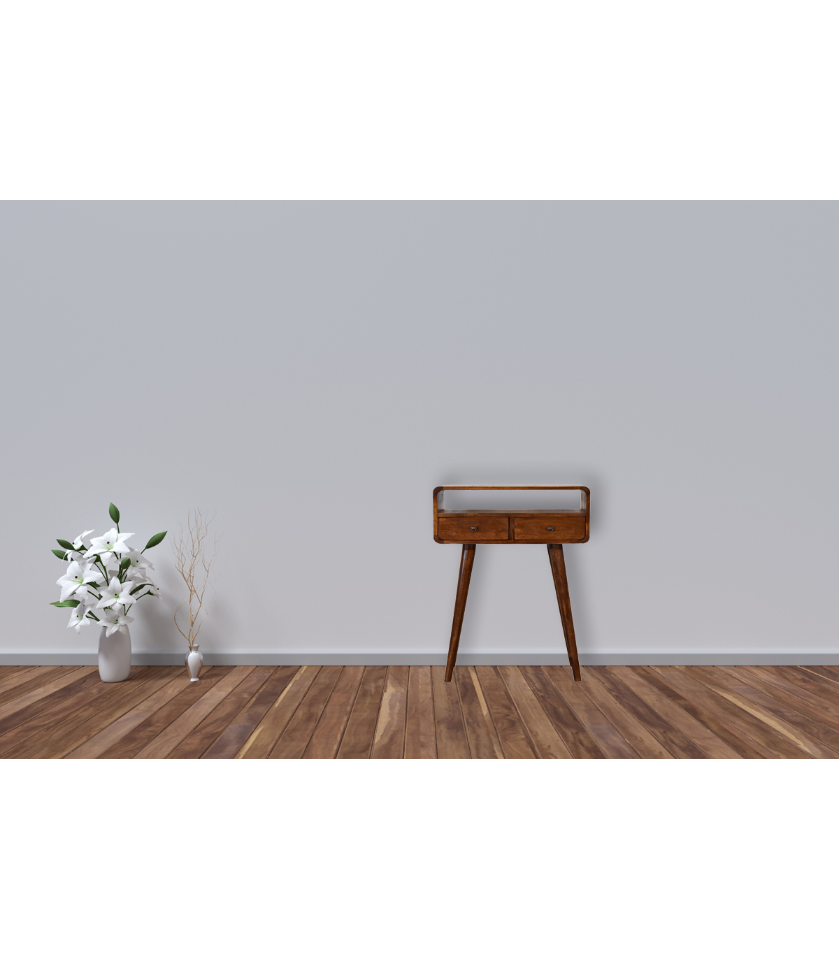 The mini version of our popular IN311, this simple, elegant console table has beautifully curved edges to fit perfectly in any living space, it features two drawers and 1 open slot to help you keep your home and has shiny knobs with a fine chestnut finish and 4 Nordic style legs. This petite product is a part of Recession Collection.