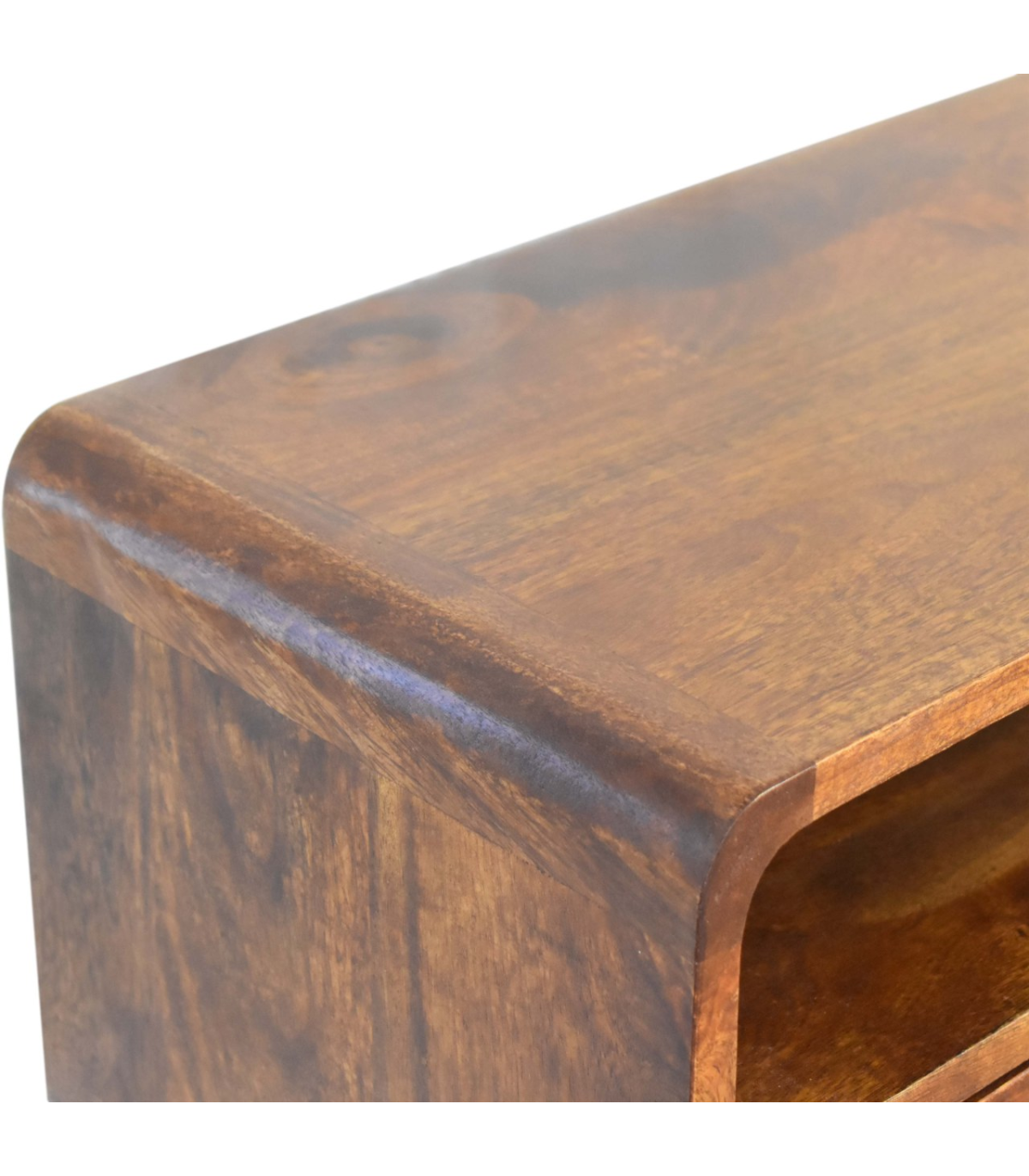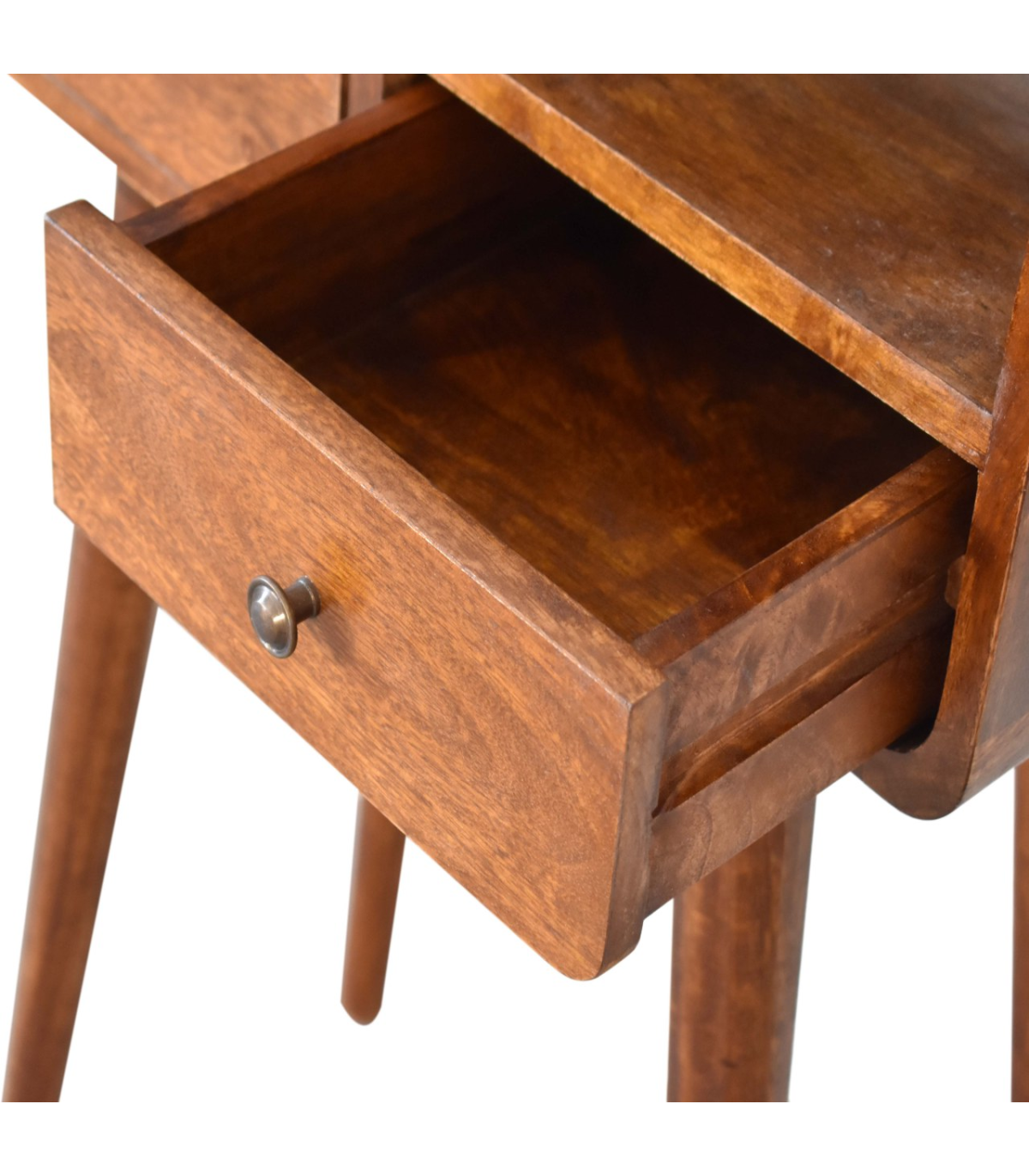 A petite version of our popular IN311 design, this elegant console table is ideal for smaller living spaces. Crafted from 100% solid mango wood and finished in a smooth chestnut tone, it brings warmth and class to any setting. The piece features beautifully curved edges for a refined look and includes two drawers and one open slot for versatile storage. Shiny knobs add a subtle touch of sophistication, while the Nordic-style legs ensure a strong and stable base. Its compact dimensions make it perfect for apartments or smaller homes. Whether placed in a hallway or living room, it adds organization and charm. This functional piece is a part of the Recession Collection, offering quality at an affordable price. A practical and stylish solution for modern living.