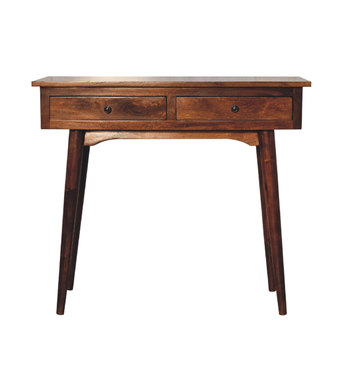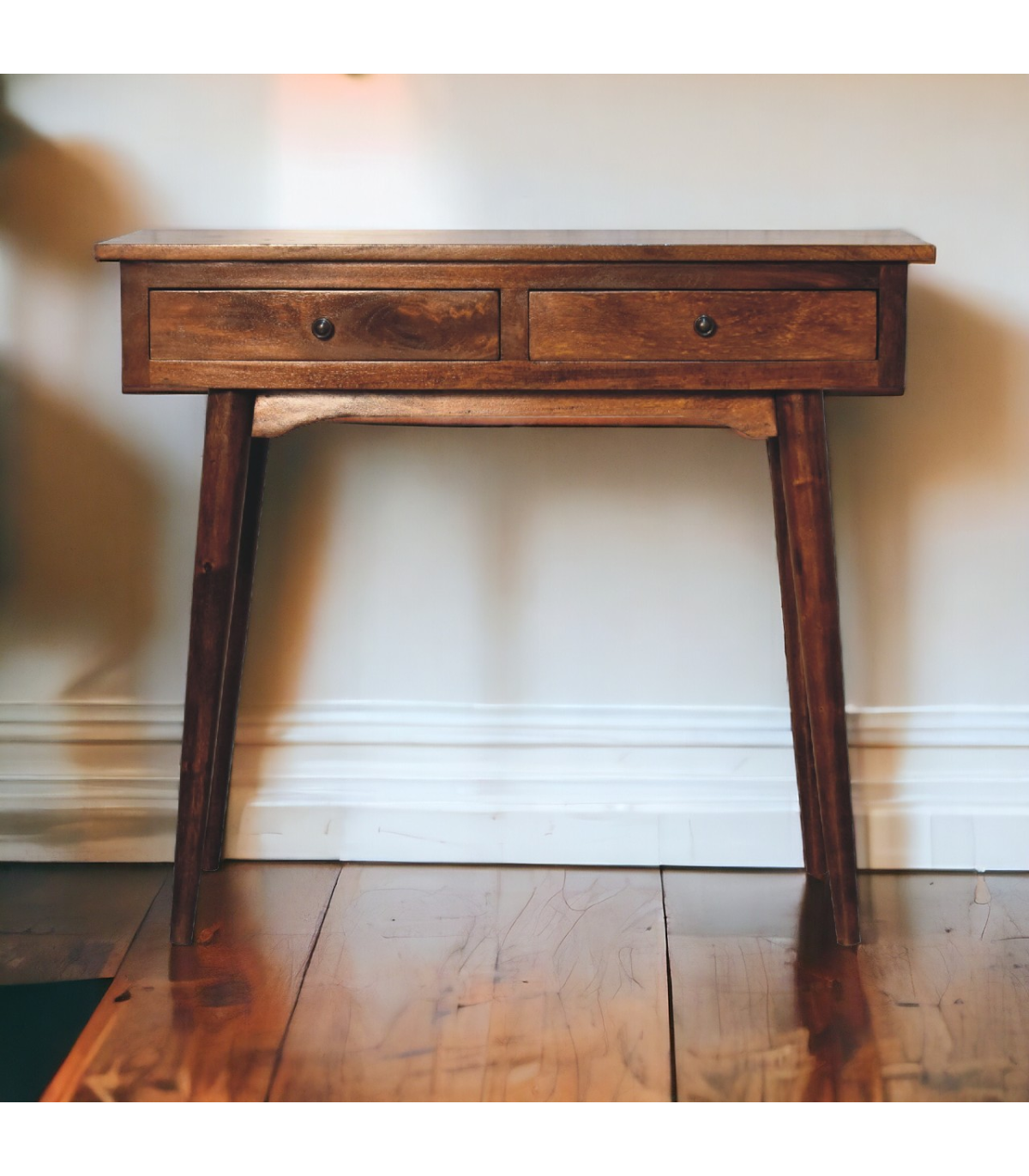 This practical console table offers simple elegance with its clean design and chestnut finish. Built from 100% solid mango wood using sustainably sourced timber, it aligns with eco-conscious interior design. Its Nordic wood-inspired structure includes two drawers, perfect for storing keys, papers, or household necessities. Shiny knobs add a subtle yet sophisticated touch. The minimalist frame makes it easy to incorporate into a wide variety of home d?or styles. Strong, durable, and built to withstand daily use. A great addition to hallways, bedrooms, or living rooms. Its neutral tones pair beautifully with light or bold accents. A timeless, versatile piece that brings order and style.