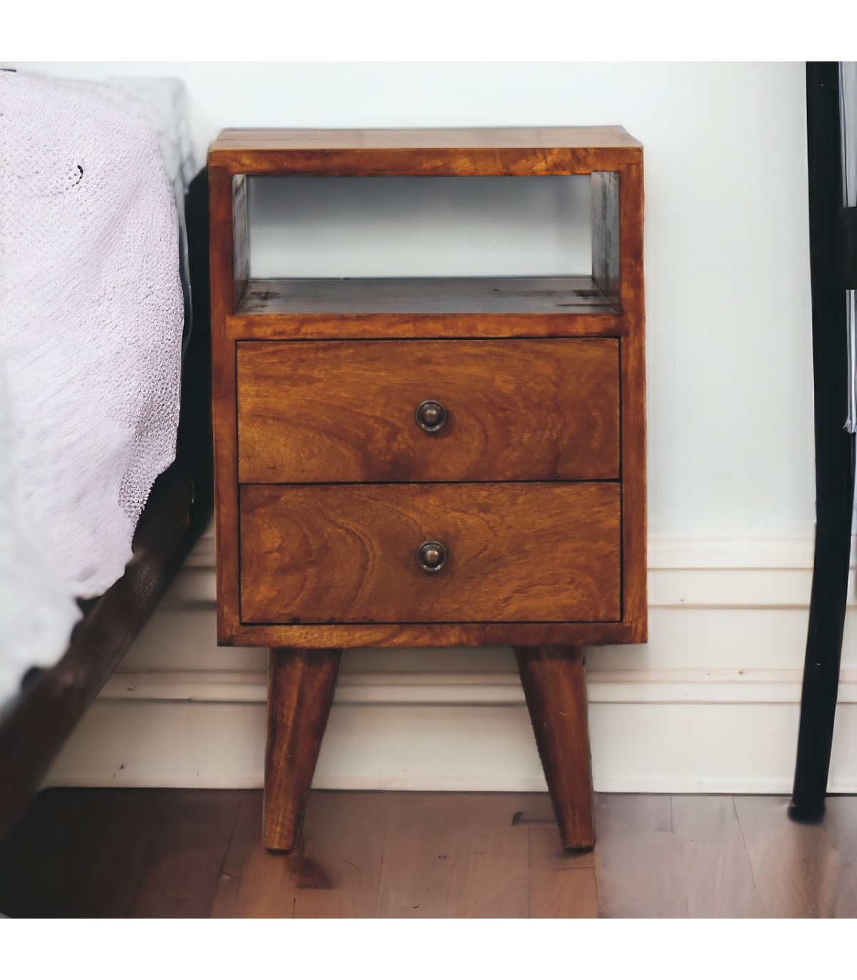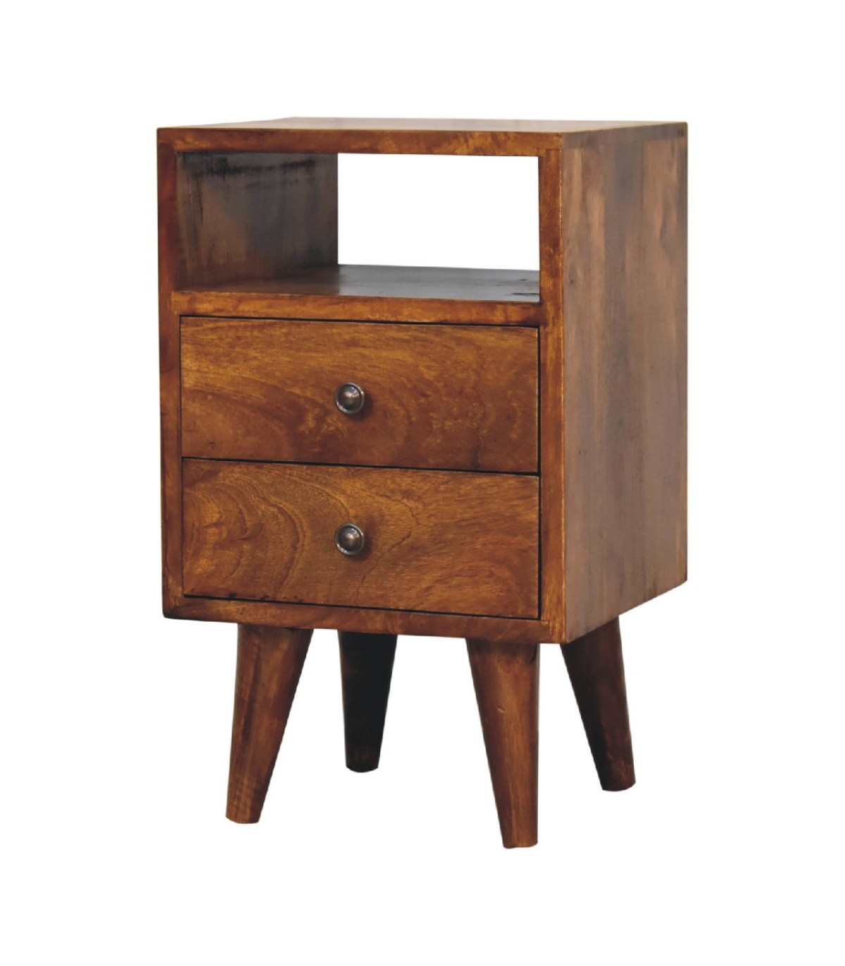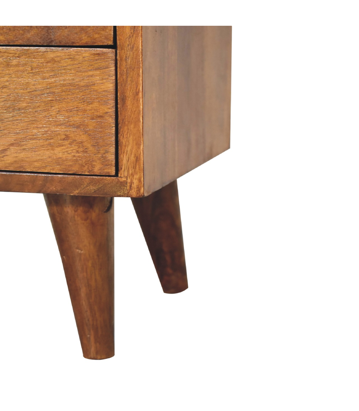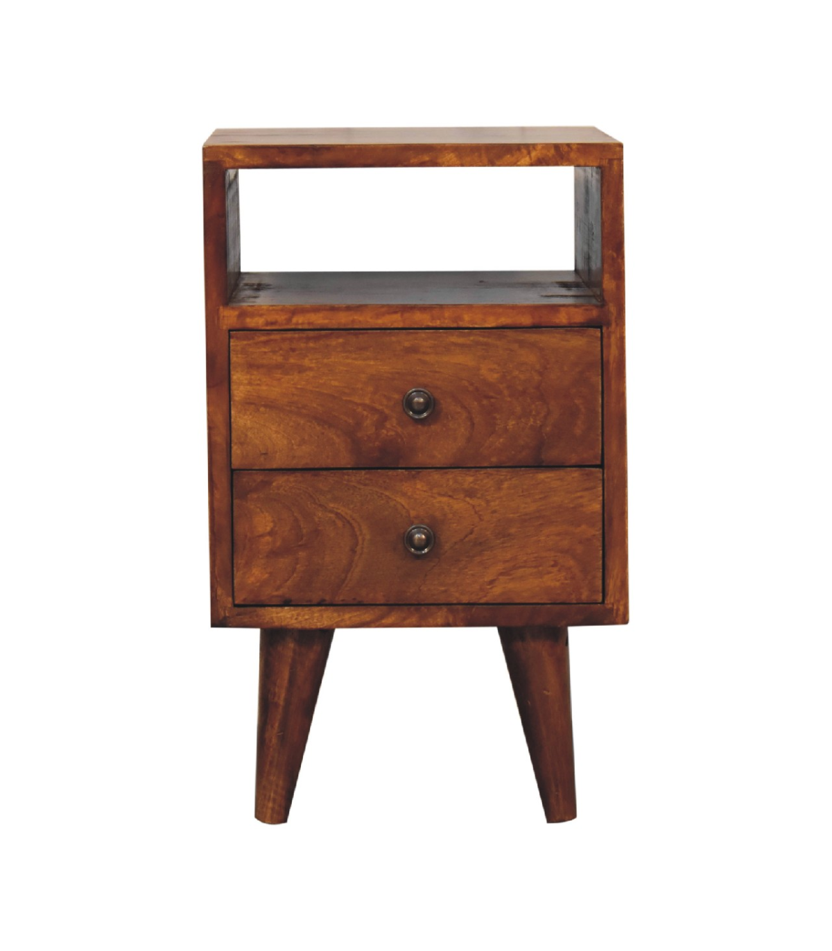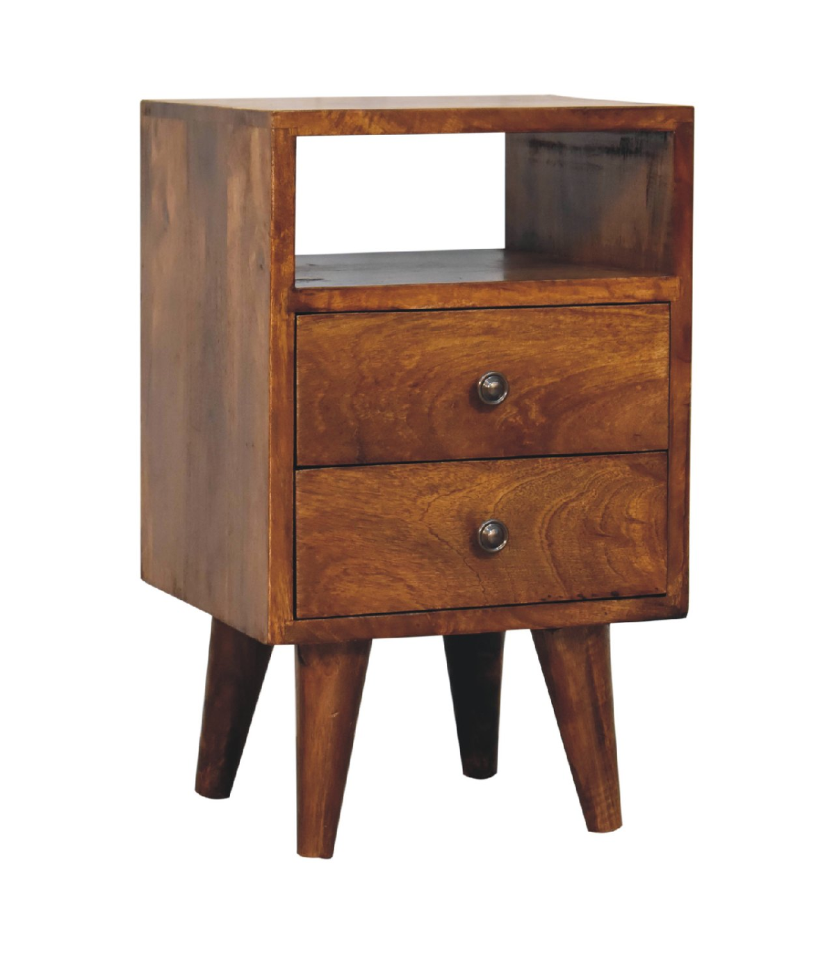 Obtain an effortless fusion of Mid-Century and Deco styles with our Mini Classic Chestnut Bedside. It is constructed from 100% solid mango wood and the sleek design is complemented by shiny brass knobs and nordic style legs. The perfect piece to use alone or pair with different styles and finishes of furniture.