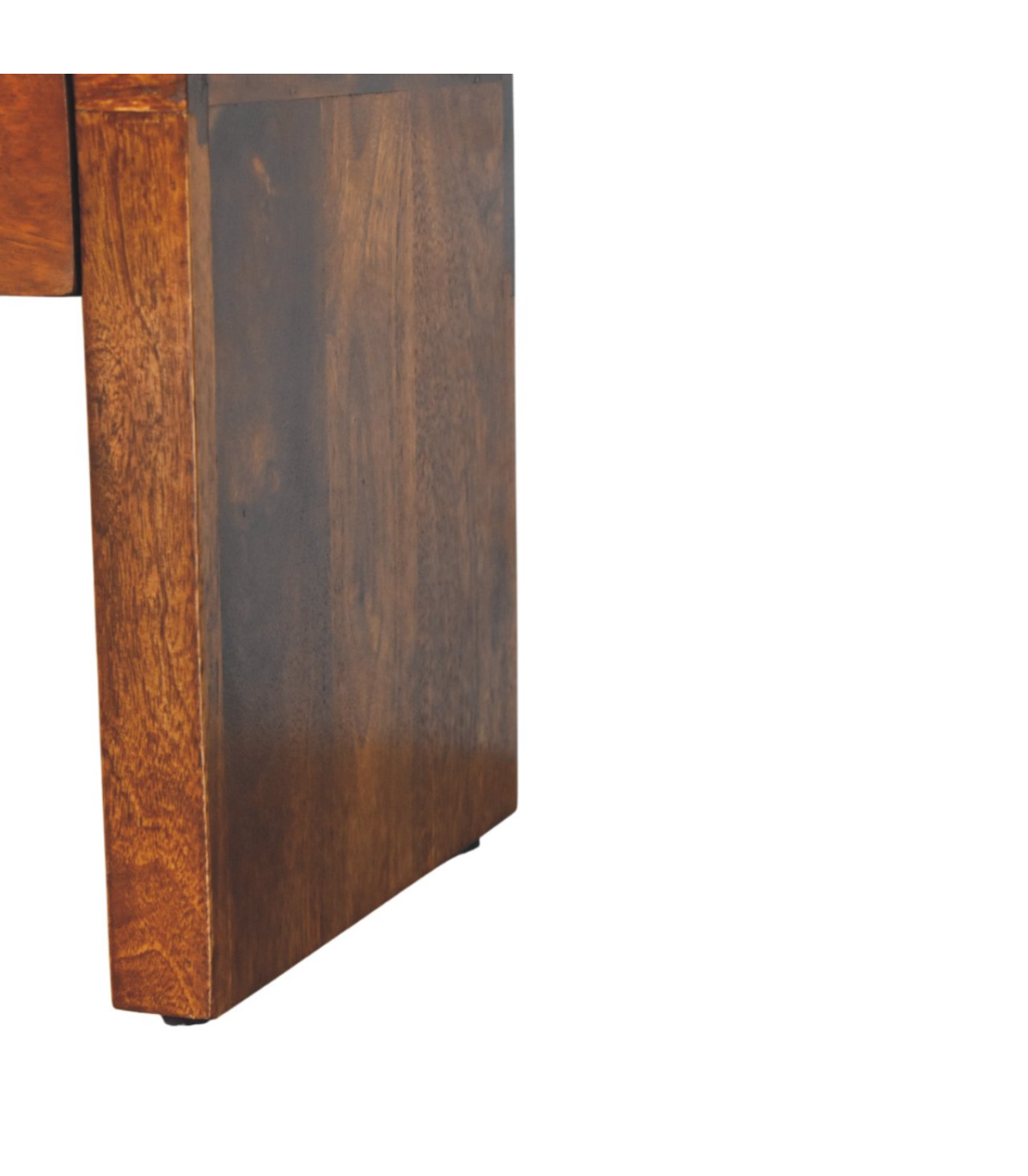 Introducing the Mini Darcy Chestnut Nightstand, a perfect blend of modern elegance and practicality. Handcrafted from 100% solid mango wood in a warm Chestnut finish, this nightstand is designed with softly curved edges that exude a sleek, contemporary charm. Featuring a single drawer with a brass knob, it provides convenient storage while maintaining a clean and minimalist aesthetic. Its compact size and refined silhouette make it versatile for bedrooms, living spaces, or as a decorative accent. The Mini Darcy Chestnut Nightstand combines timeless design with functionality, adding warmth and sophistication to any interior.