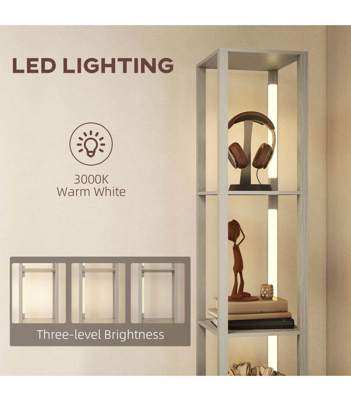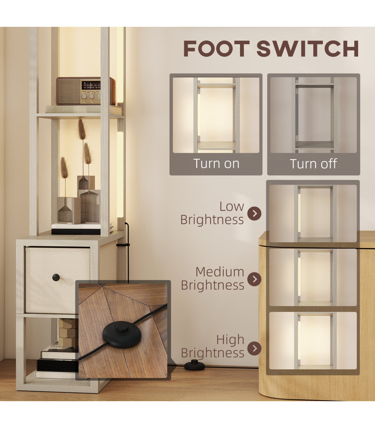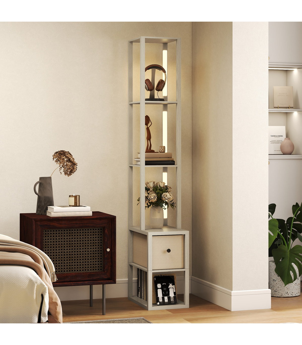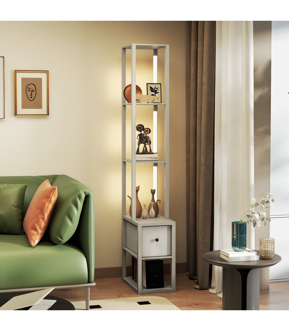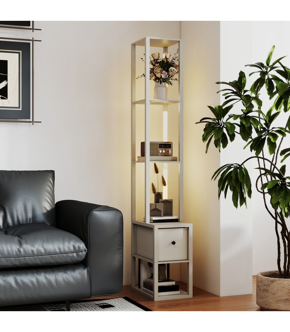 - 3-in-1 floor lamp integrates lighting, storage and display