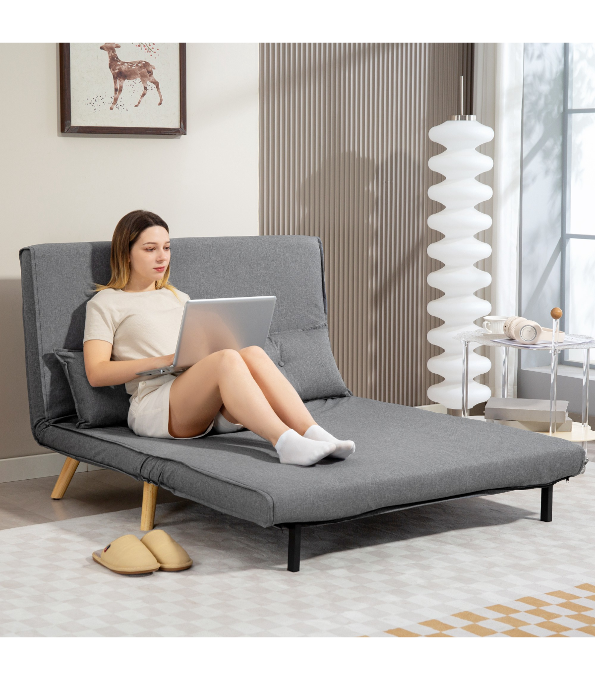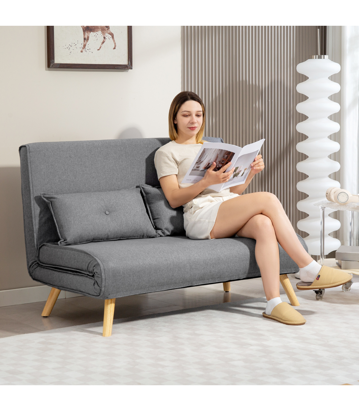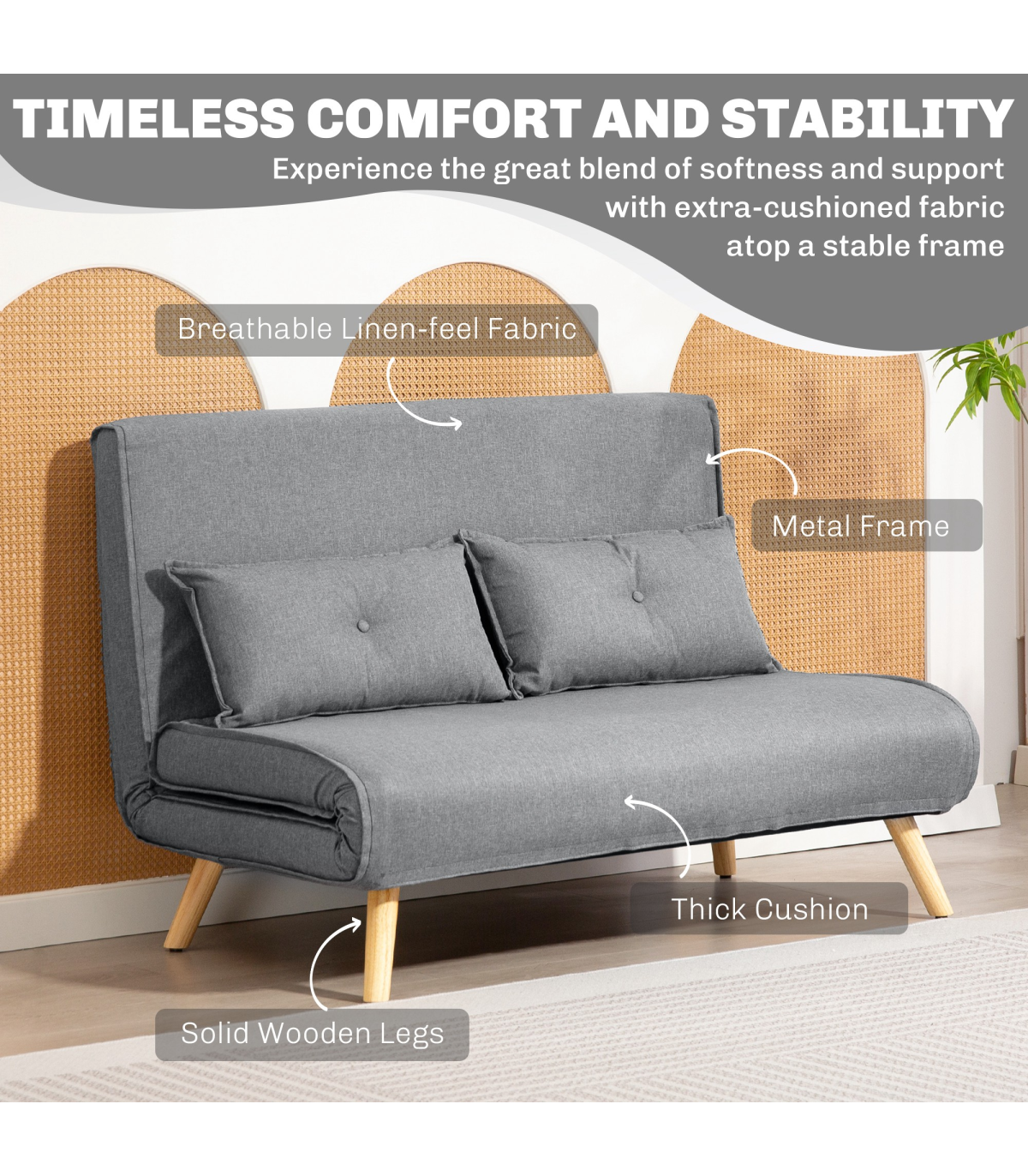 - Material: Linen (100% Polyester), Foam, Metal, Solid Wood