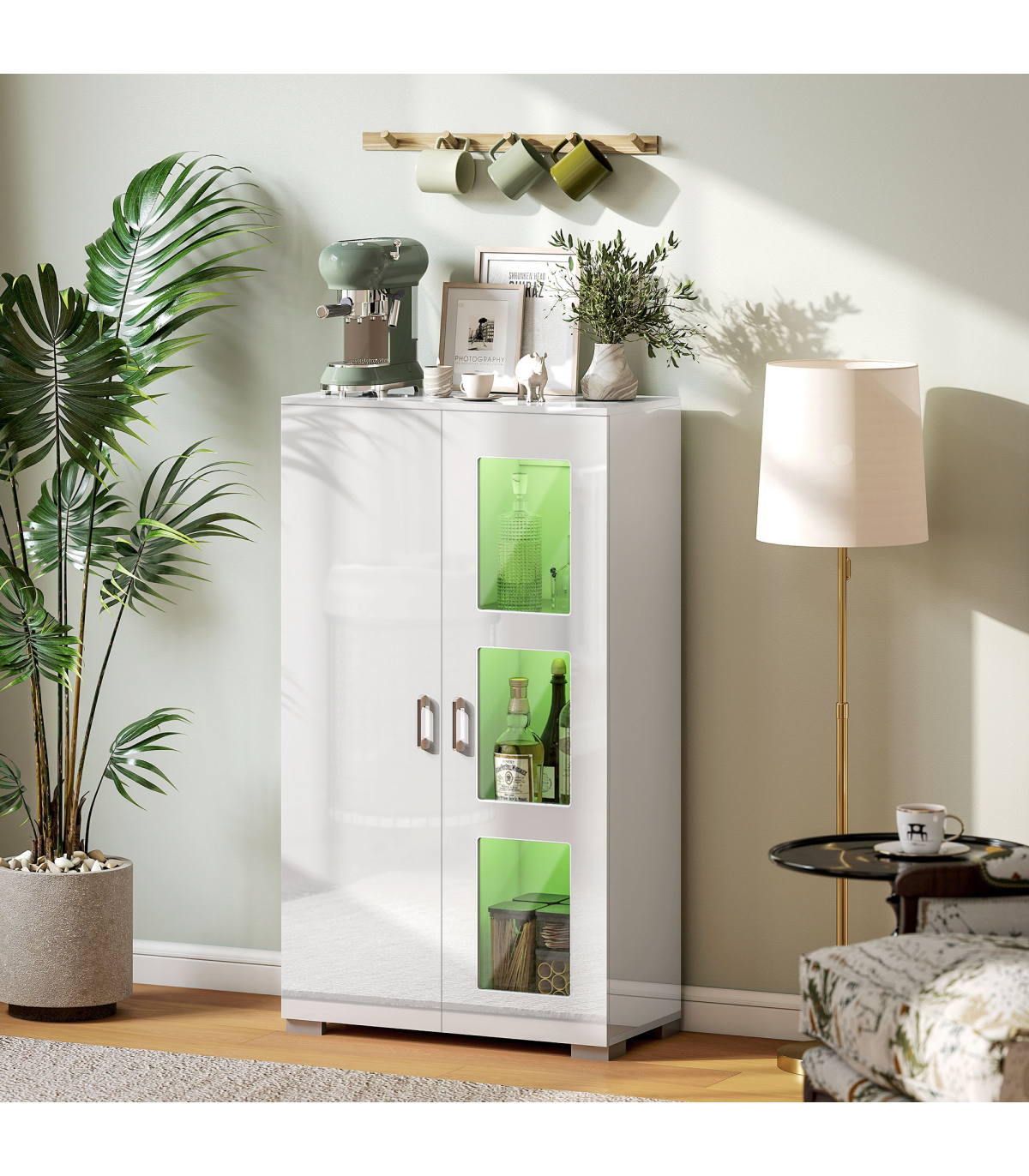 - Modern high-gloss finish and glass doors elevate your living room decor